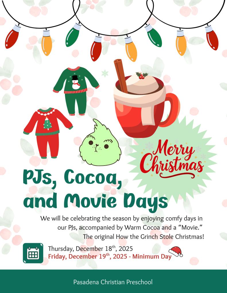 Please send your child to school dressed in festive, comfortable pajamas and ready for hot chocolate, Christmas movies, and more!