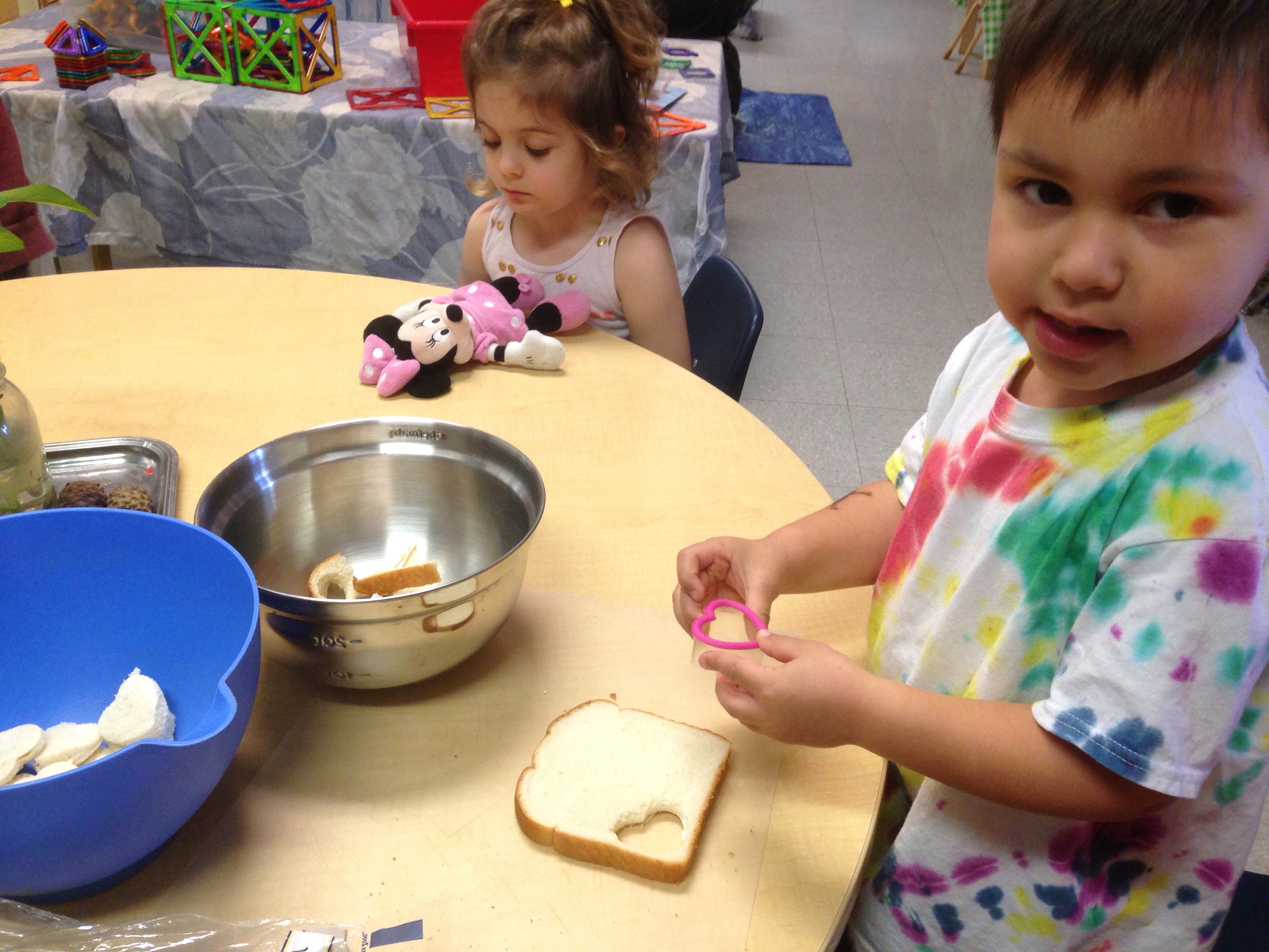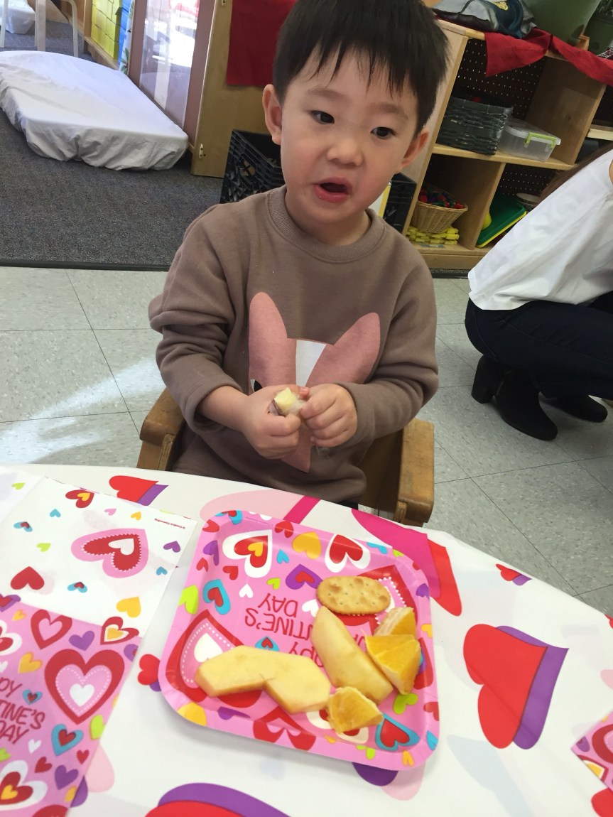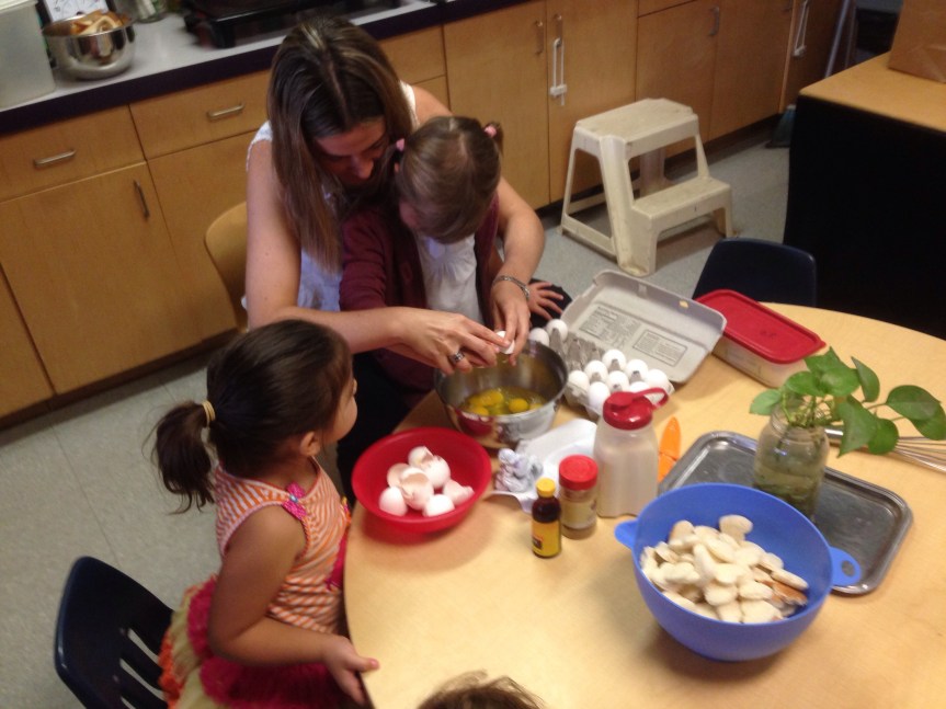 We’ve been having a wonderful time celebrating Valentine’s Day in Room 3. We’ve made treat bags, decorated hearts of all sizes, learned songs about love such as “Skidamarink” and “G.O.D. is L.O.V.E,” read several Valentines themed books, shared about who we love, and today we made mini heart shaped French toast with strawberry sauce. The kids had a great time punching out the hearts from the bread, while snacking on the pieces that we weren’t using, plus creating the egg, vanilla, and cinnamon custard to dip the bread in. We would like to give a special thanks to Ms. Lucia, Jacinta’s mom, for helping us out and being our master chef/cook. The project was enjoyably scrumptious.