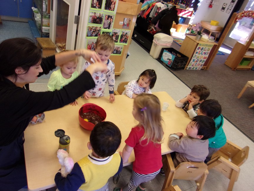 Last week in Room 5 we baked chocolate chip cupcakes. While our activity began as an extension of the new “bakery” dramatic play center we installed, it was also meant as a real-world experience to put the early math and literacy foundations they learn each day into some very productive practice!