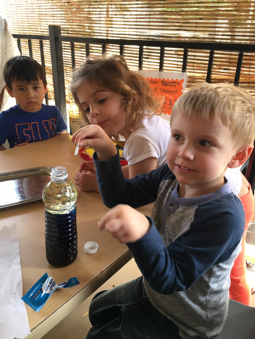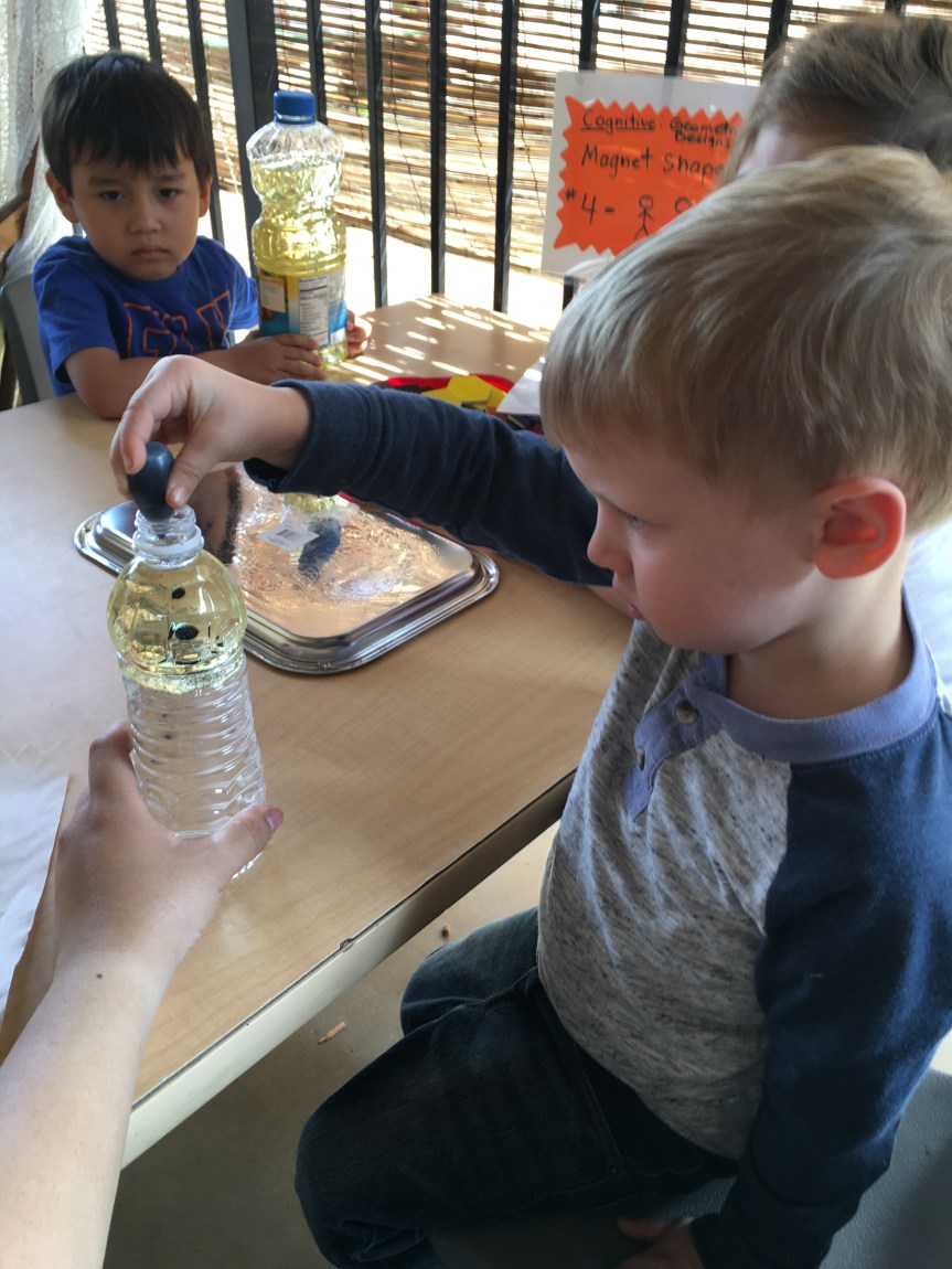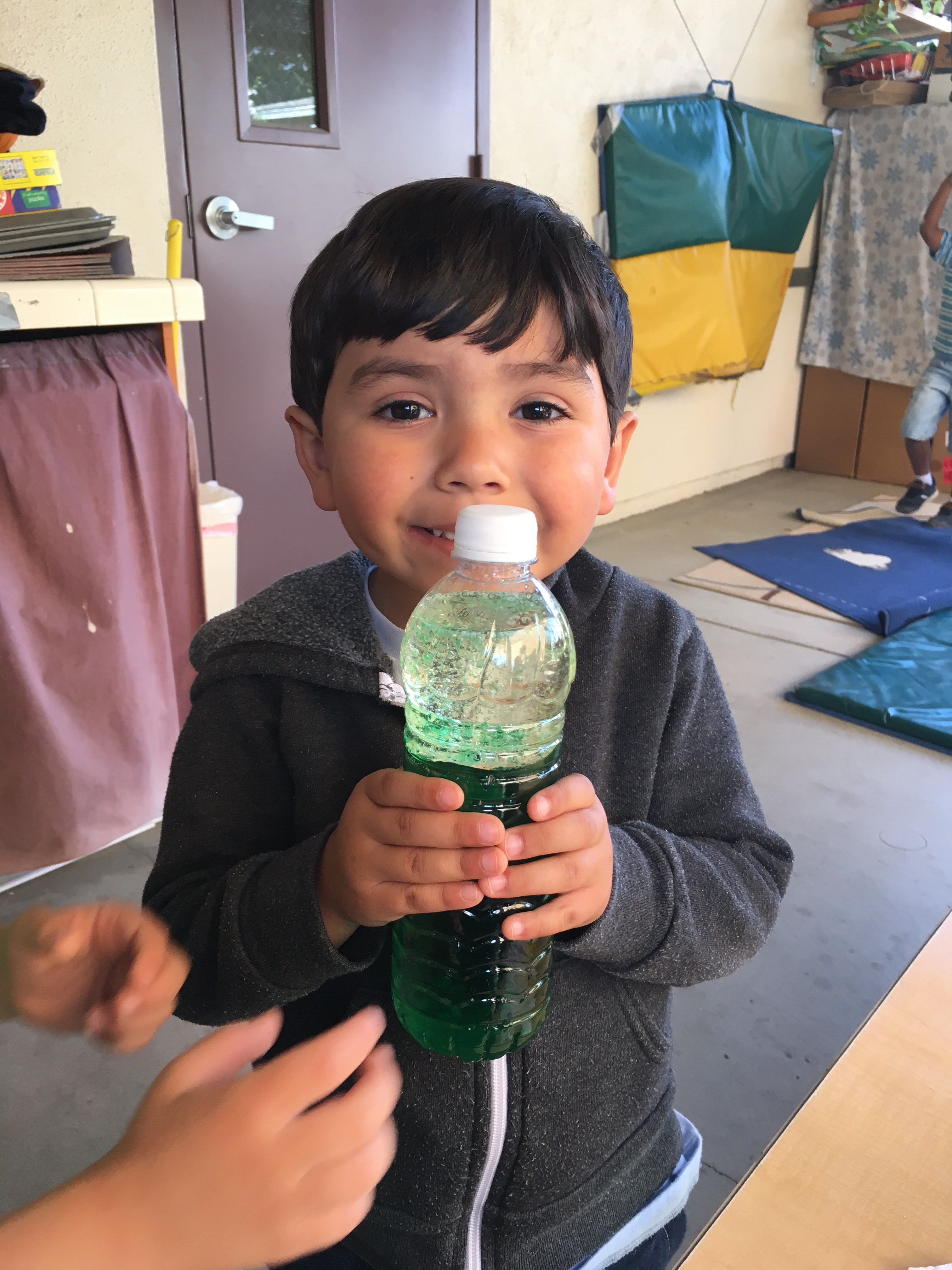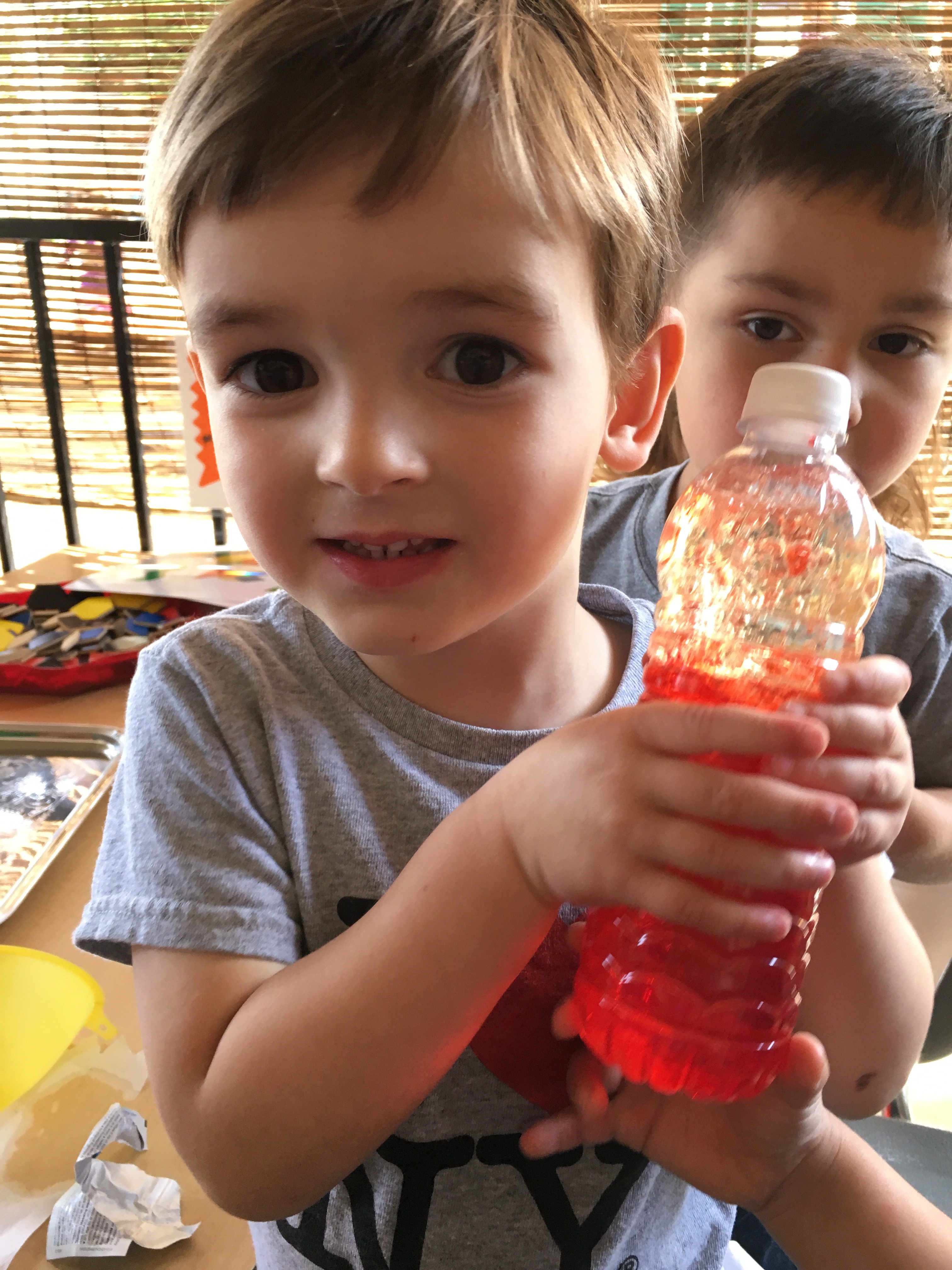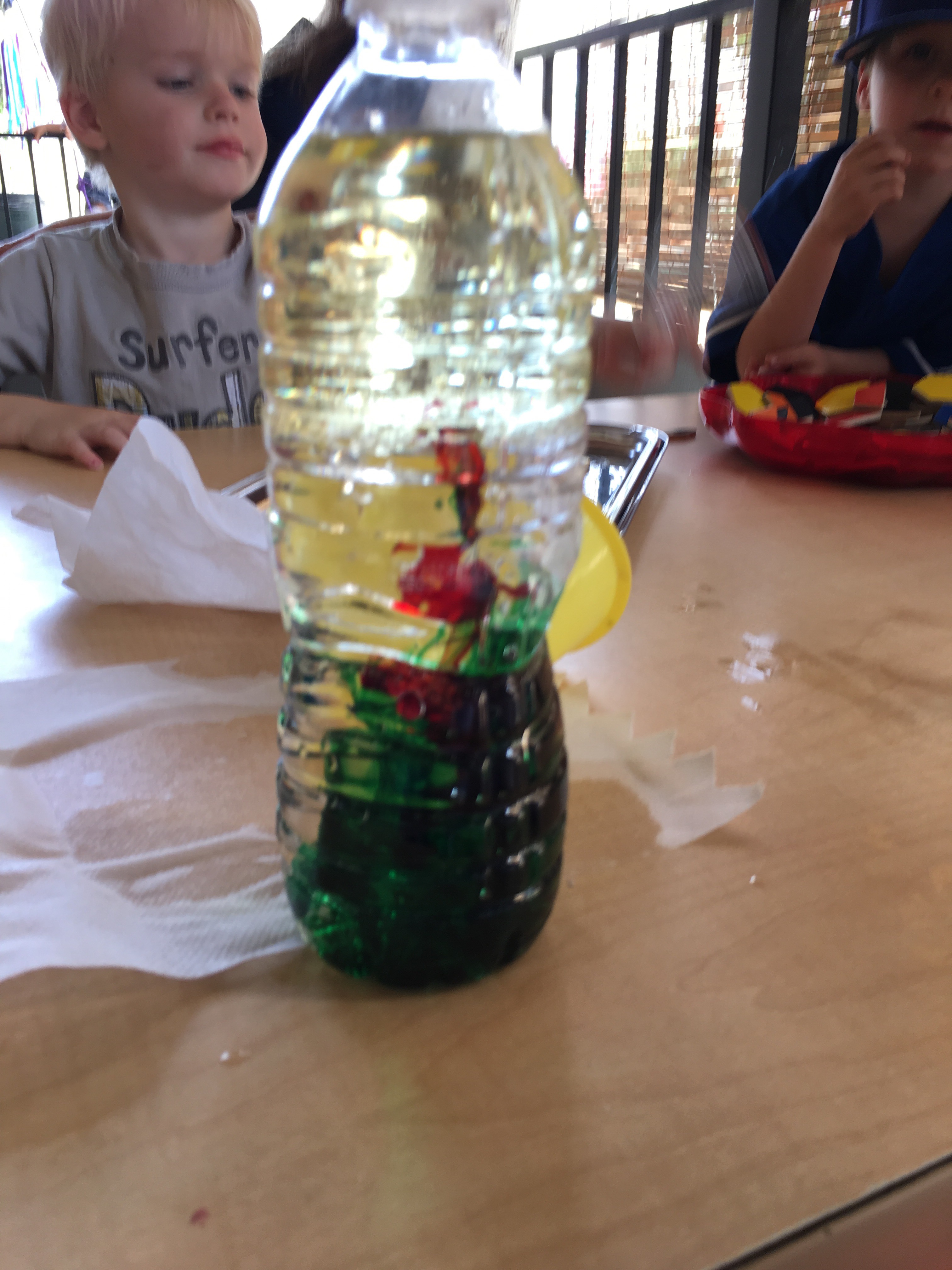 It’s a wonder what you can do with some recyclable water bottles, oil, food coloring, water and Alka-Seltzer. The children from Room 3 had an opportunity to satisfy their curiosity by finding out what happens when you add alka-seltzer to a bottle filled with liquids and coloring. Expectations ranged from, “It’s going to explode!” to “Nothing is going to happen.” Despite the differences in their hypotheses, one thing was certain, they all loved the result!