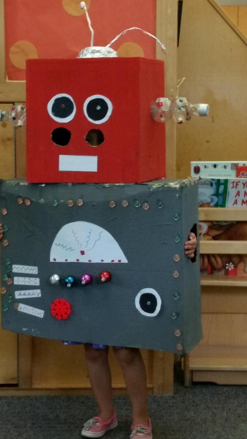 The children used boxes to create their own robot costume. They first made blueprint designs of what they wanted the robot to look like.