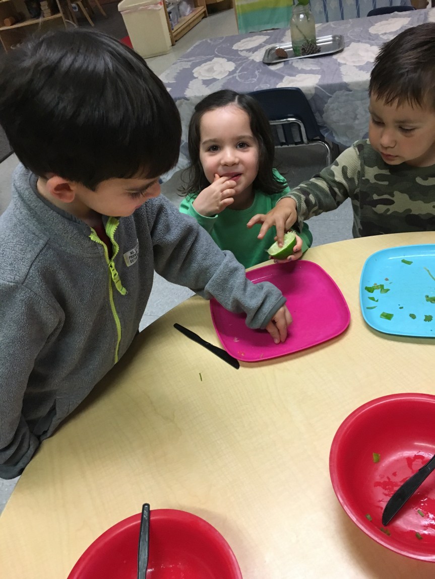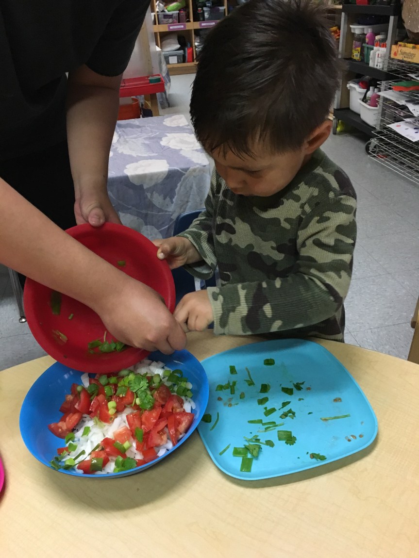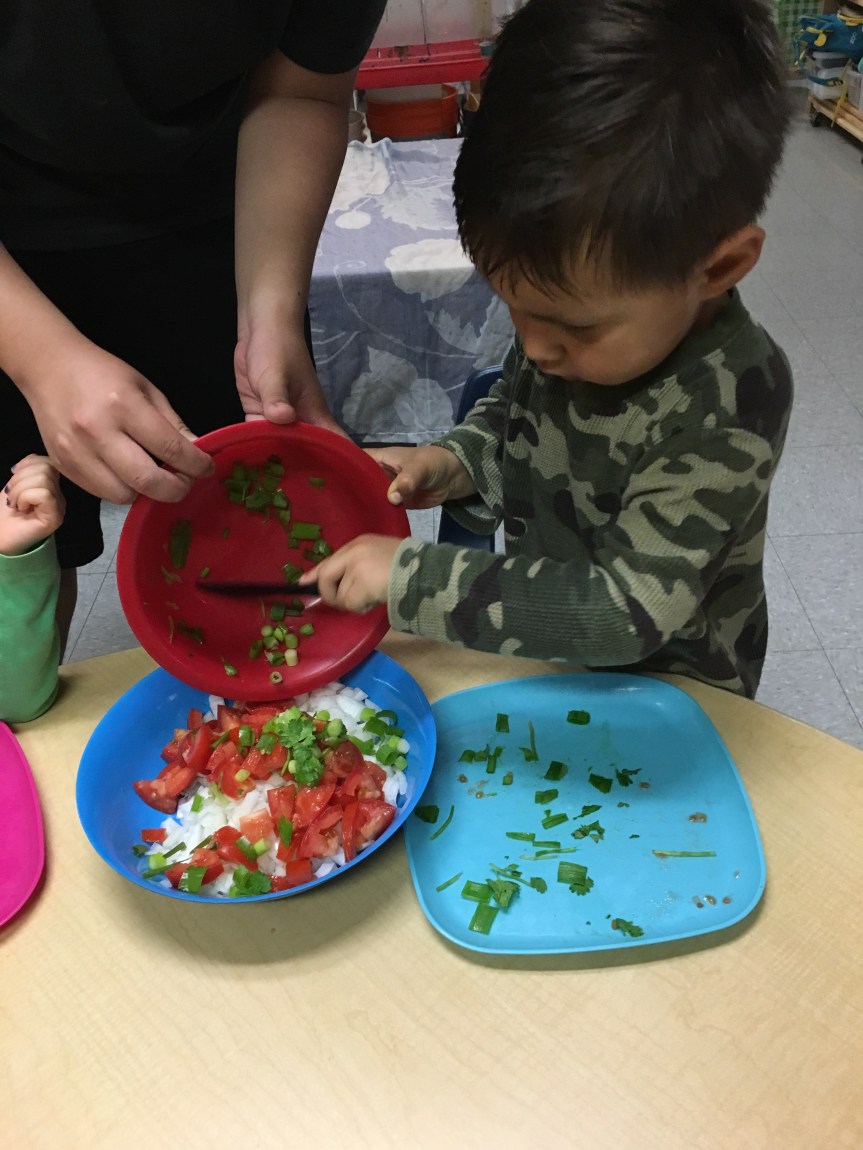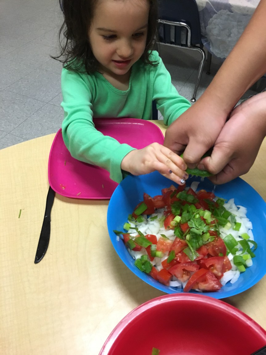 The children in Room 3 had an awesome time making a not-so-spicy dish. What is it you ask? It’s none other than Pico De Gallo! Ingredients were chopped, diced, sliced, squeezed, measured and poured. Some of the children even had a chance to taste limes! The children unleashed their inner Iron Chef and created a dish that appealed to the palates of children and teachers alike.