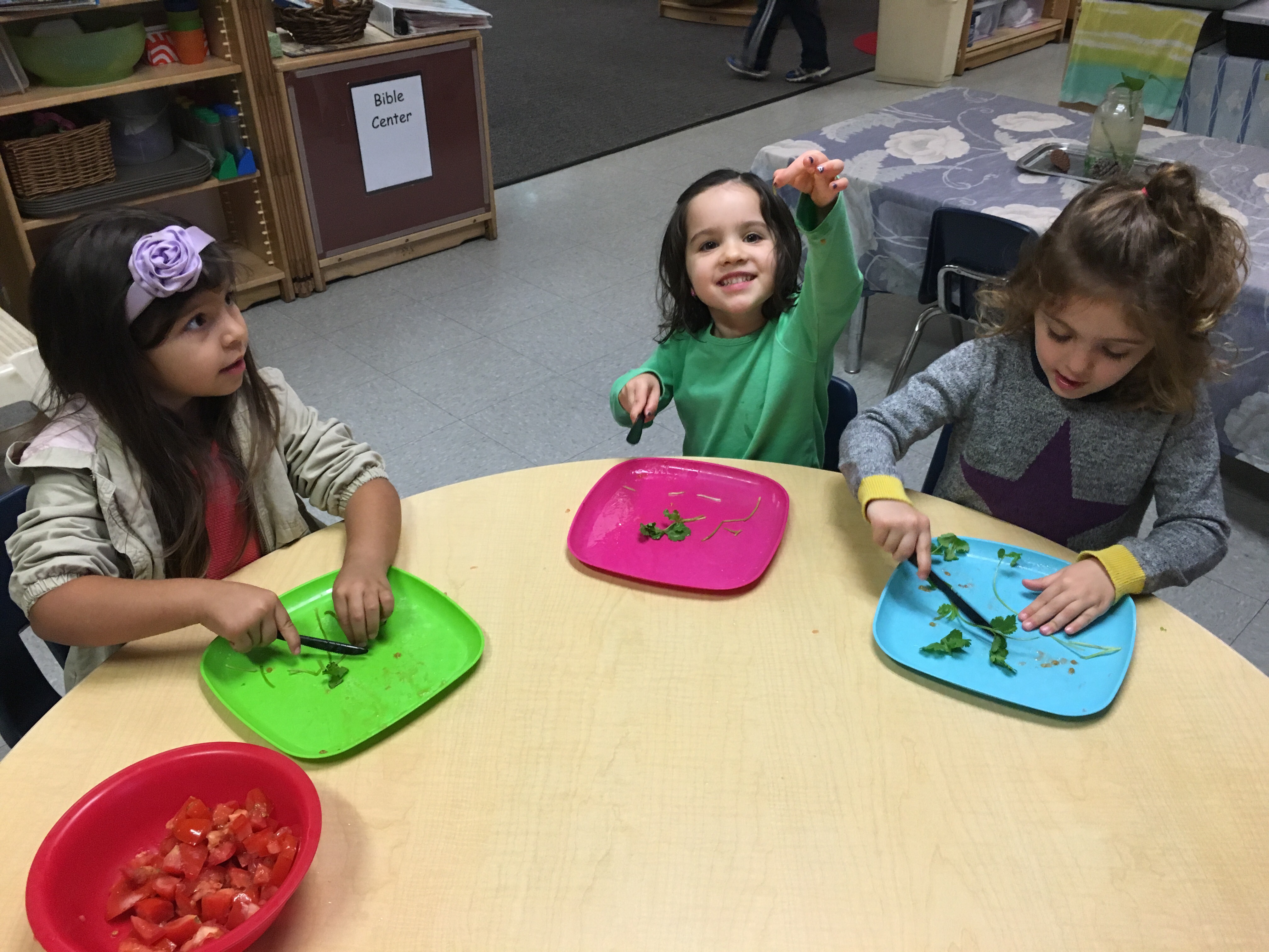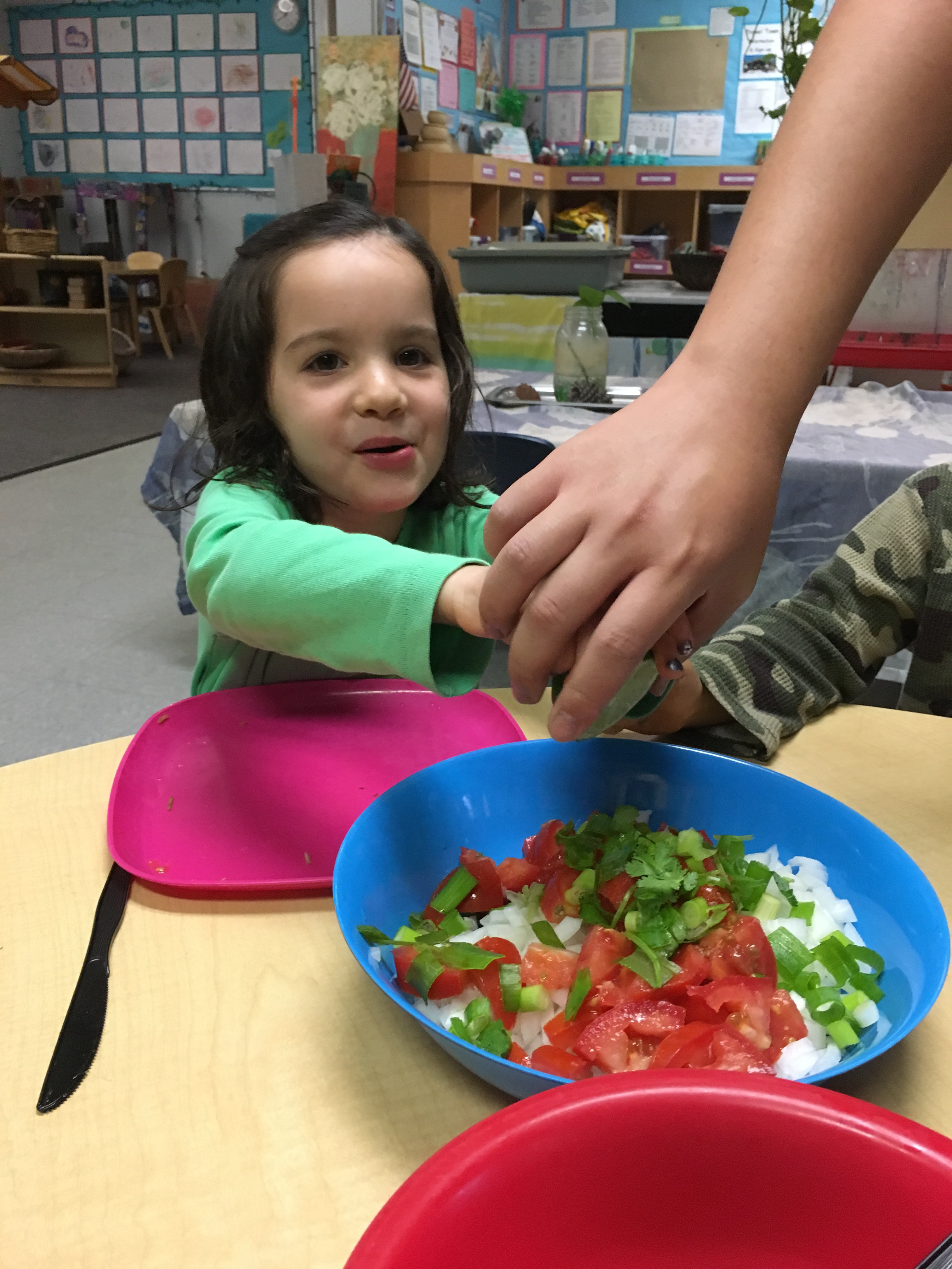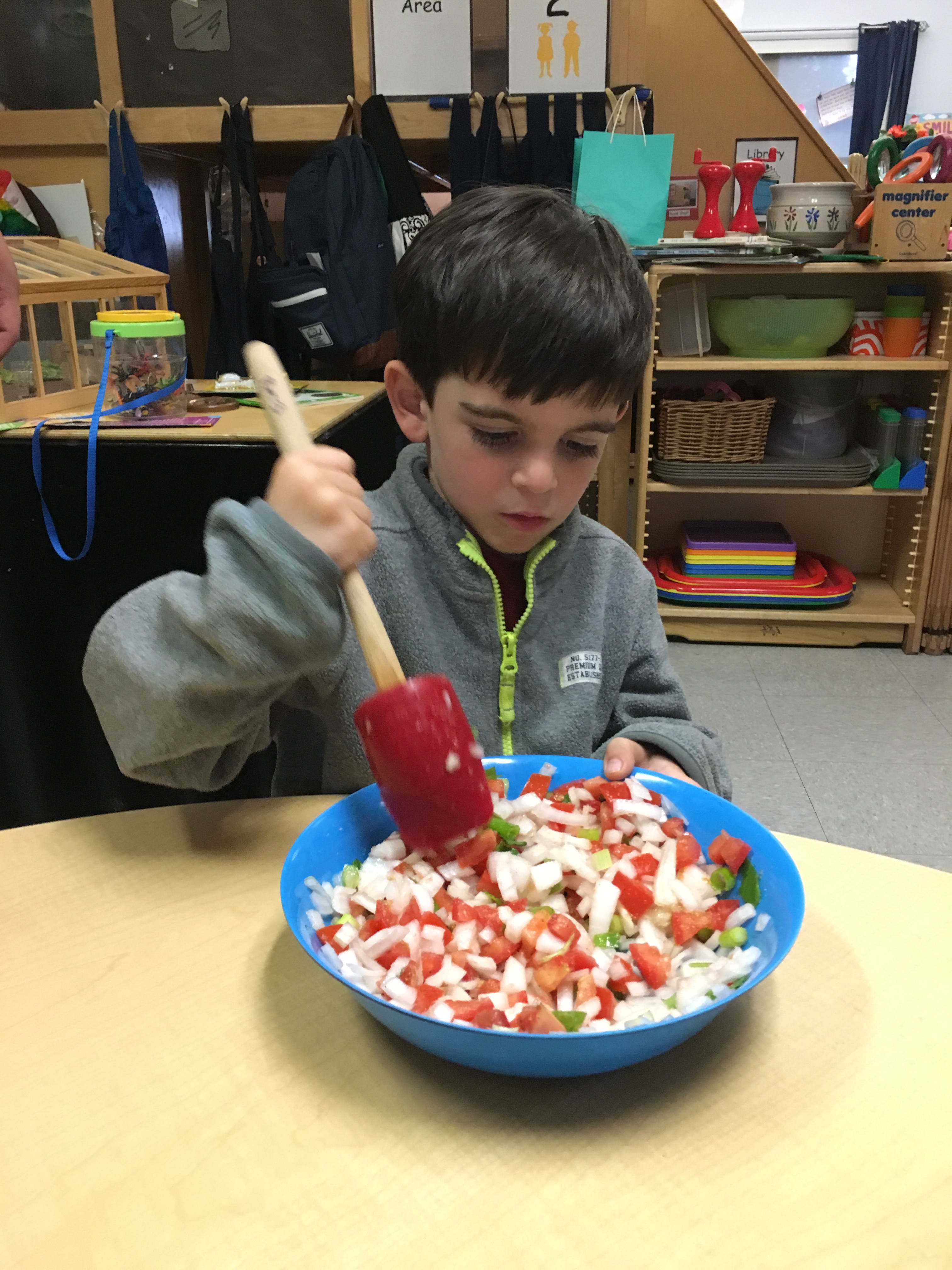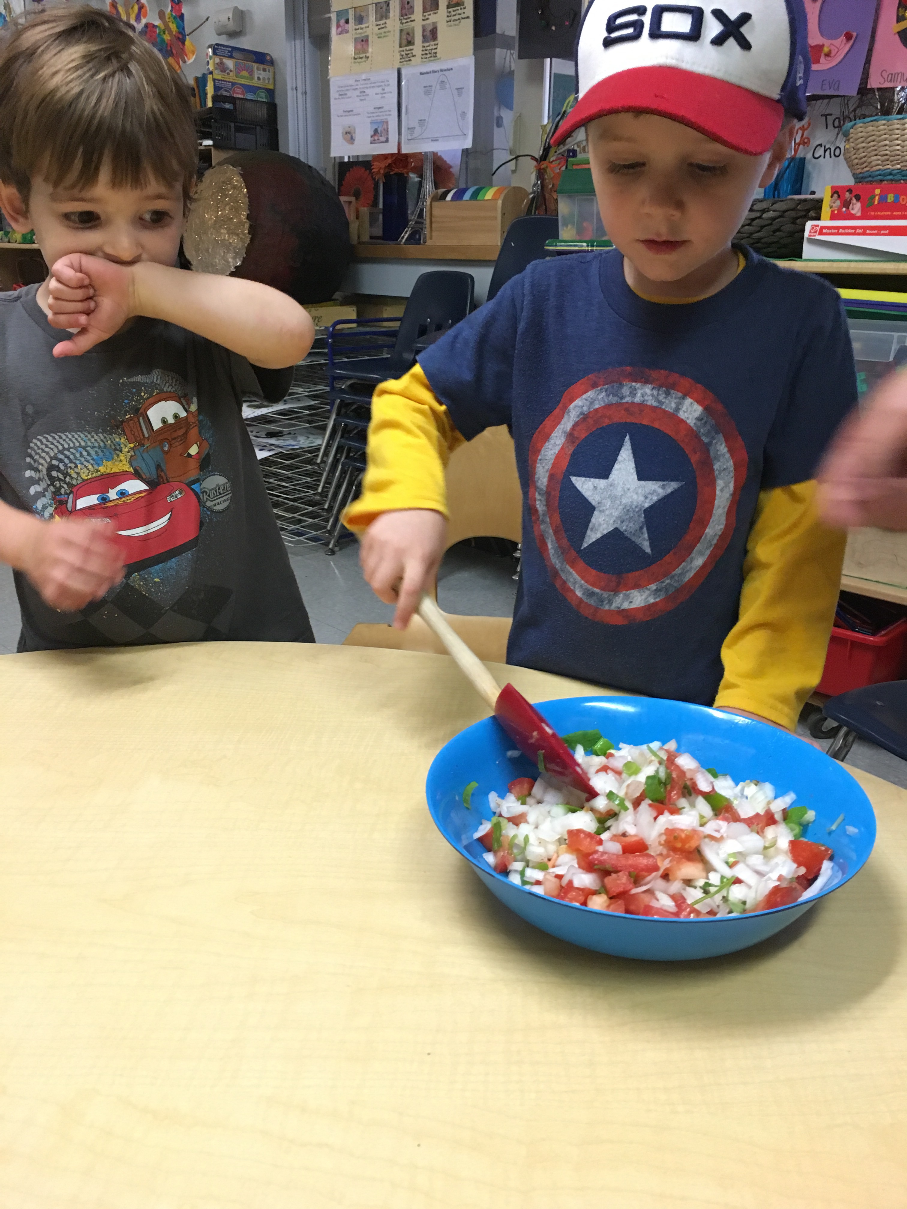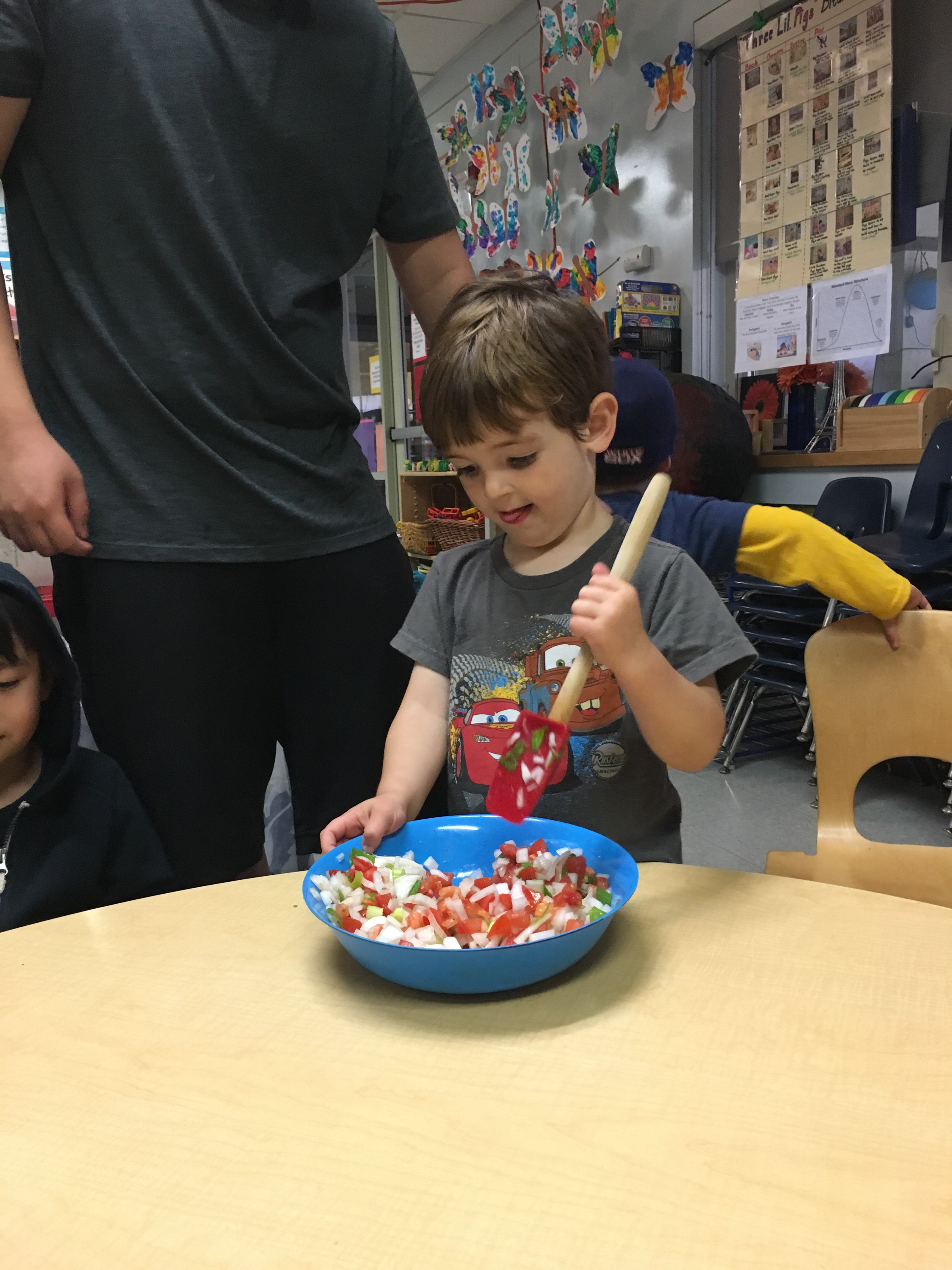 The children in Room 3 had an awesome time making a not-so-spicy dish. What is it you ask? It’s none other than Pico De Gallo! Ingredients were chopped, diced, sliced, squeezed, measured and poured. Some of the children even had a chance to taste limes! The children unleashed their inner Iron Chef and created a dish that appealed to the palates of children and teachers alike.