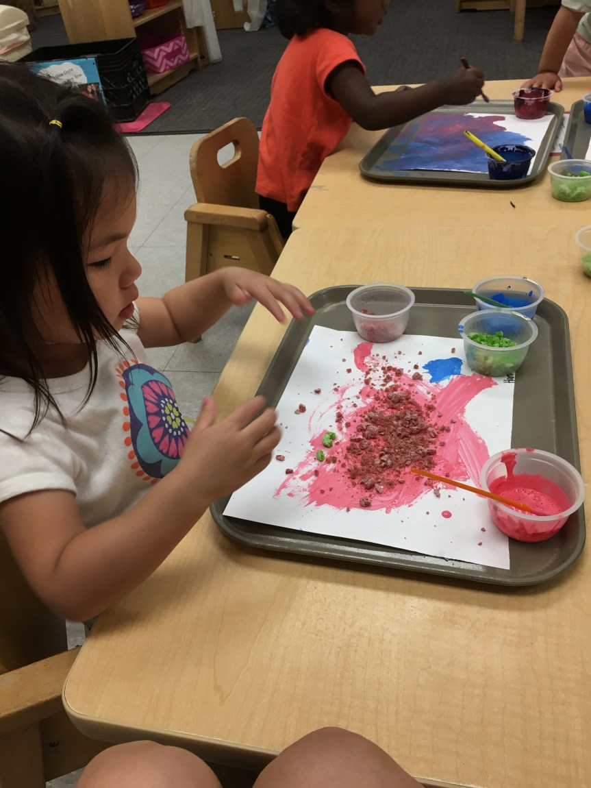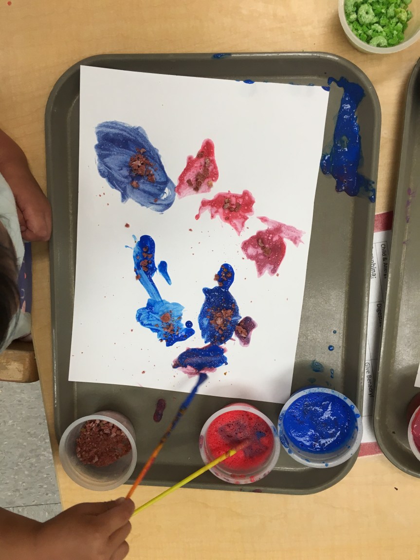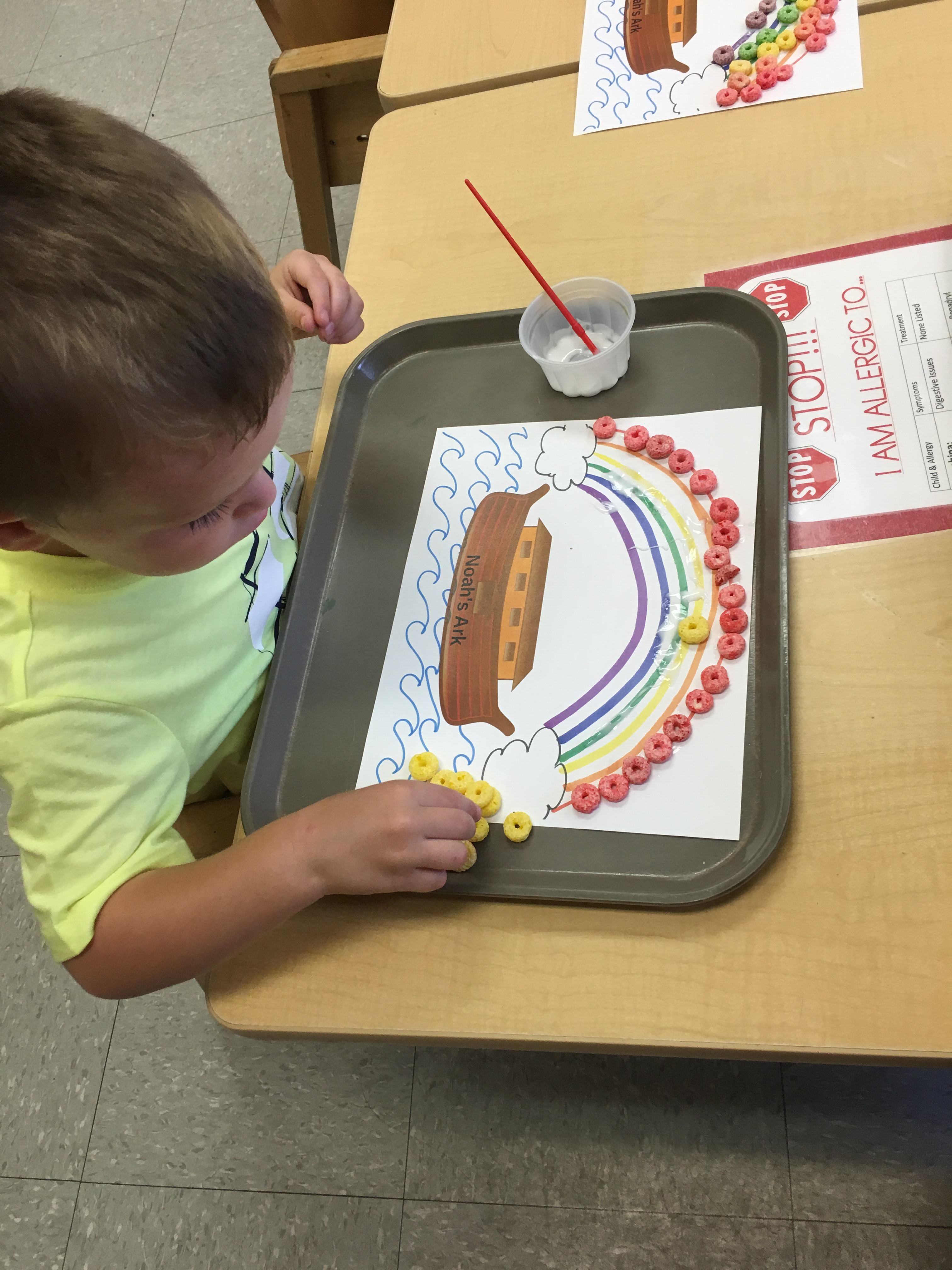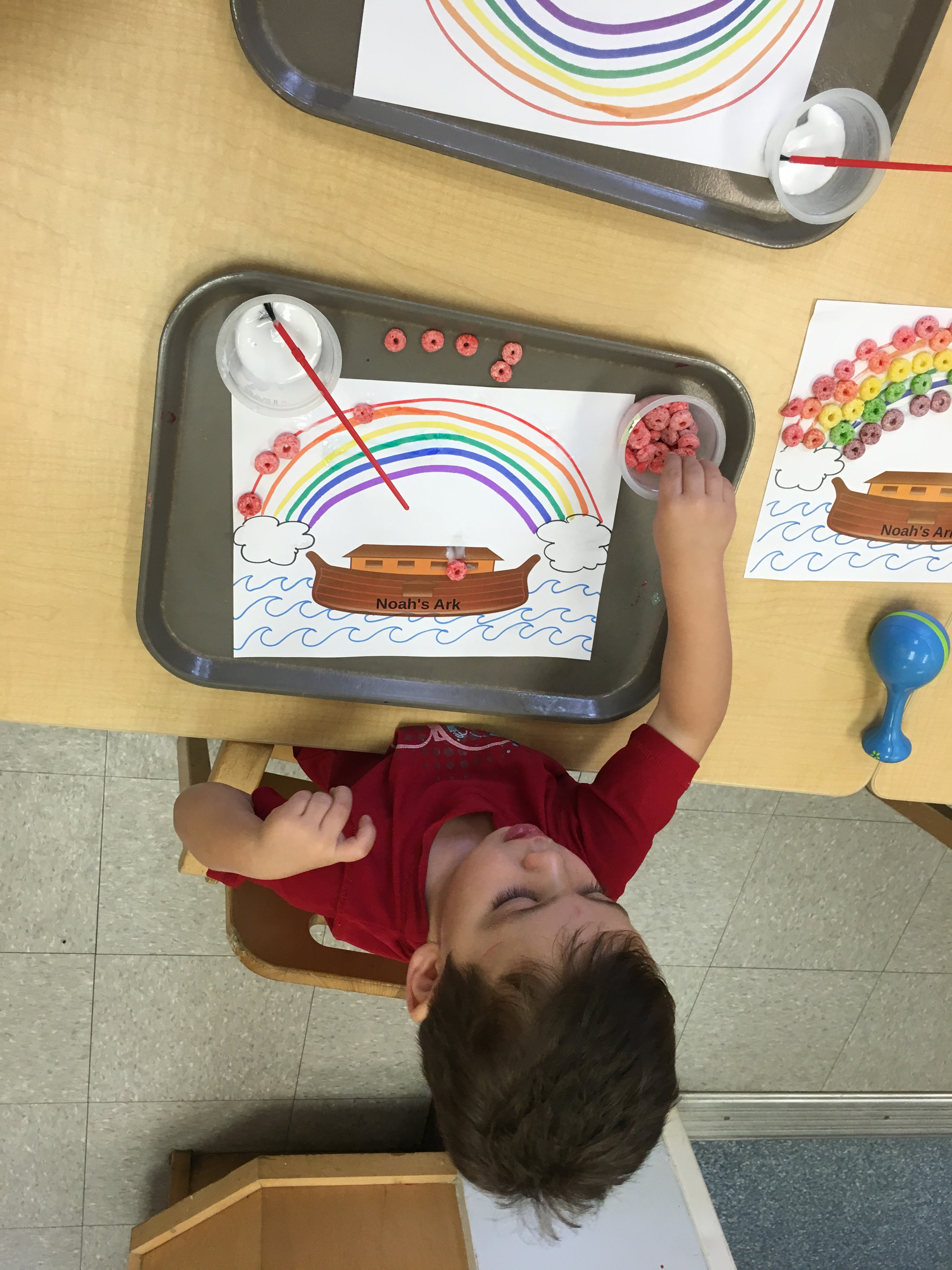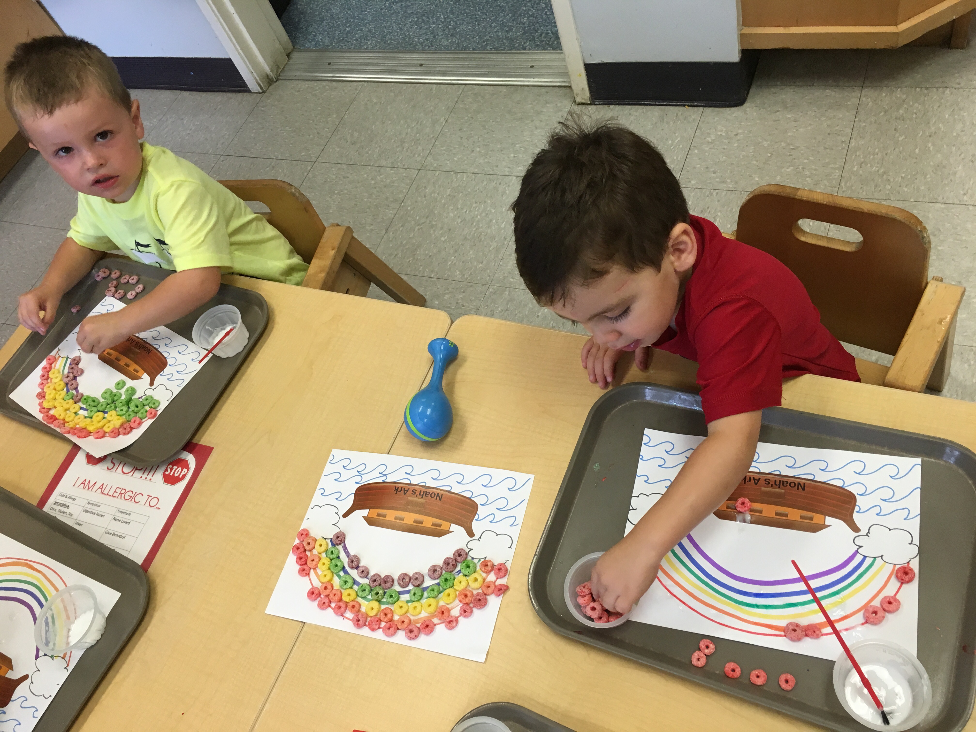 We got creative using math and color matching to glue fruit loops onto the corresponding rainbow lines as we recalled the story of Noah’s Ark. We had our very own cardboard Ark in the dramatic play center stocked with plush animals two by two! Some of our friends got creative with the leftover fruit loops and made cereal smash art!