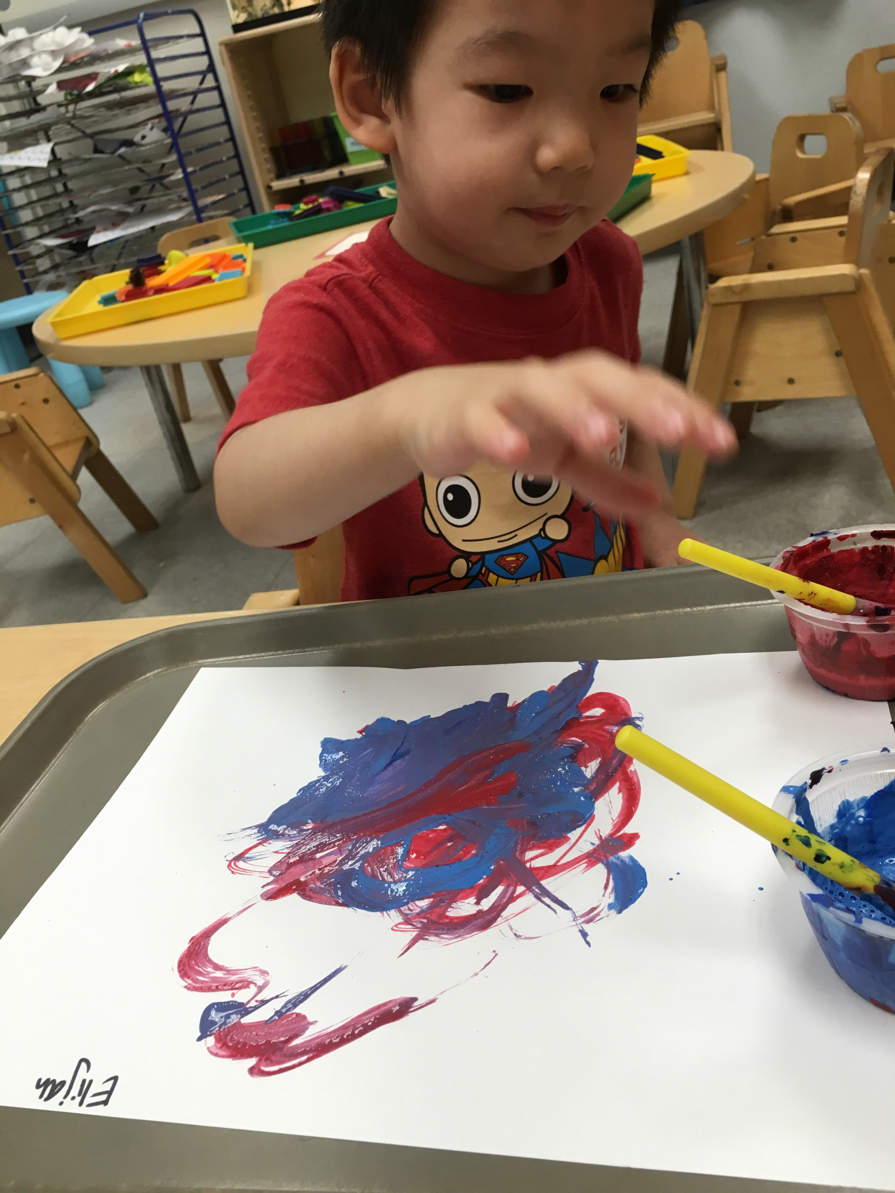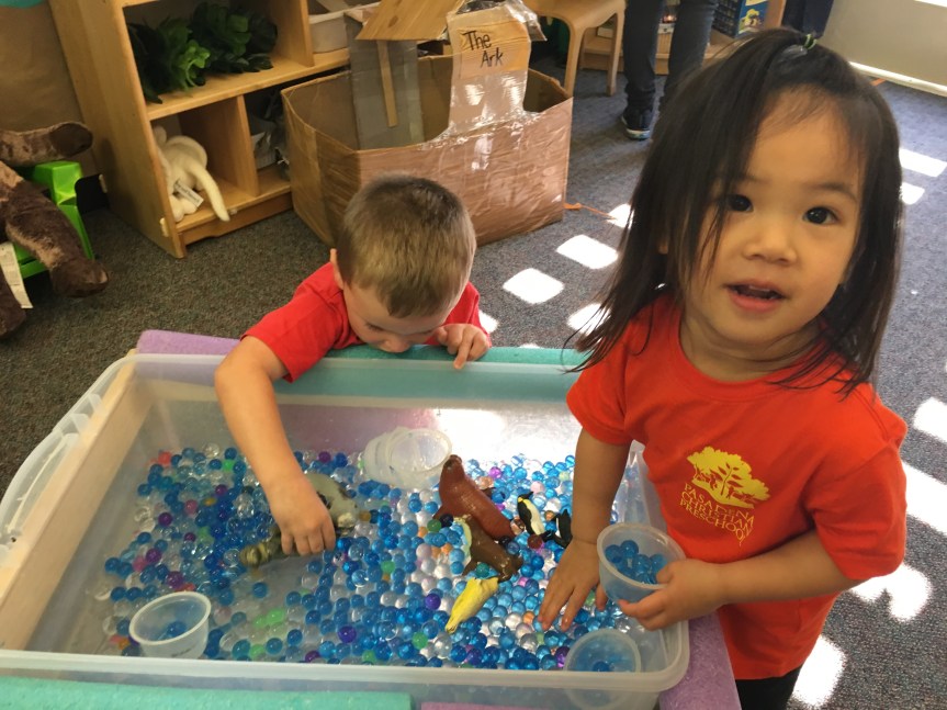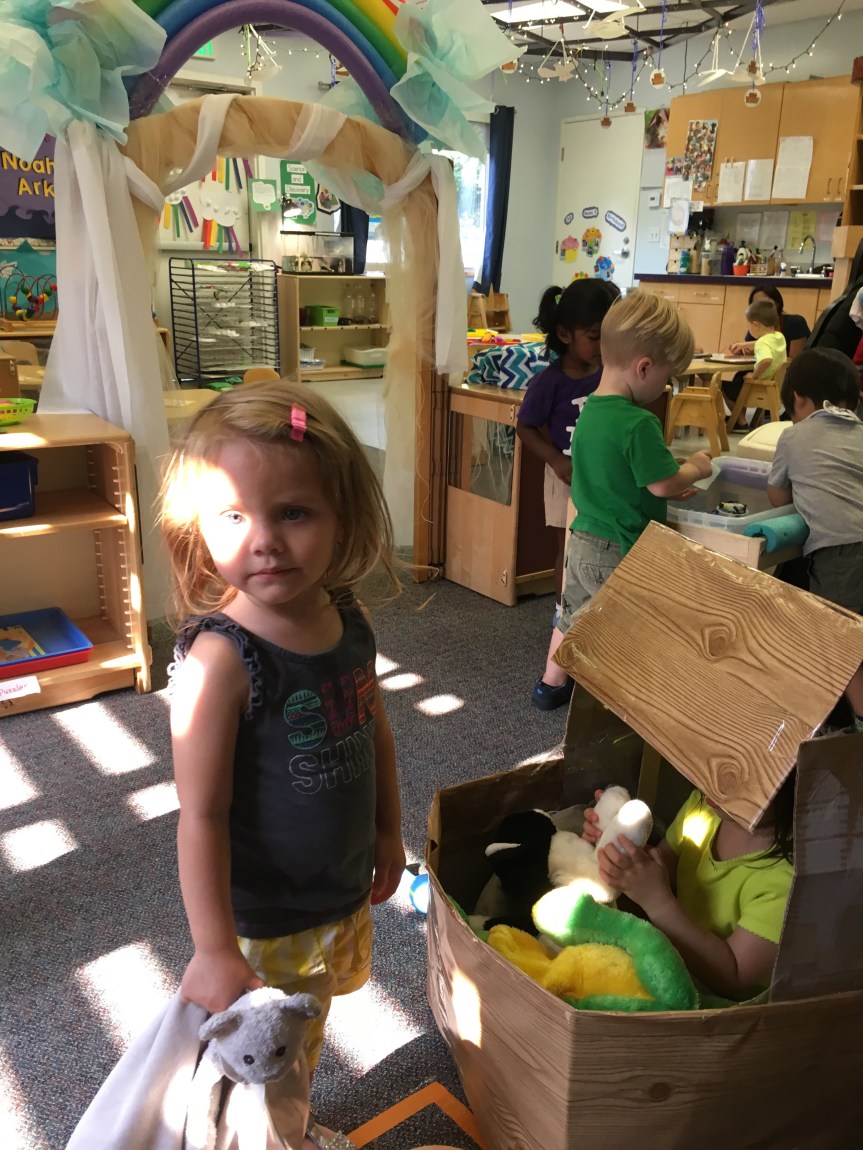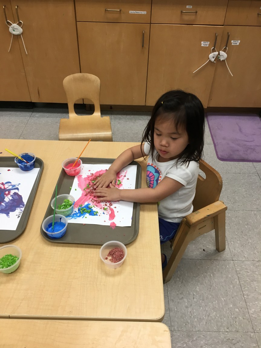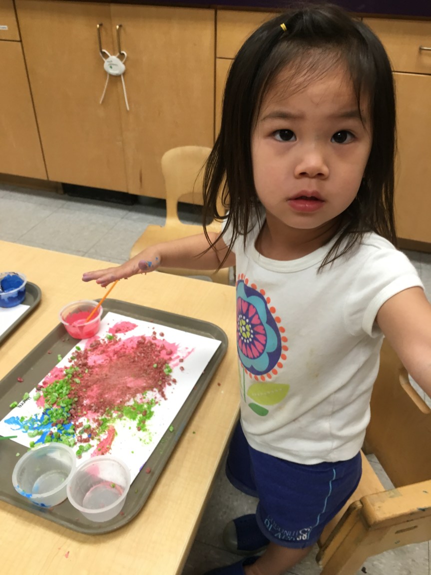 We got creative using math and color matching to glue fruit loops onto the corresponding rainbow lines as we recalled the story of Noah’s Ark. We had our very own cardboard Ark in the dramatic play center stocked with plush animals two by two! Some of our friends got creative with the leftover fruit loops and made cereal smash art!
