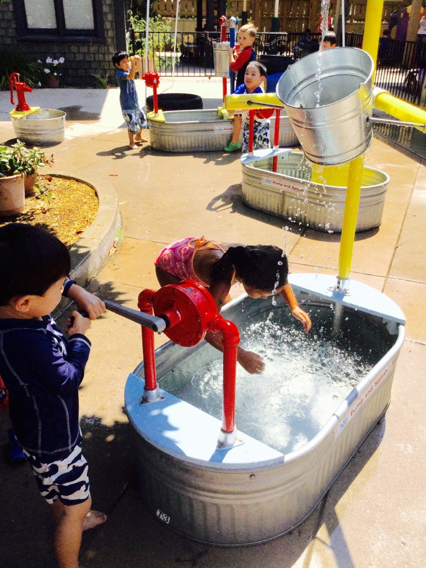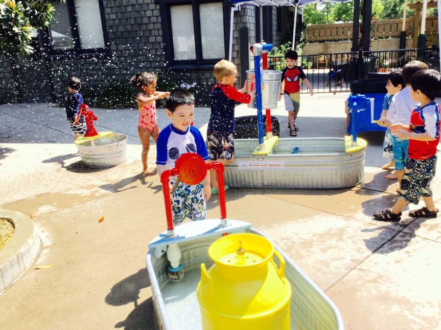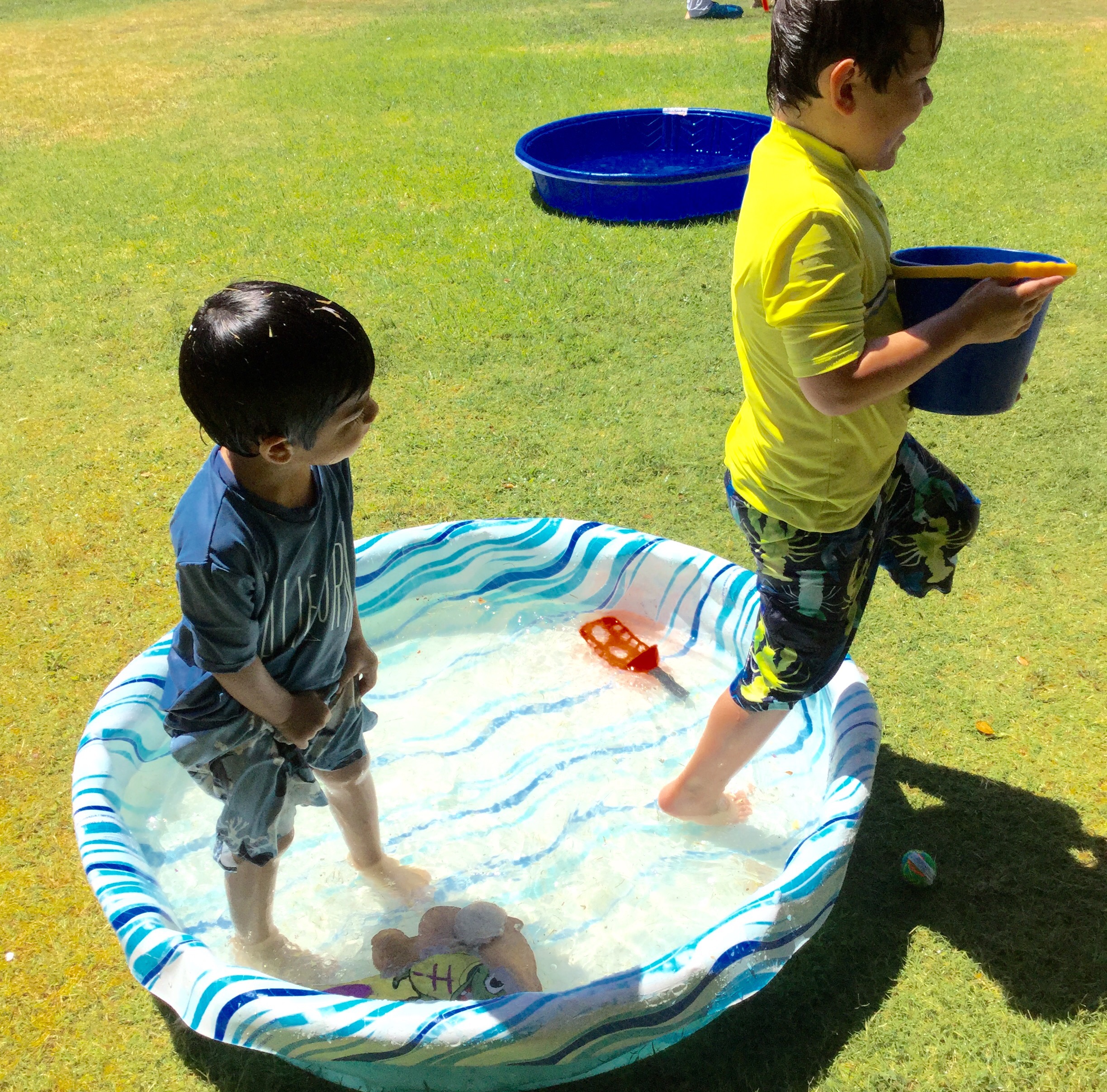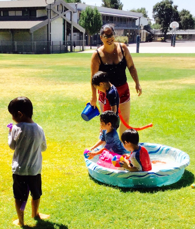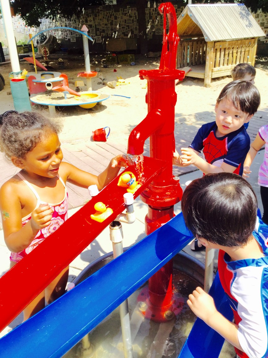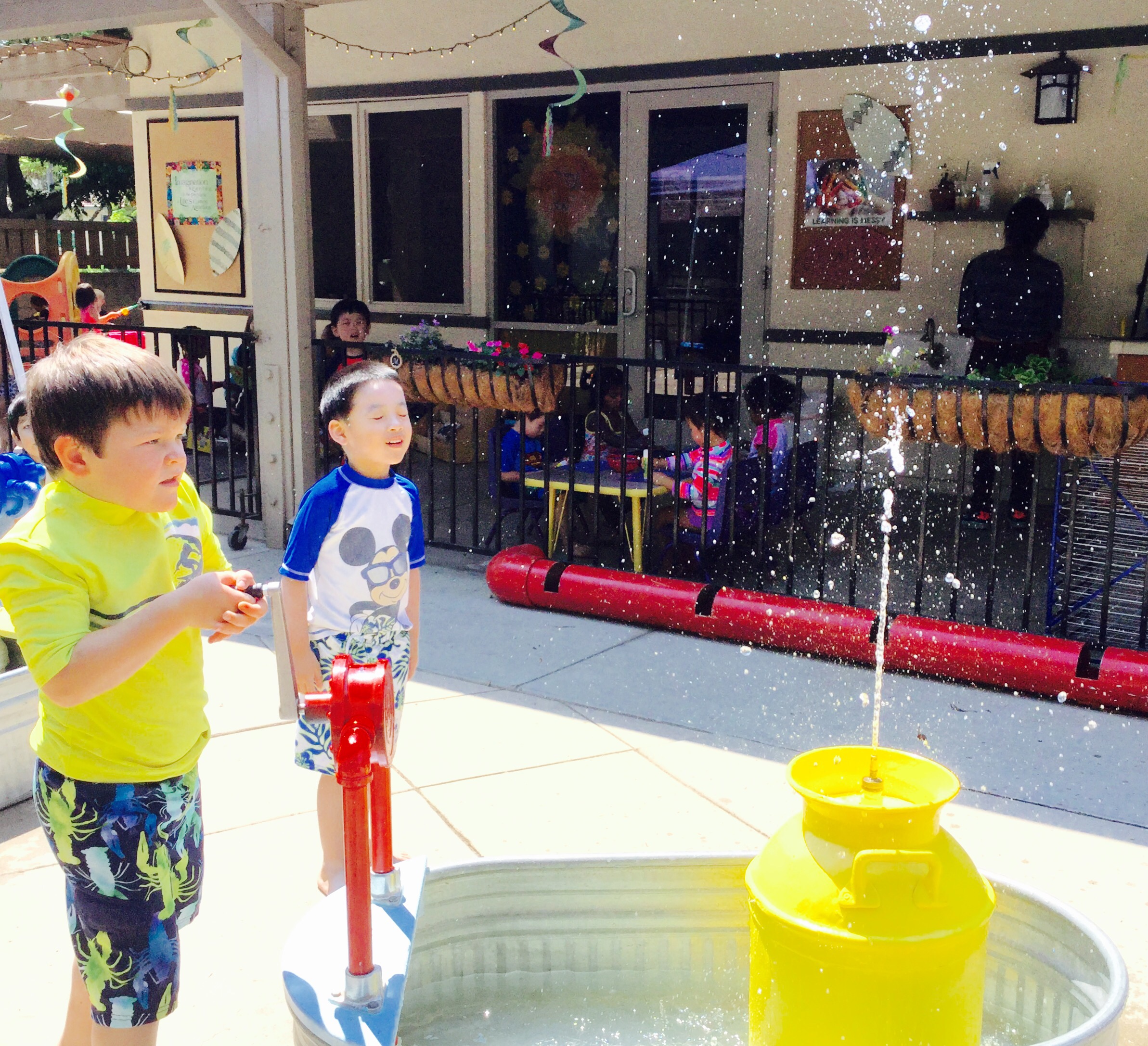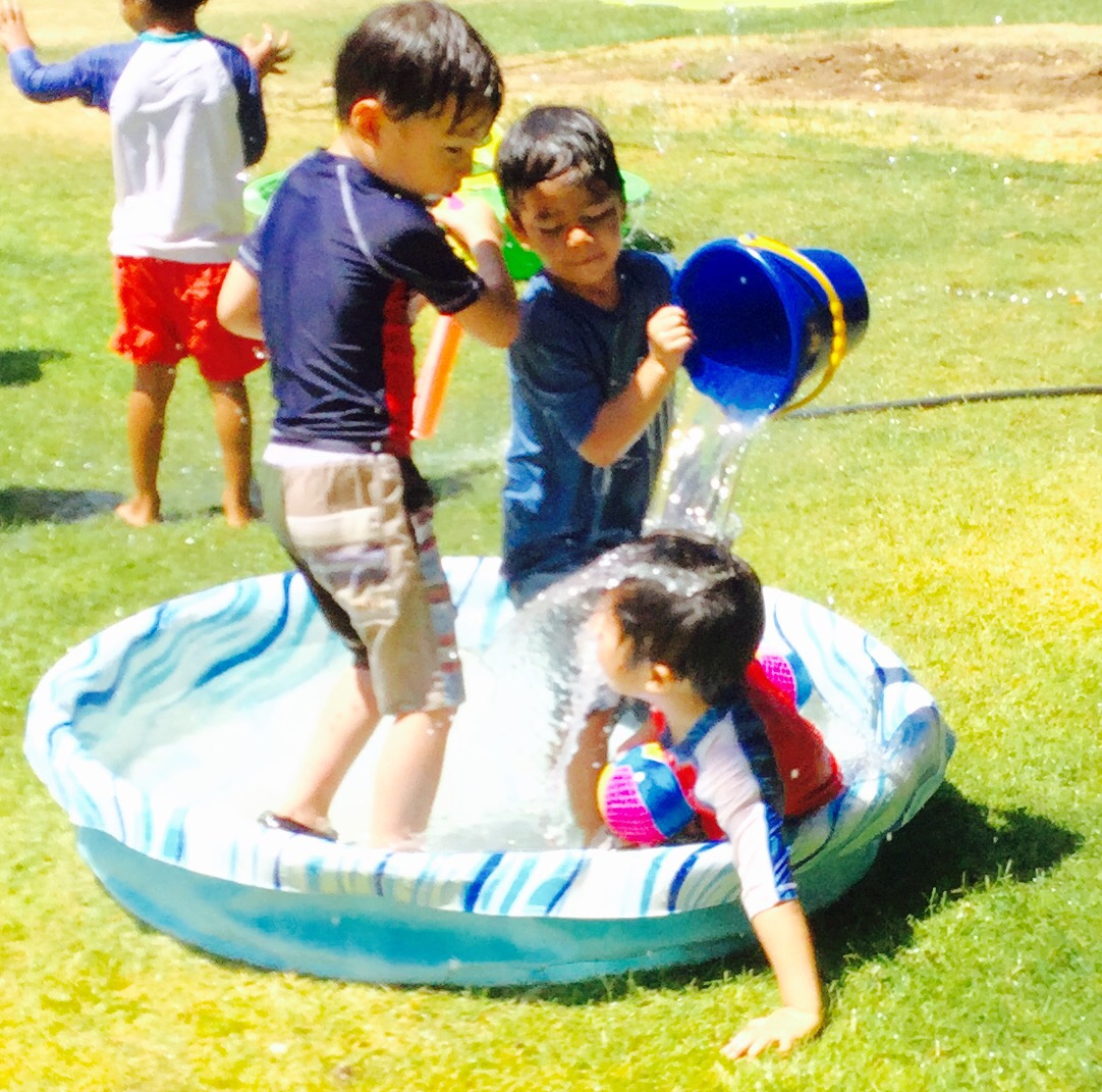 The children got very wet this week through our waterplay activities. On Tuesday, we had wading pools and a sprinkler. On Friday, Pump and Splash brought their fantastic pumps and water barrels. But I think their favorite game was “Get the Teachers Wet”!