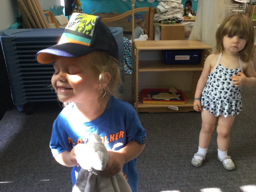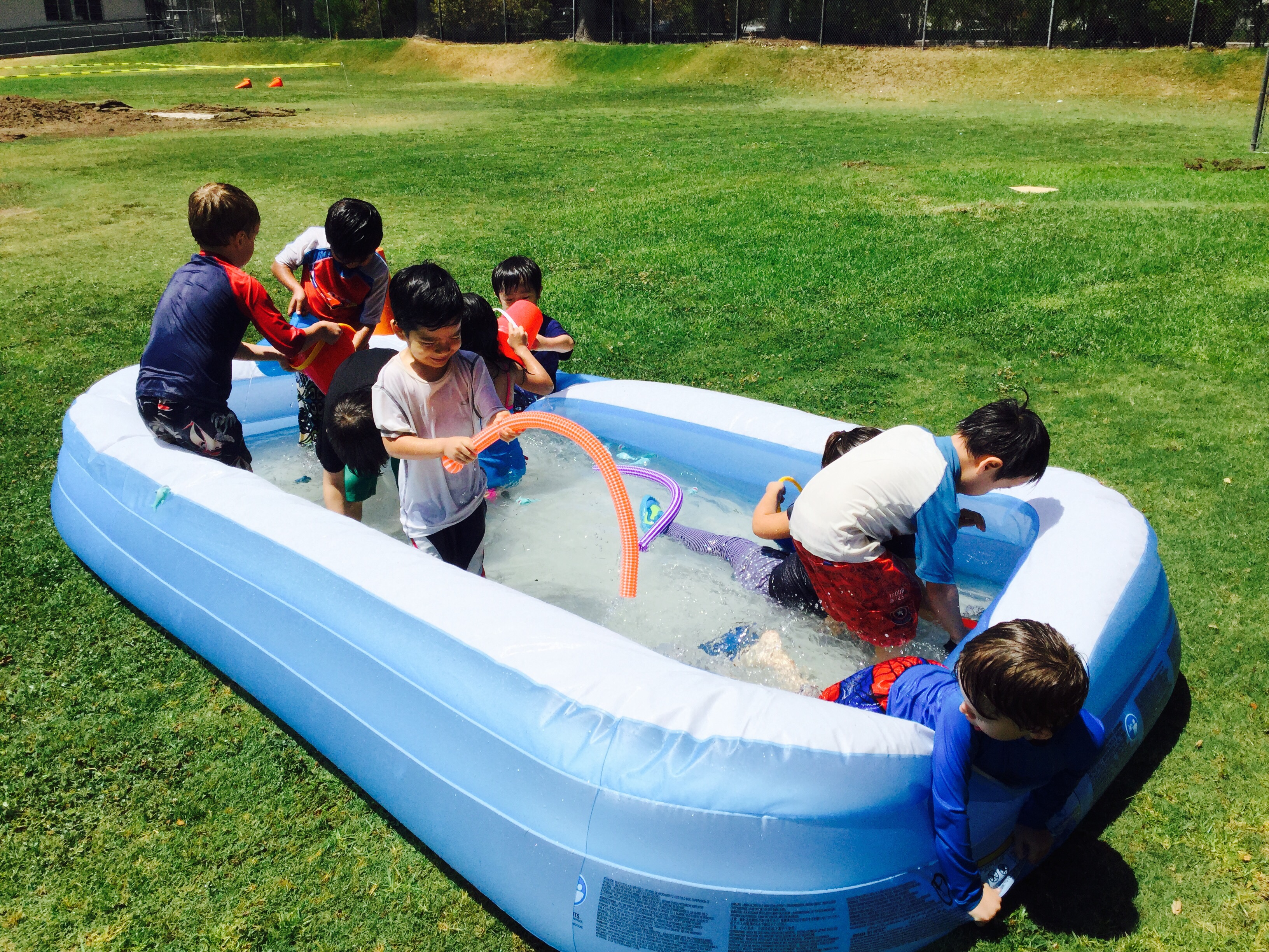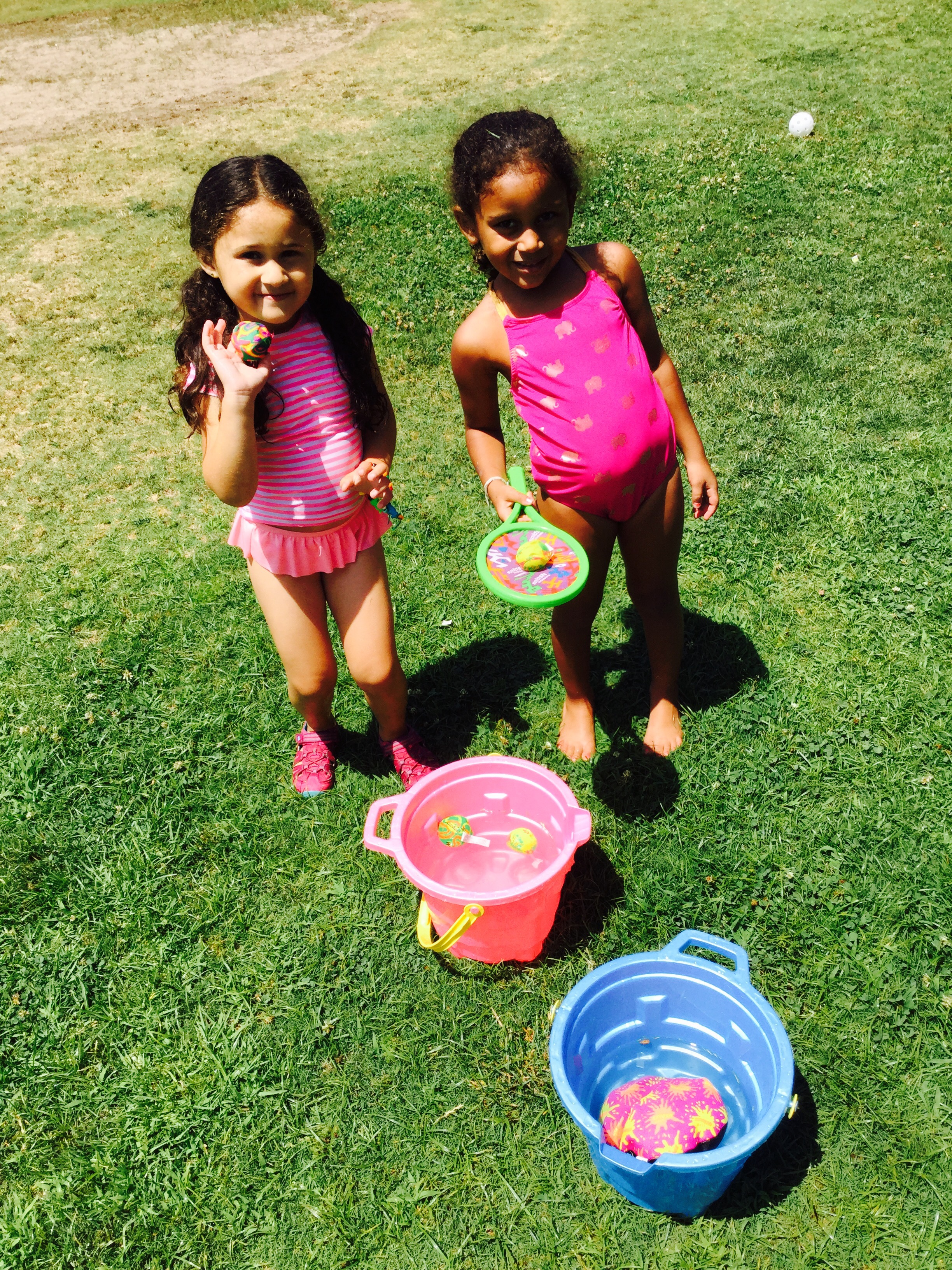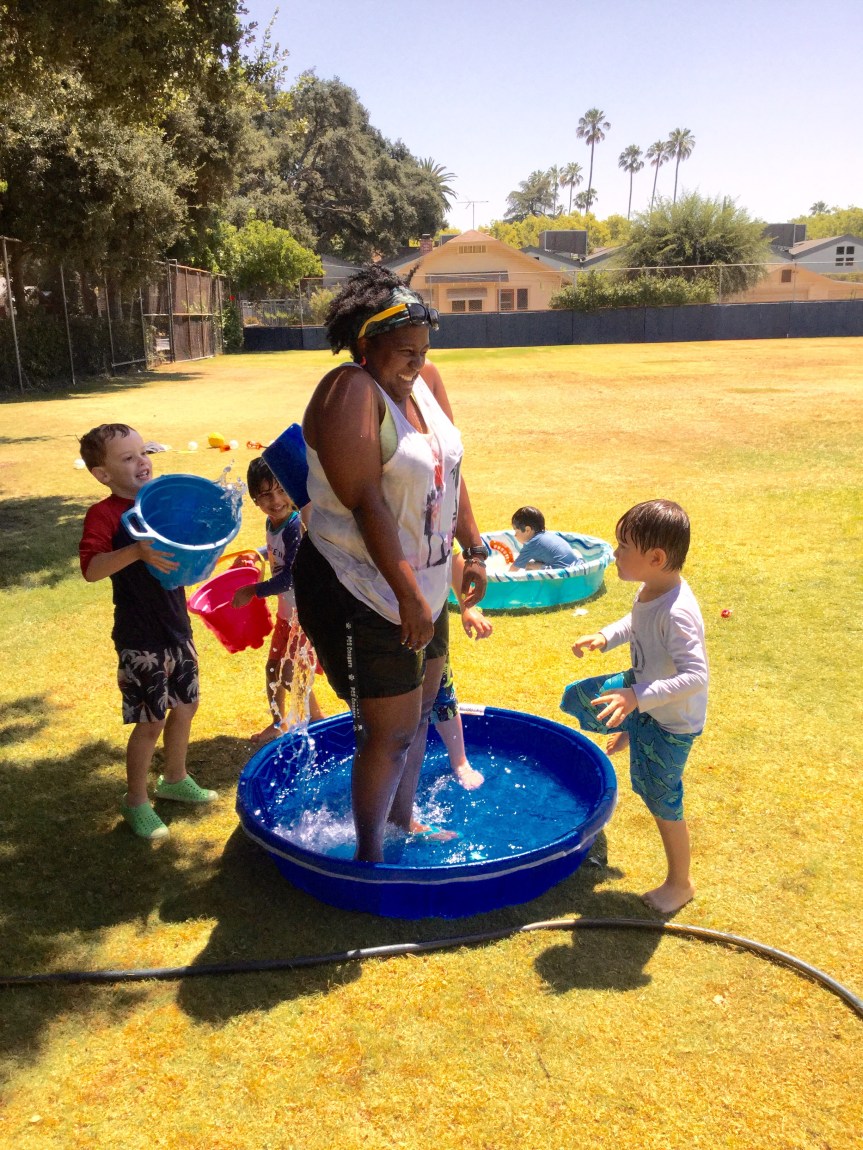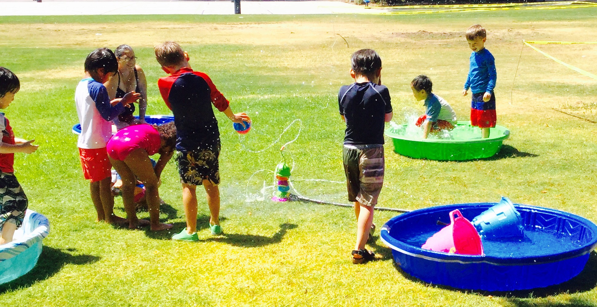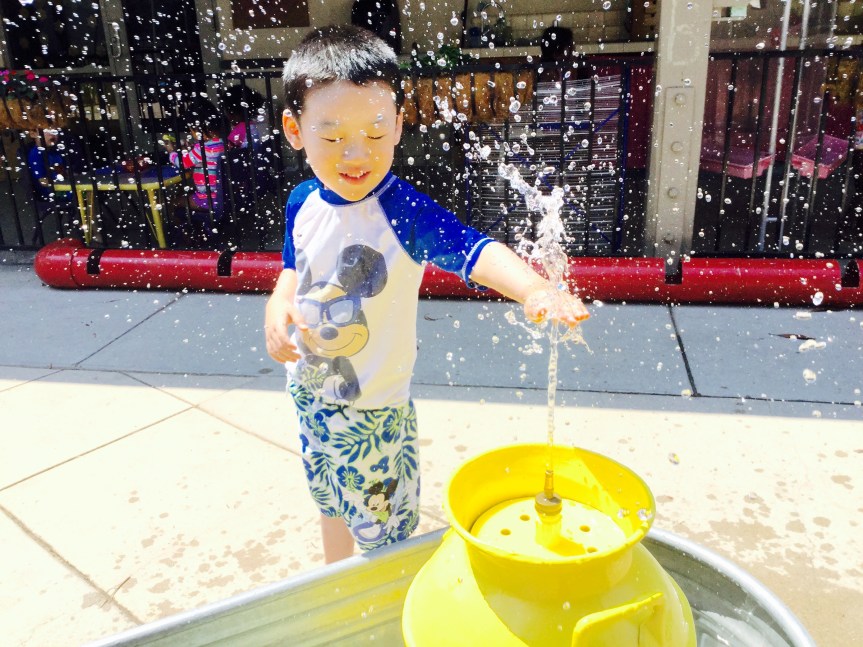 The children got very wet this week through our waterplay activities. On Tuesday, we had wading pools and a sprinkler. On Friday, Pump and Splash brought their fantastic pumps and water barrels. But I think their favorite game was “Get the Teachers Wet”!