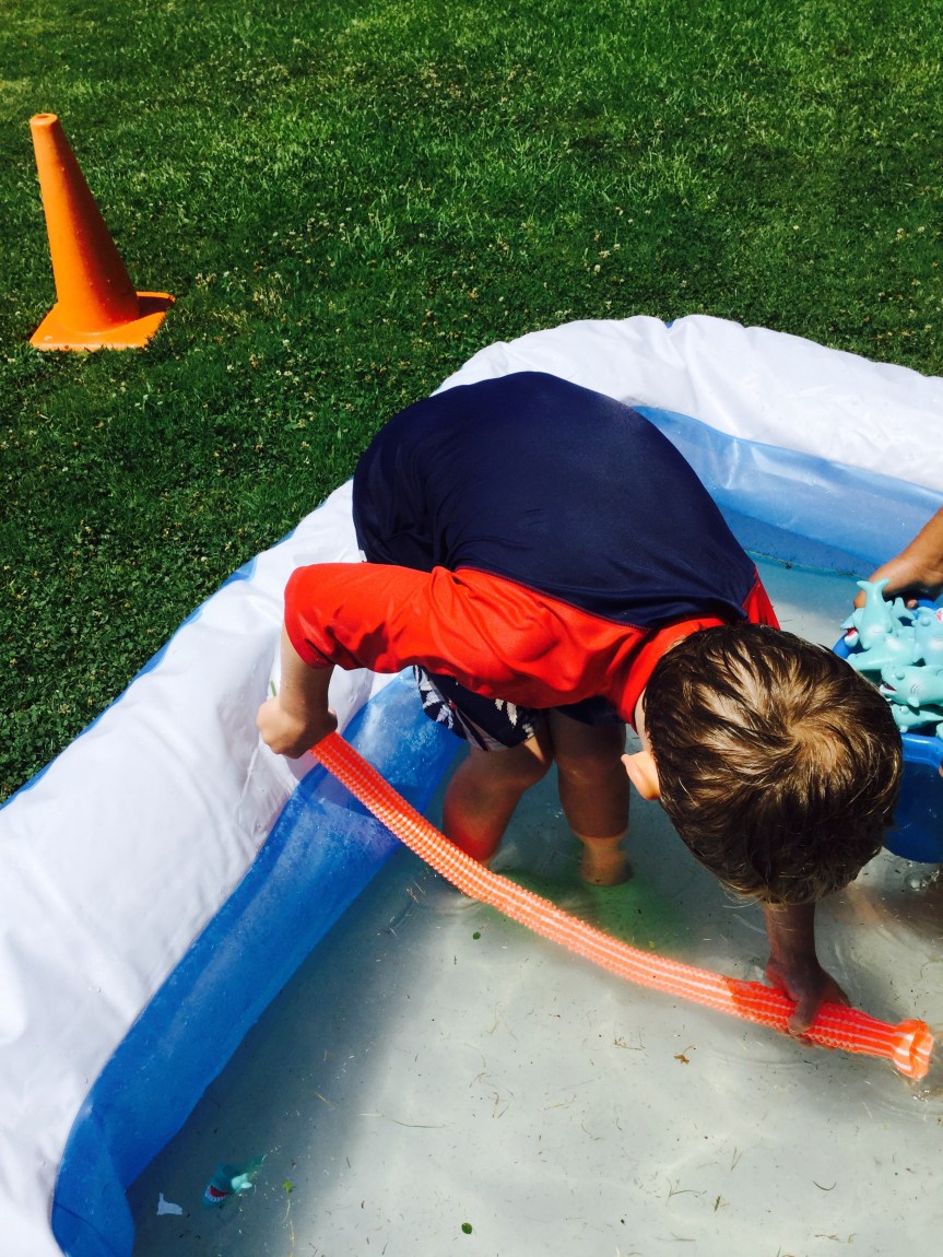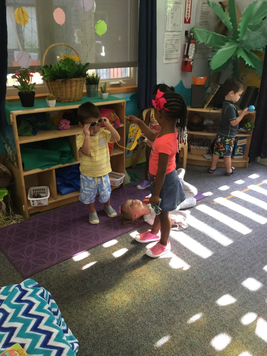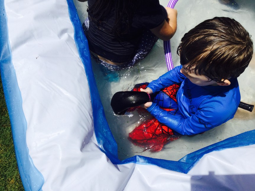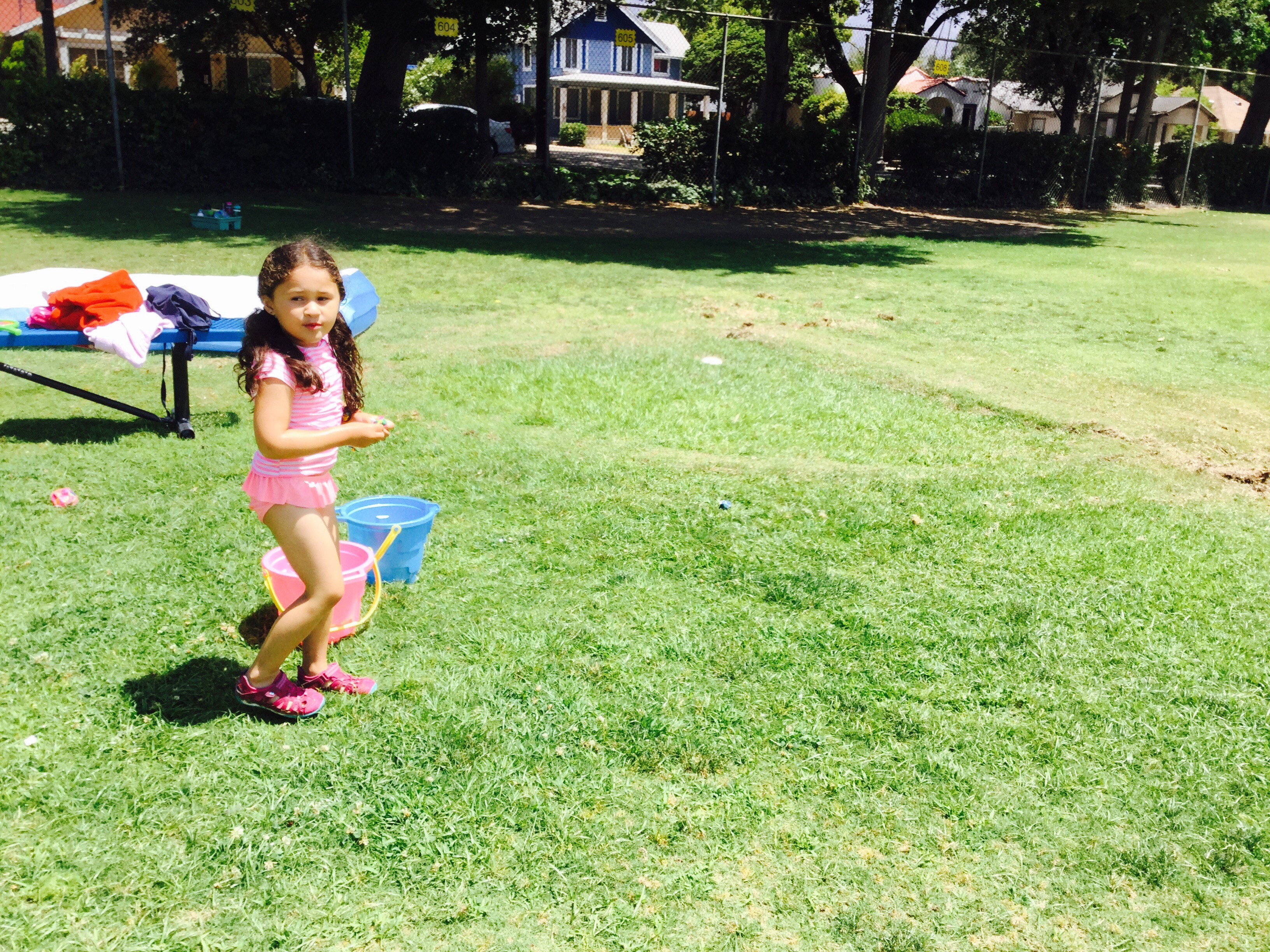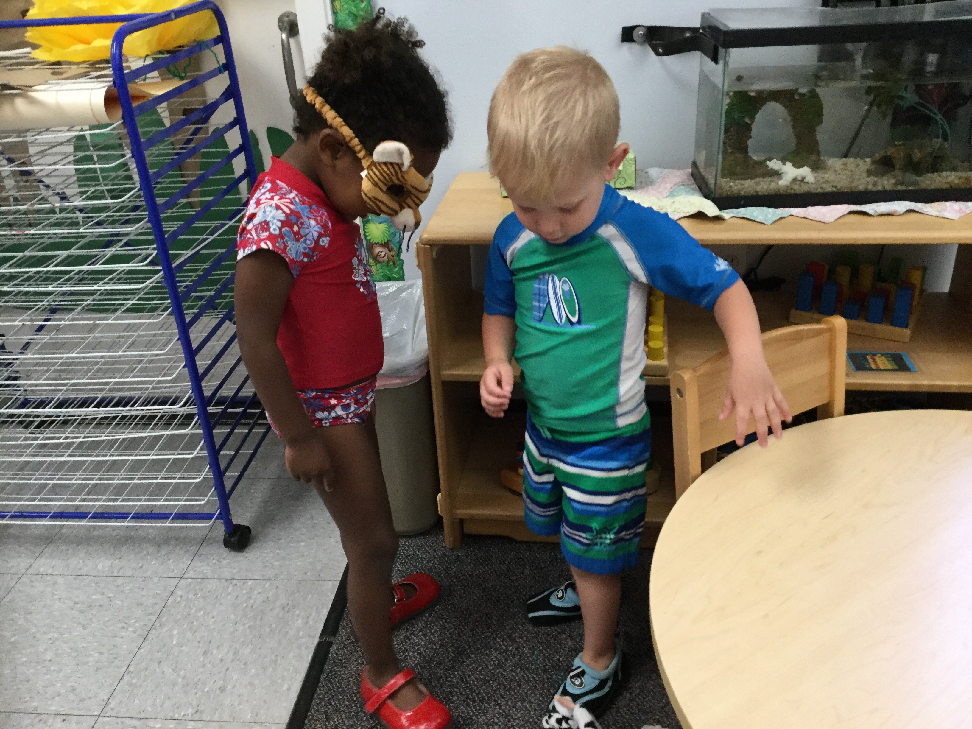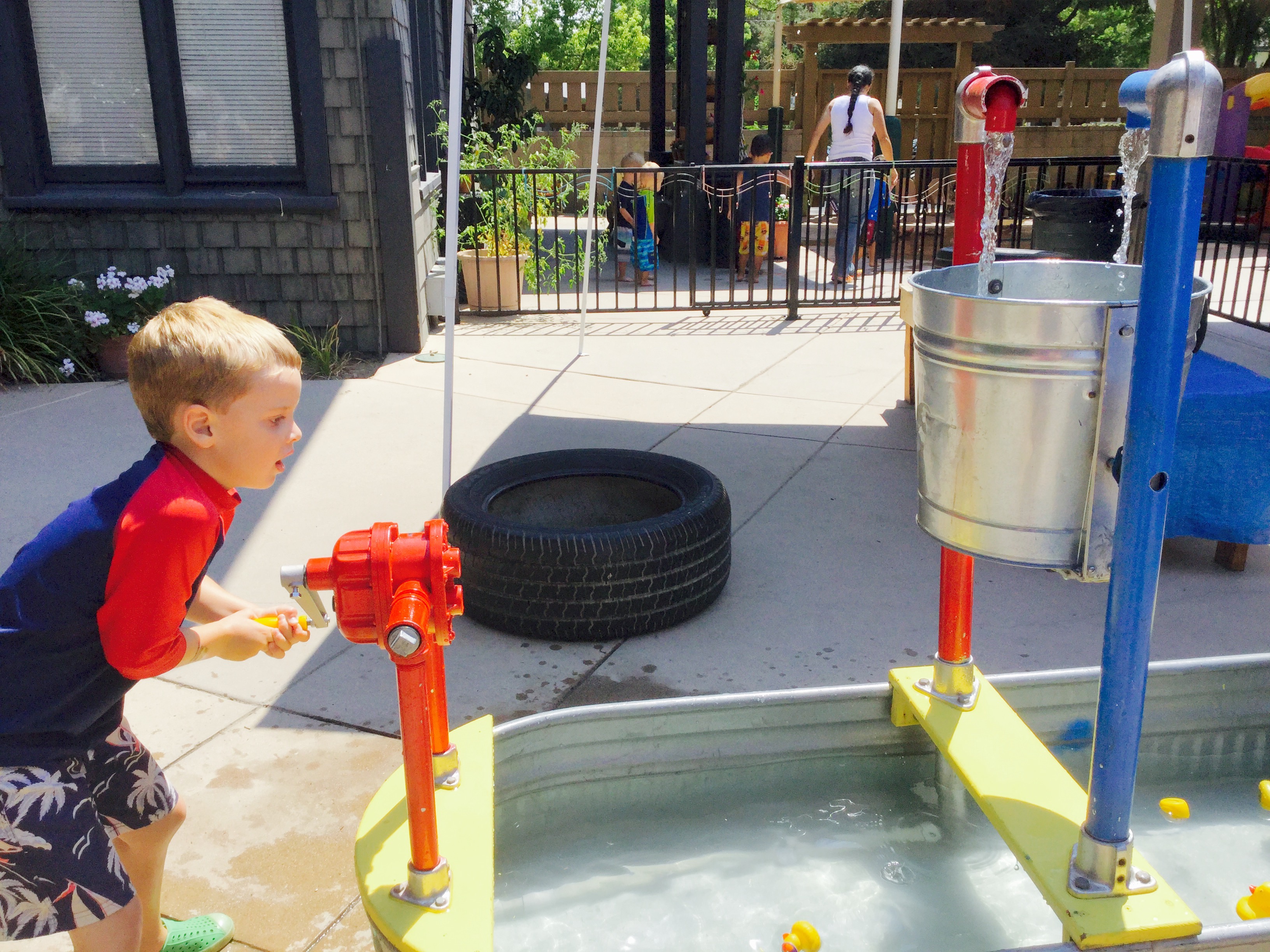 The children got very wet this week through our waterplay activities. On Tuesday, we had wading pools and a sprinkler. On Friday, Pump and Splash brought their fantastic pumps and water barrels. But I think their favorite game was “Get the Teachers Wet”!