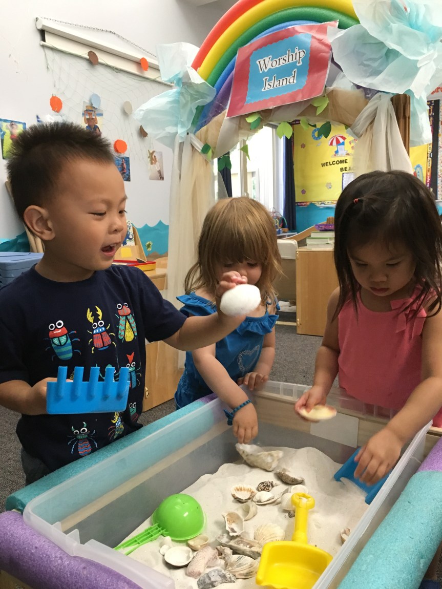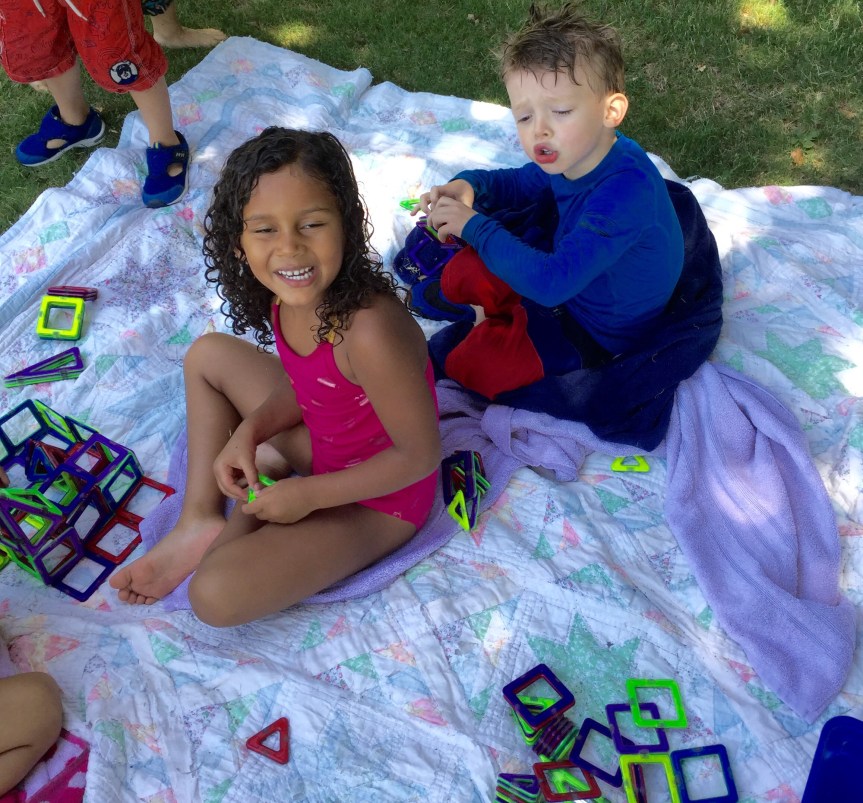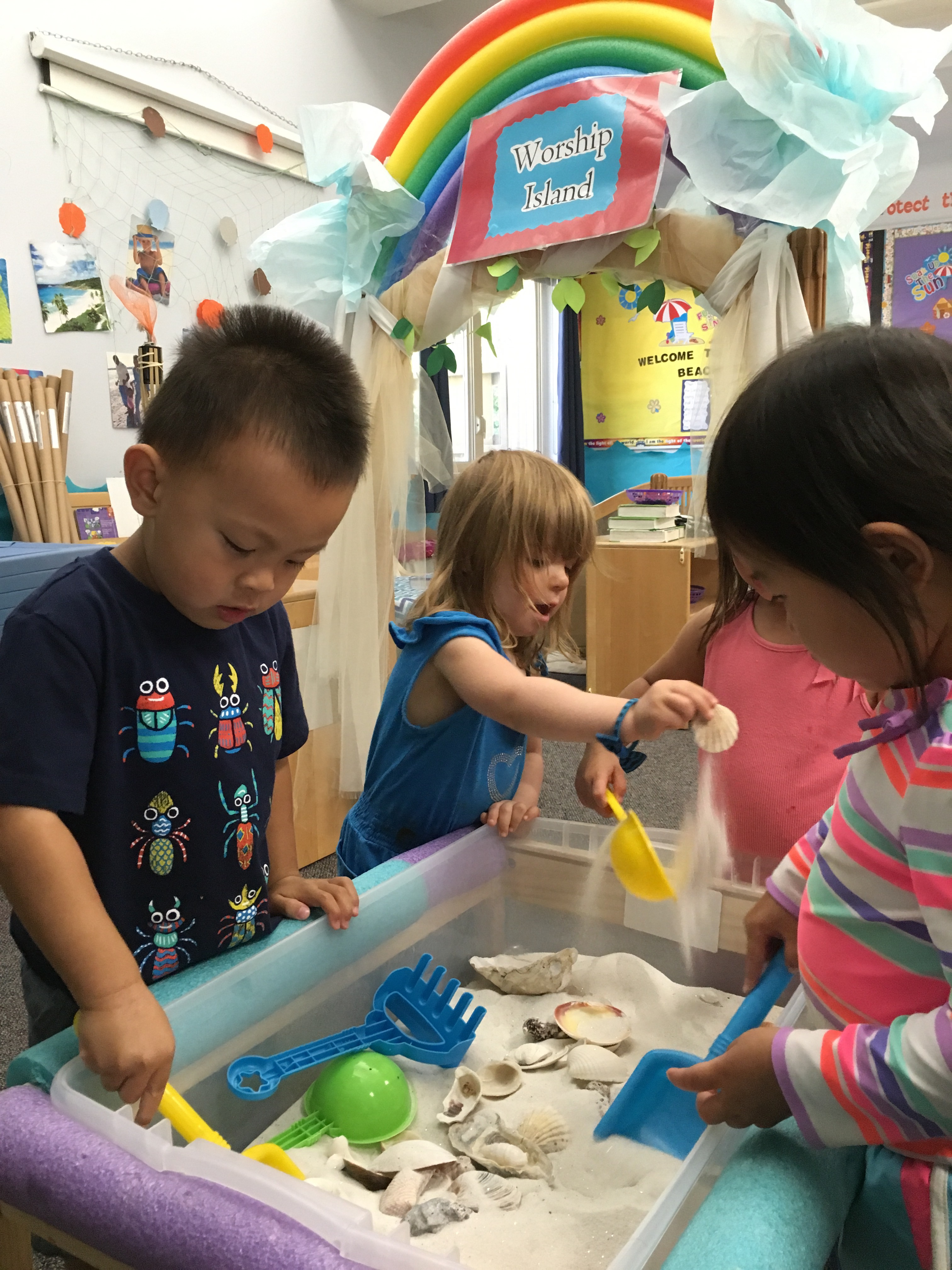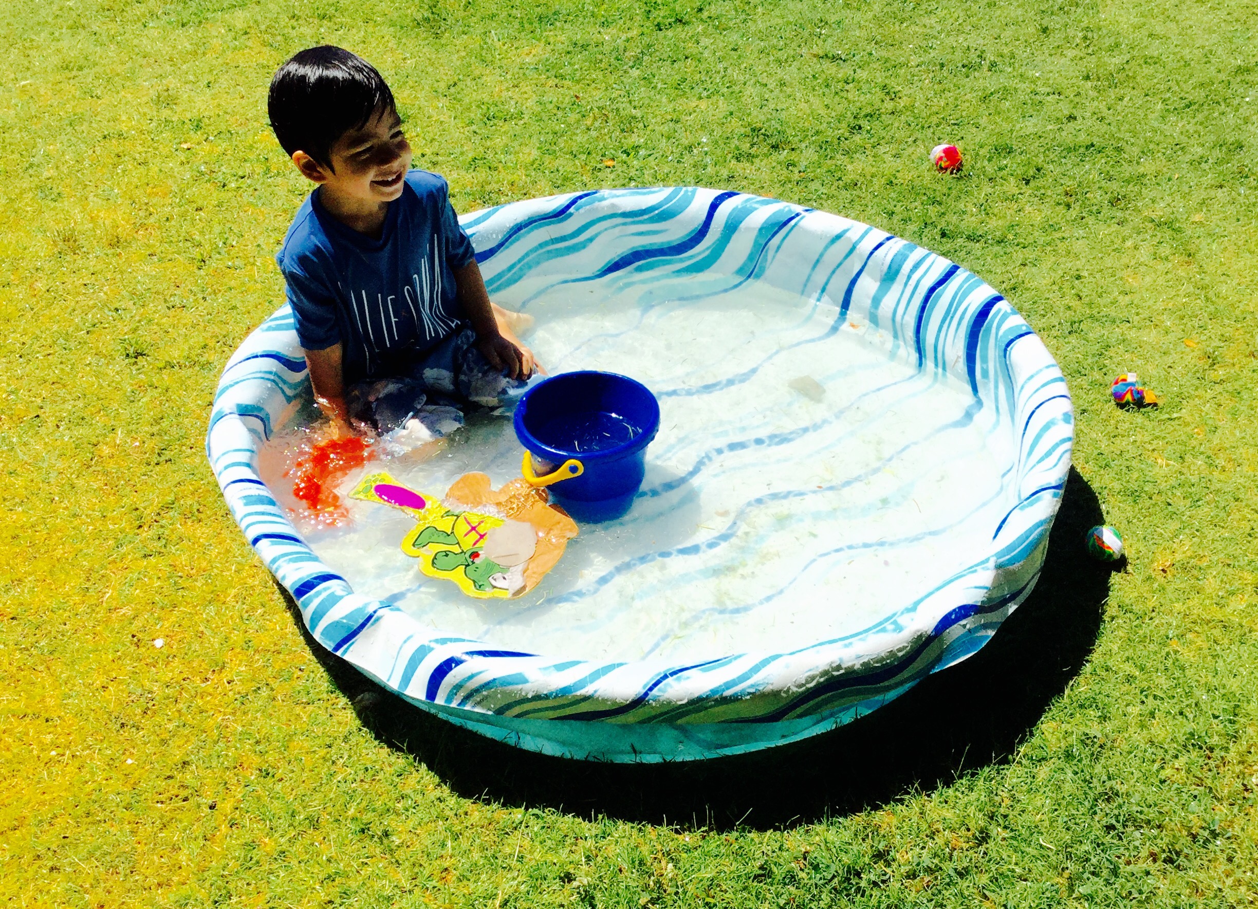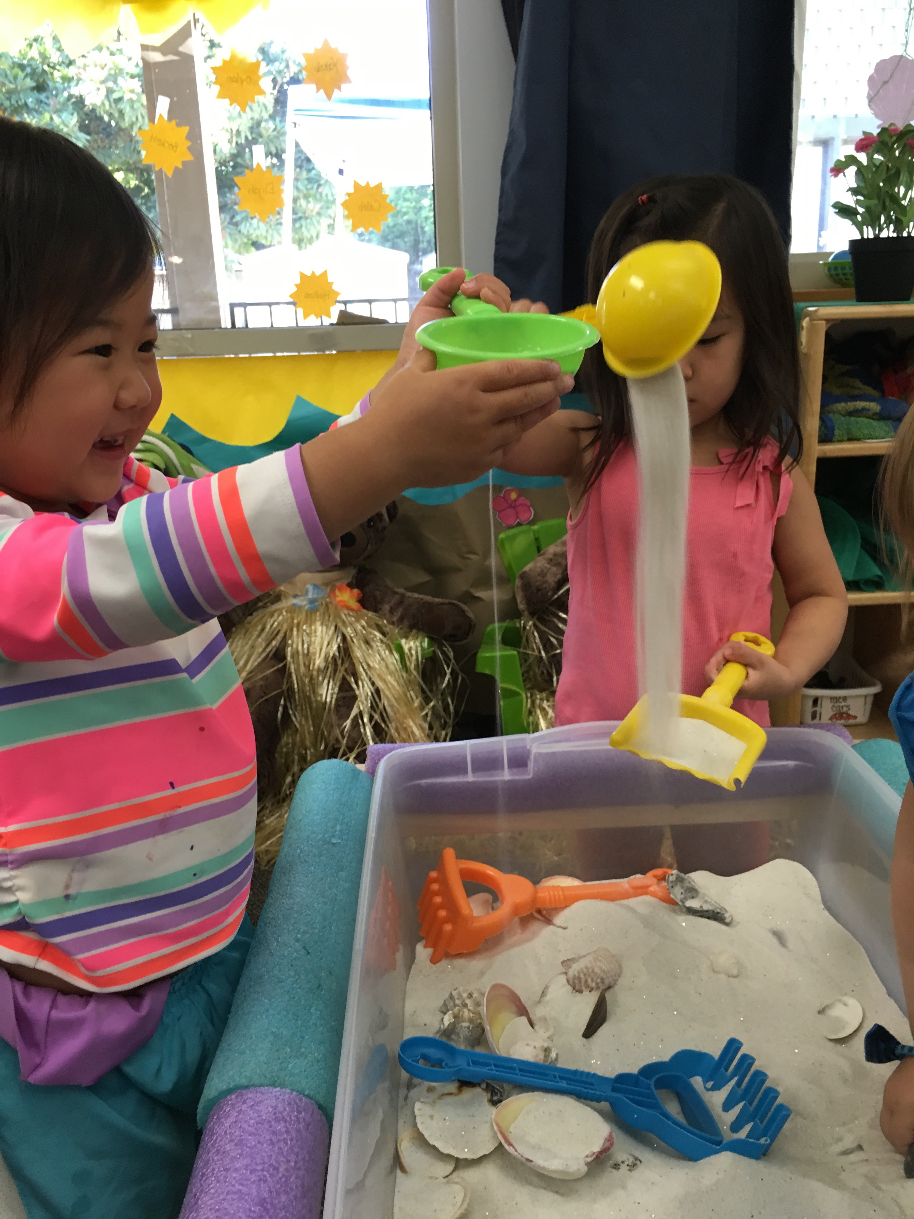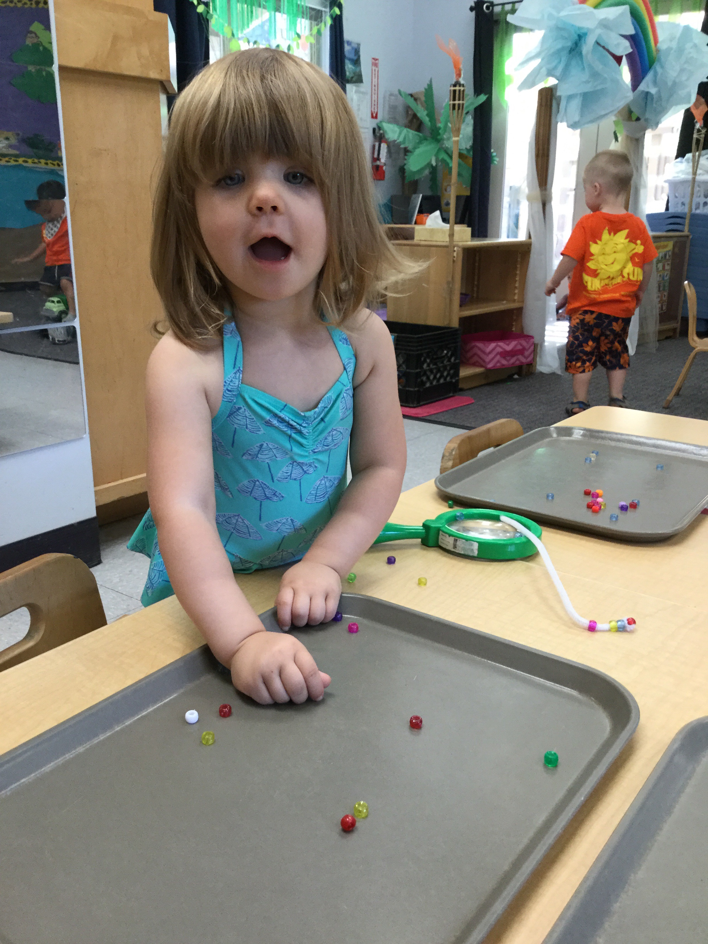 The children got very wet this week through our waterplay activities. On Tuesday, we had wading pools and a sprinkler. On Friday, Pump and Splash brought their fantastic pumps and water barrels. But I think their favorite game was “Get the Teachers Wet”!