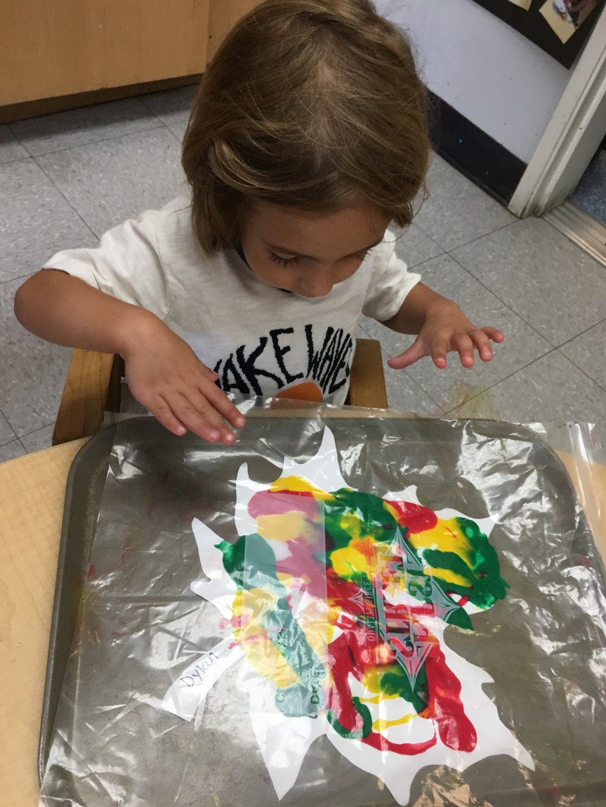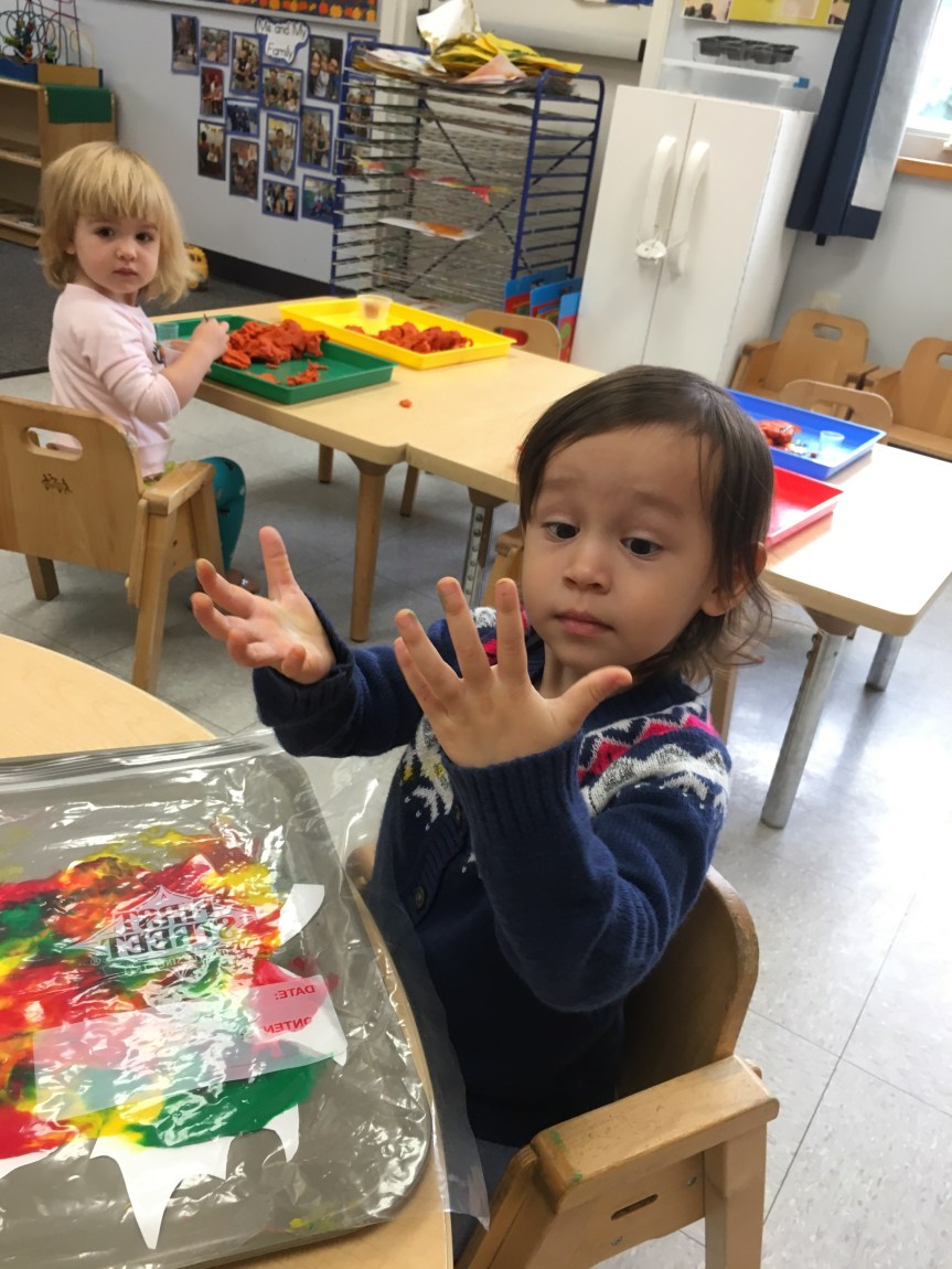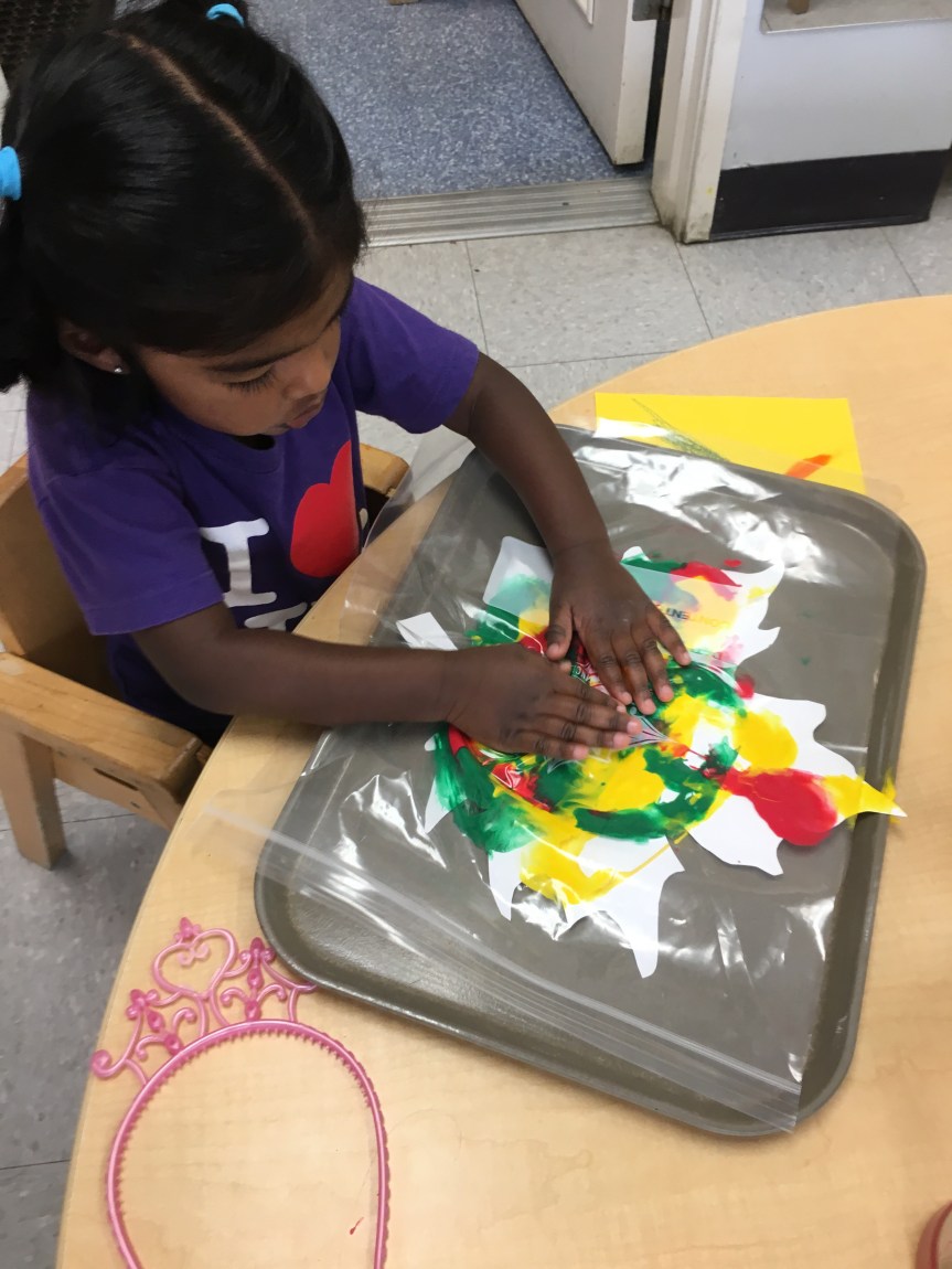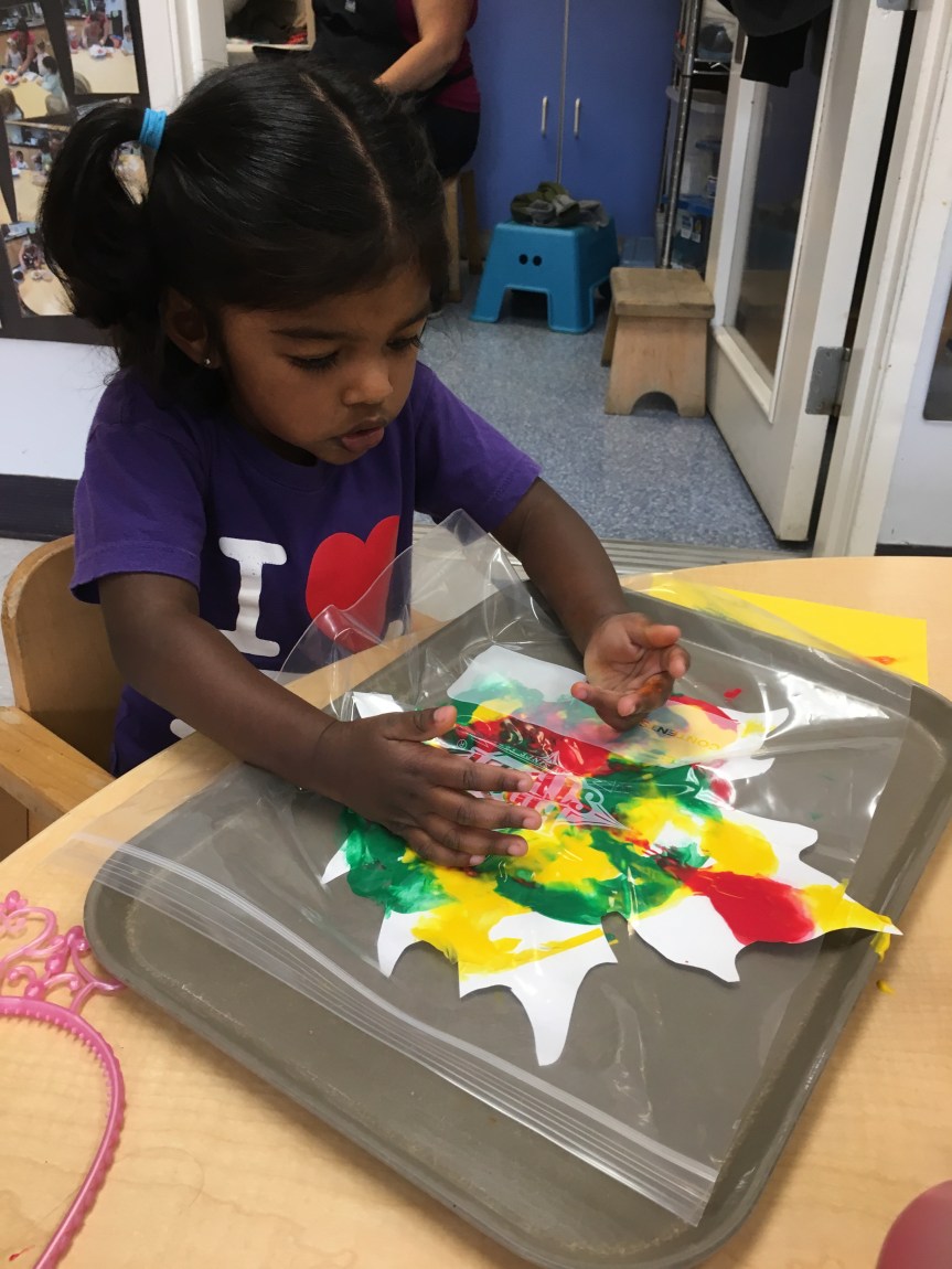 Room 5 has been acquainting itself with the season of autumn through sensory integrations in our classroom learning centers. We have pumpkin spice mixed in with our sensory bin, autumn jewels alongside our playdough, and today we did “No-Mess Fingerpainting” on paper leaves to decorate our classroom!