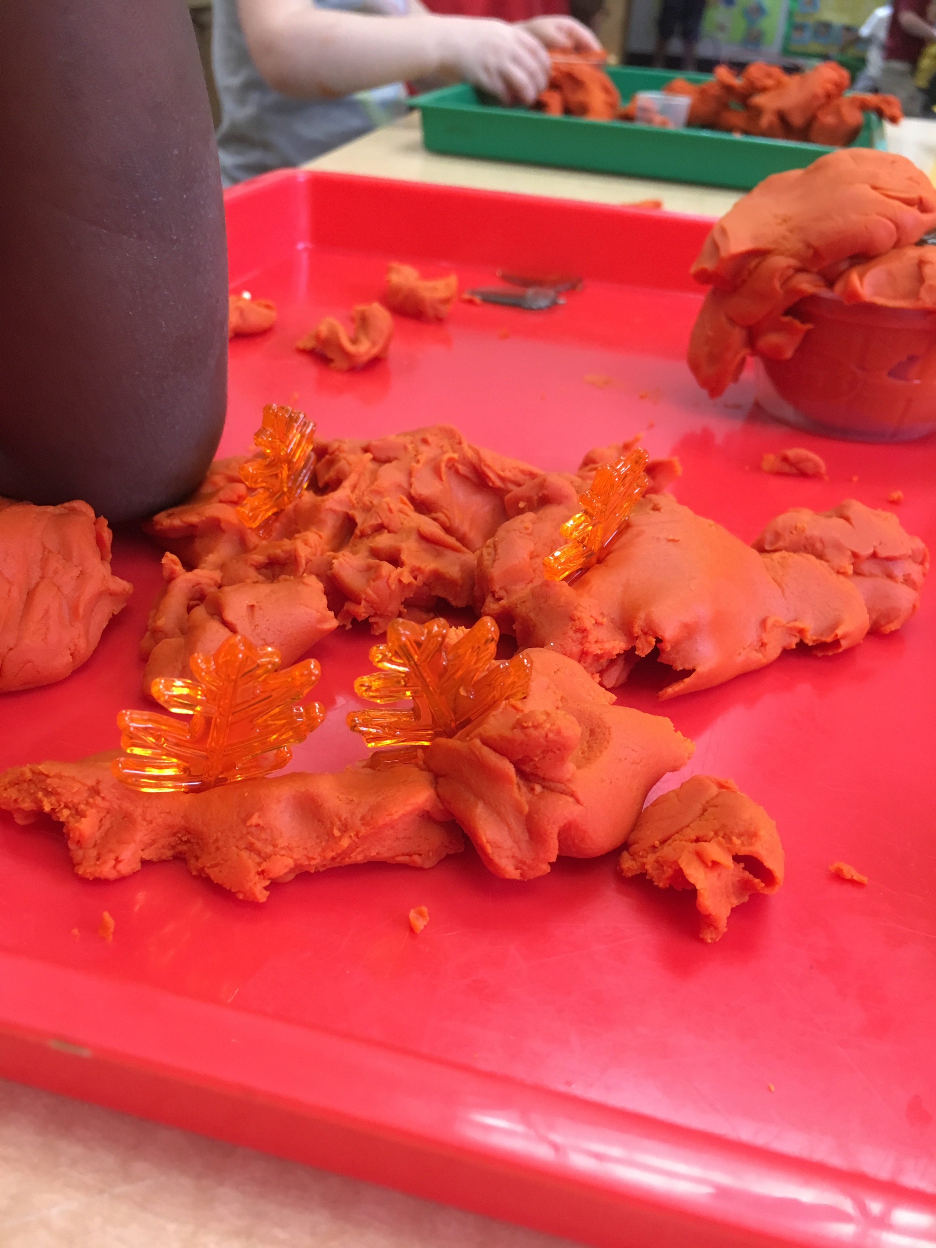 Some friends decided to imprint their playdough with the autumn jewels while others saw an opportunity to build a landscape of “trees” by sorting out and only using the leaf jewels to stick up straight in their playdough! When children take place in activities that build on their fine motor skills (like making prints in playdough) they are learning about basic concepts of physics like force, quantity conservation and other other components of cause and effect. They are also engaging in language development as we discuss and describe what happens to the playdough and gems while they work. For example, “The jewel sinks into the playdough when you push it down” is an observation we made which inspired a conversation about homonyms! Some words sound and are spelled exactly the same but can have very different meanings… which is a lot for a hard-working brain of only two years to make sense of! By talking through these fun quirks of language with their teachers, and a first-hand example, these abstract concepts are made much more concrete to our young friends!
