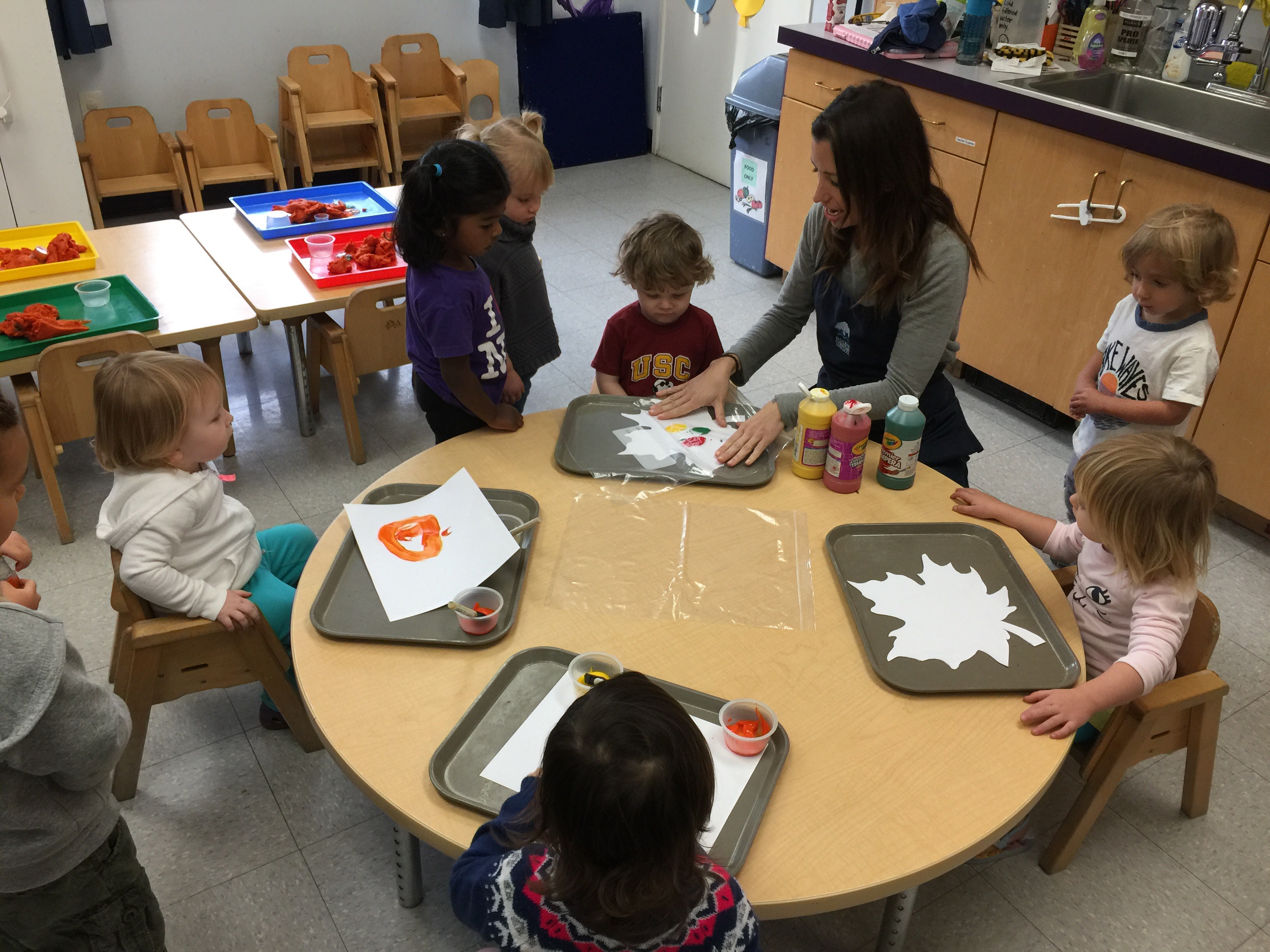 Room 5 has been acquainting itself with the season of autumn through sensory integrations in our classroom learning centers. We have pumpkin spice mixed in with our sensory bin, autumn jewels alongside our playdough, and today we did “No-Mess Fingerpainting” on paper leaves to decorate our classroom!