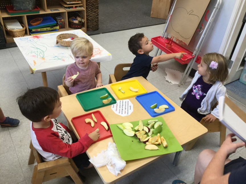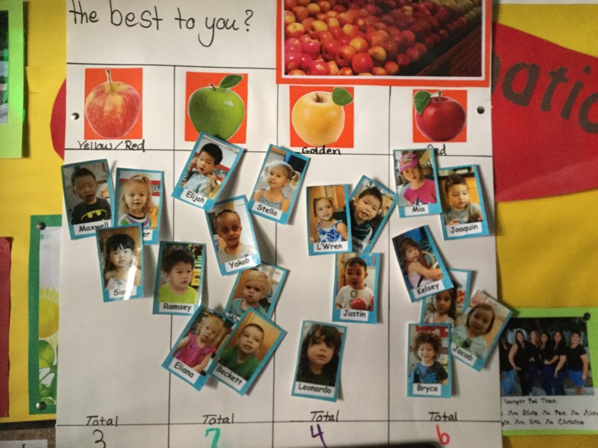 children were very excited to learn about the differences and similarities of apples. Through observation, exploration and tasting of all kinds of apples that were brought by all (Gala, Red delicious, Golden delicious and Honey golden), we were able to record the outcome of your child’s favorite apple.”Some fun and educational ways to introduce math to your child.”
