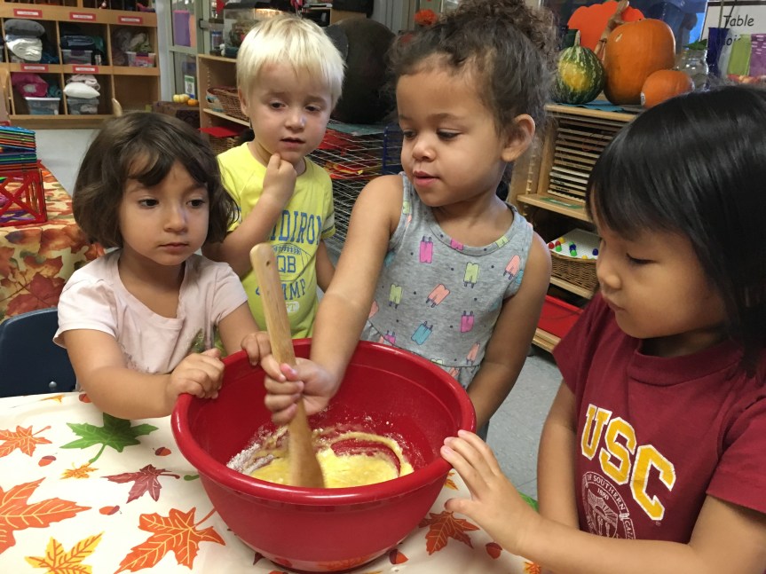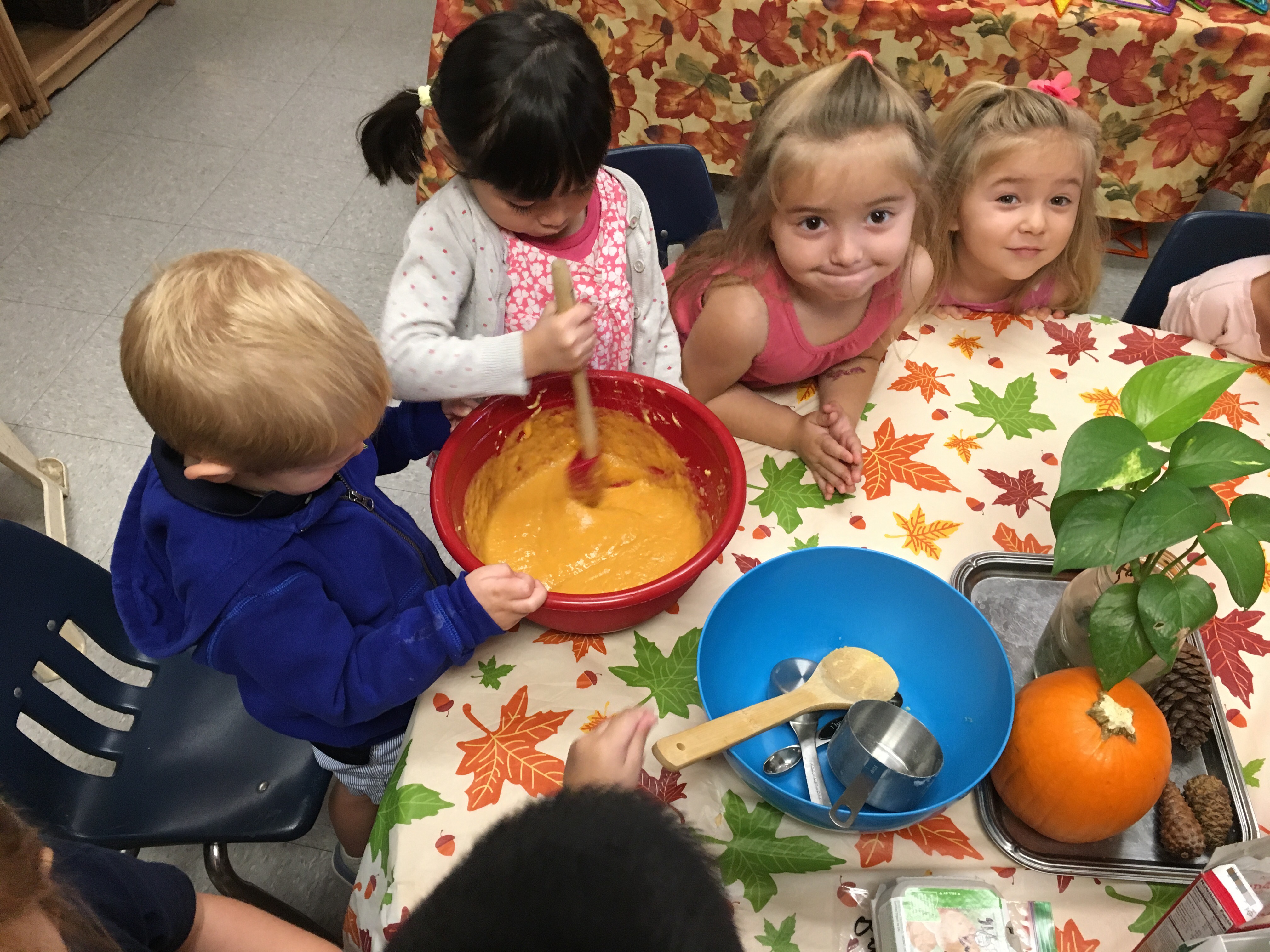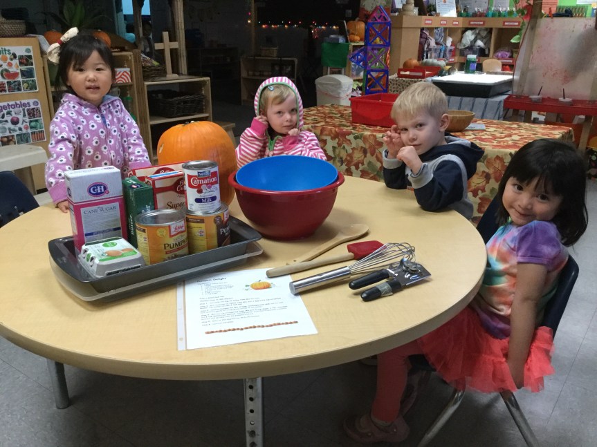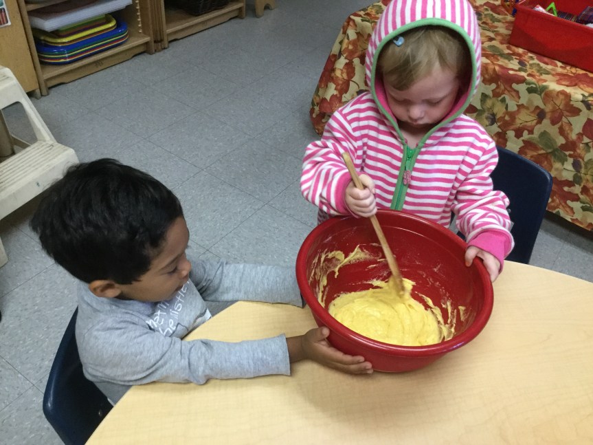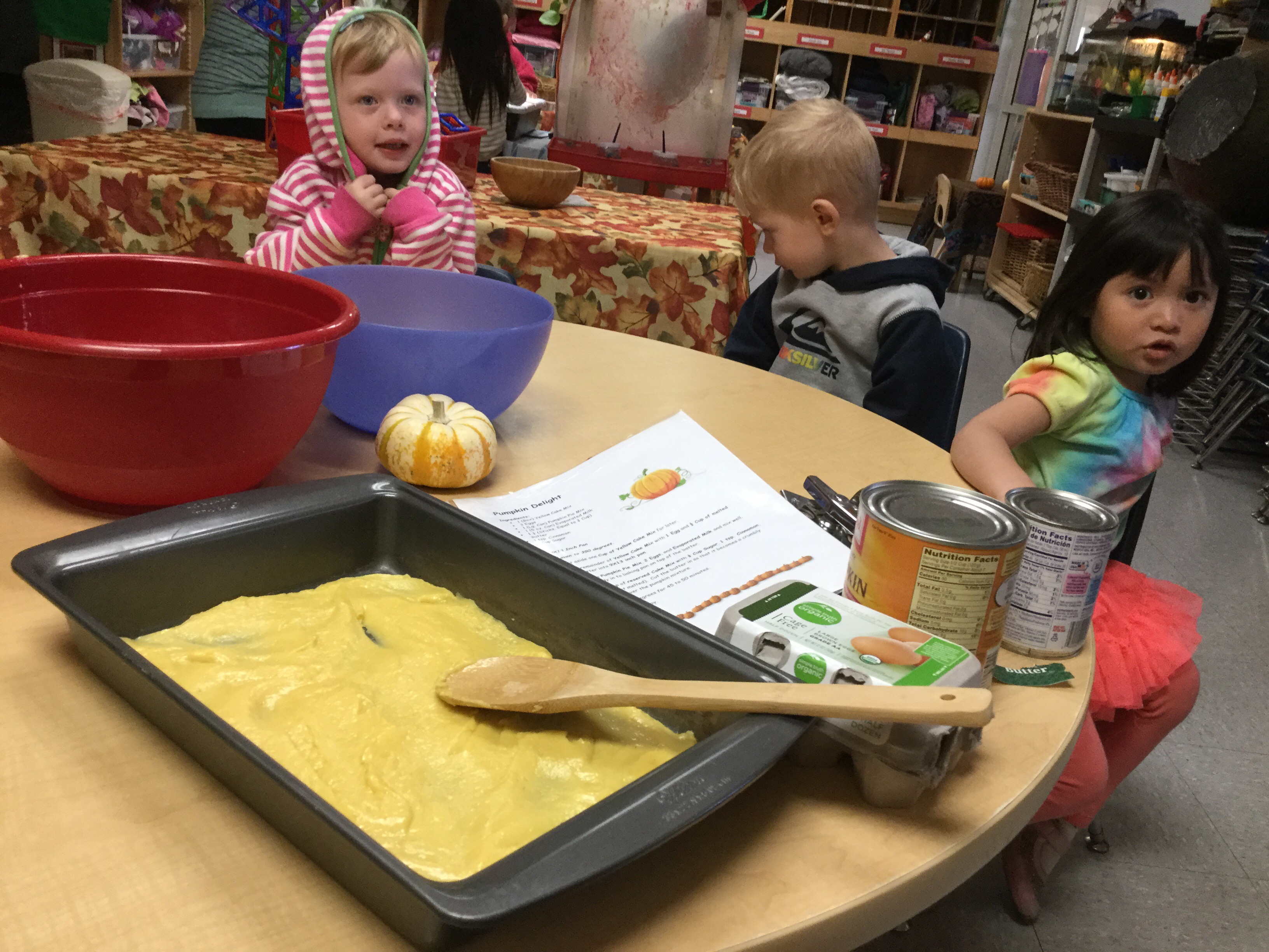 Room 3 had an amazing time this week celebrating the season of orange pumpkins and falling leaves. We were all able to make and taste a delectable creation that we call, “Pumpkin Delight.” With the help of the children, a sweet, soft and moist treat was baked in honor of Autumn and its signature fruit, pumpkins.