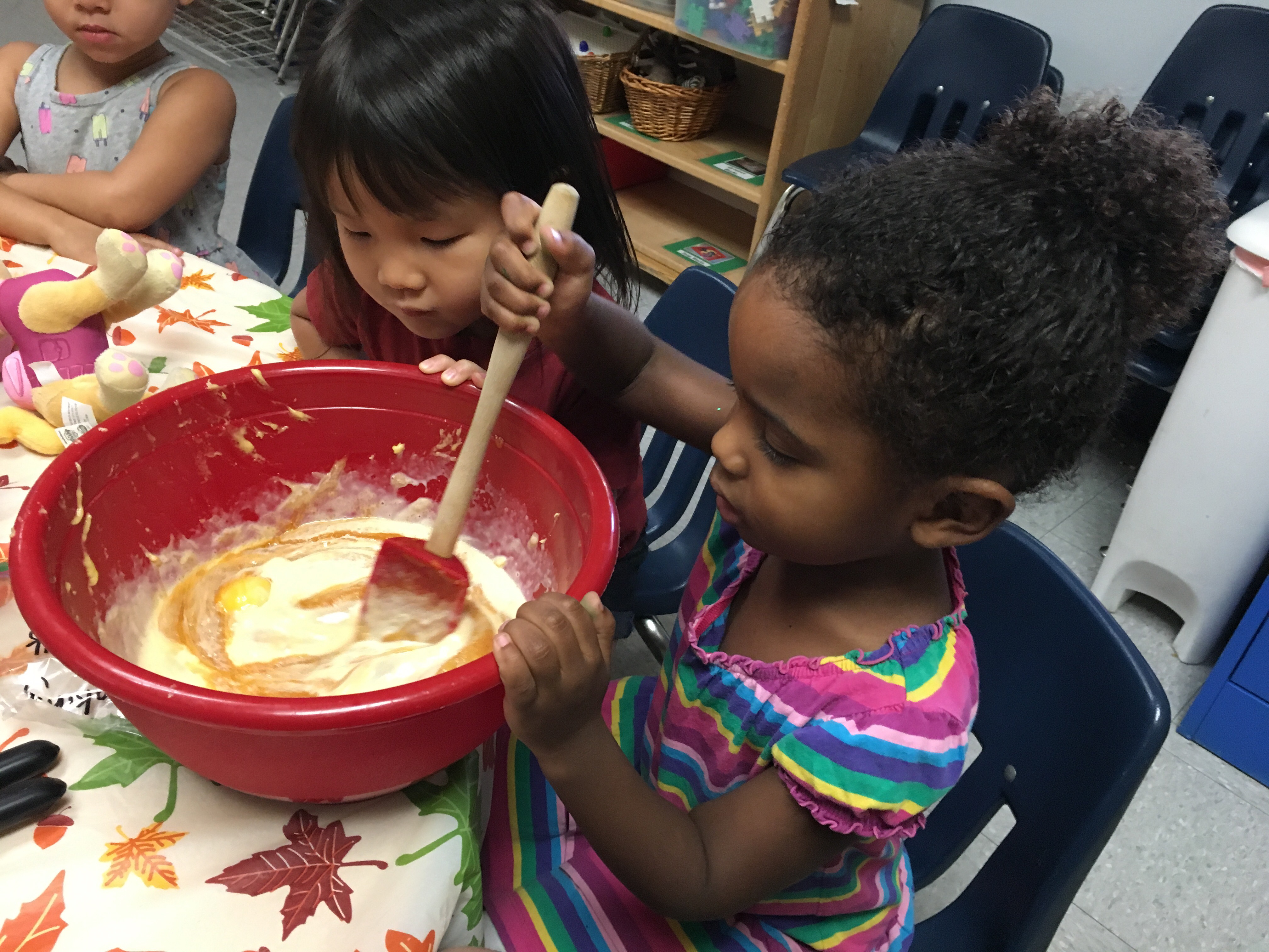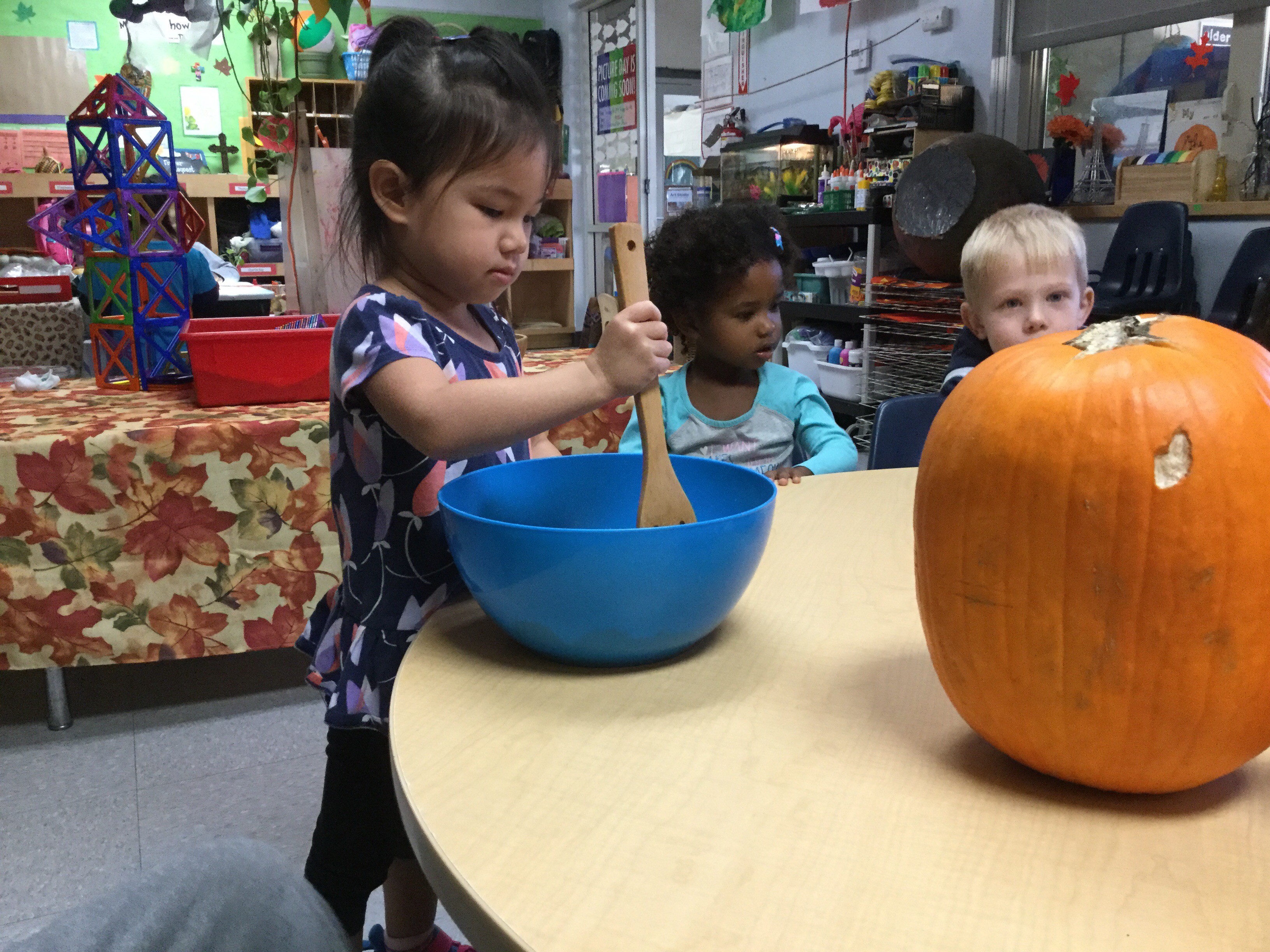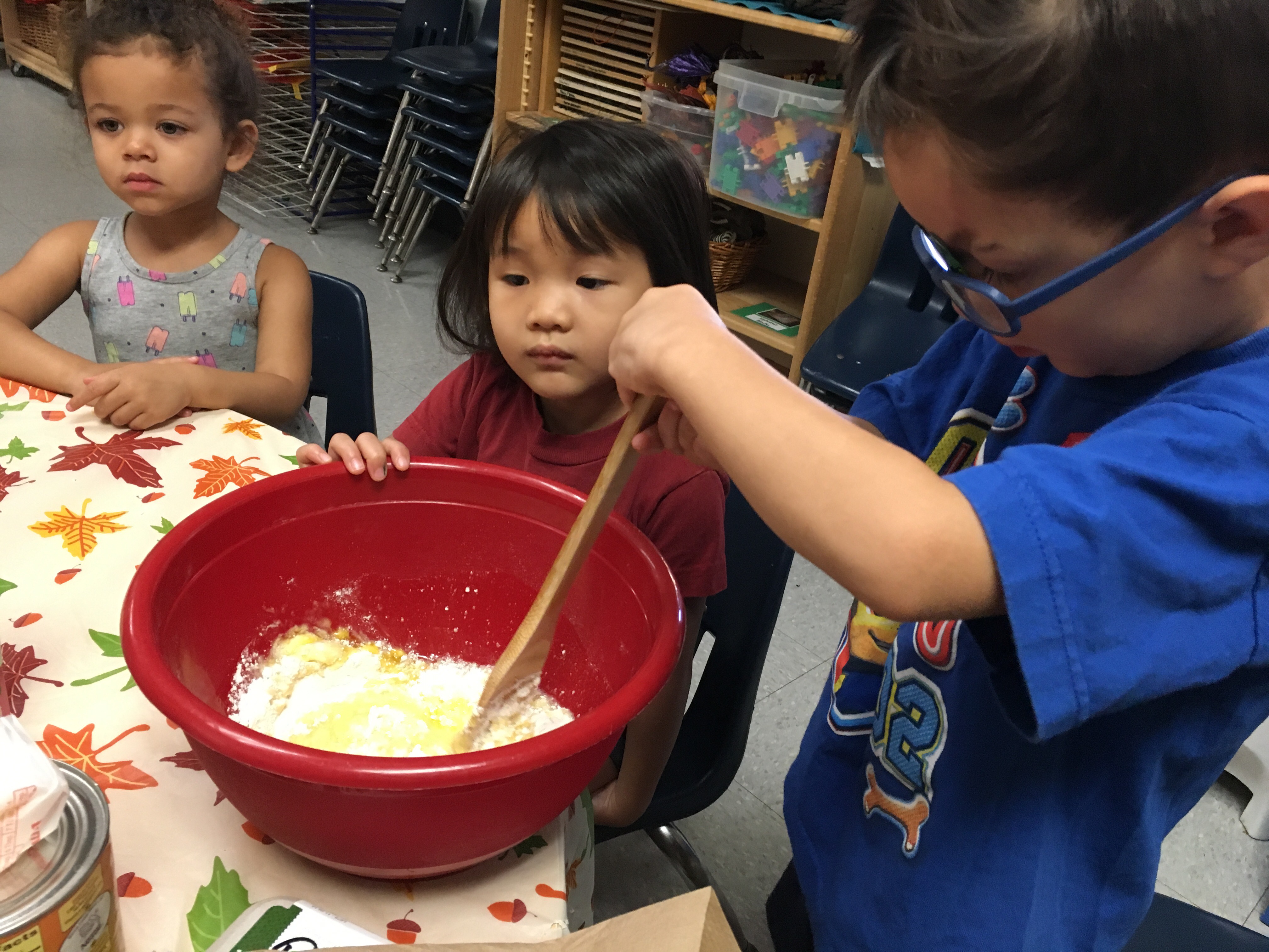 Room 3 had an amazing time this week celebrating the season of orange pumpkins and falling leaves. We were all able to make and taste a delectable creation that we call, “Pumpkin Delight.” With the help of the children, a sweet, soft and moist treat was baked in honor of Autumn and its signature fruit, pumpkins.