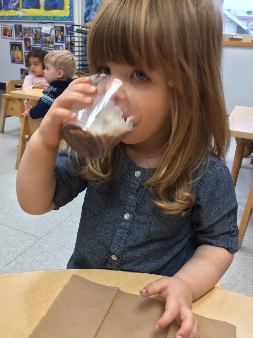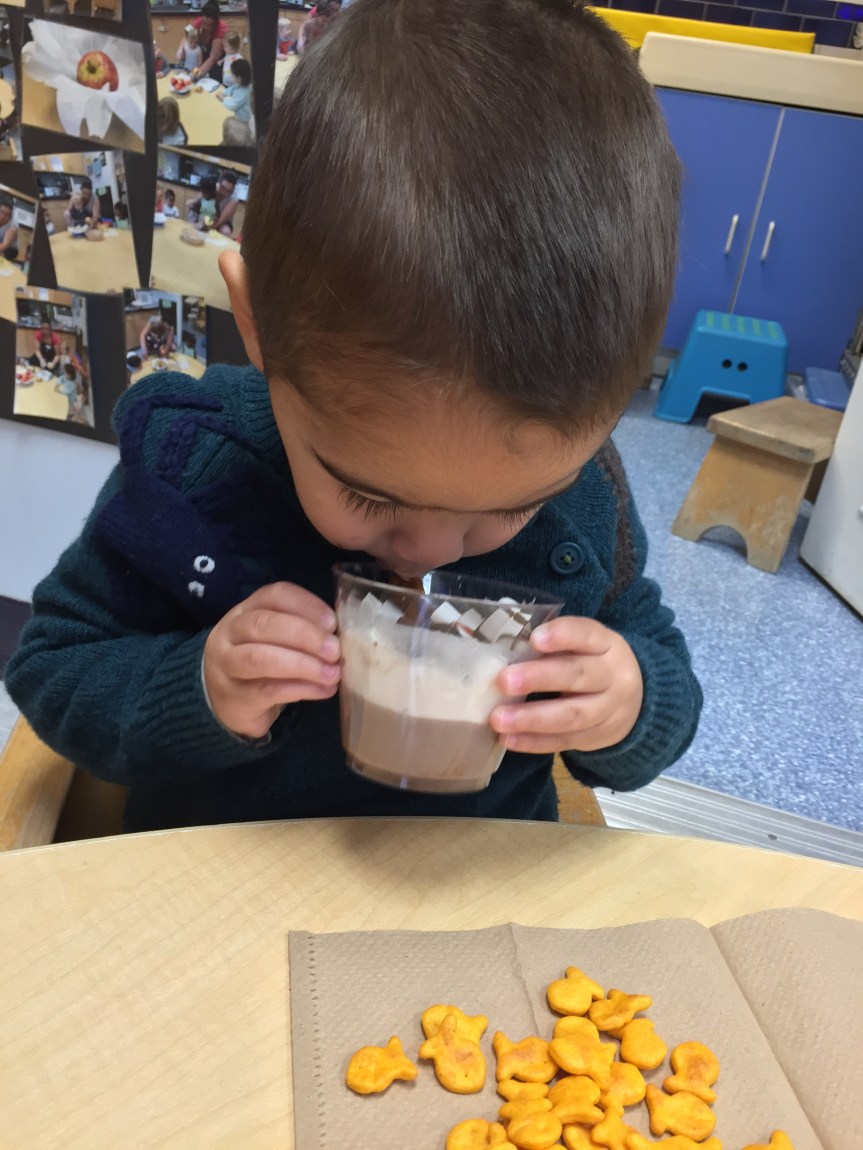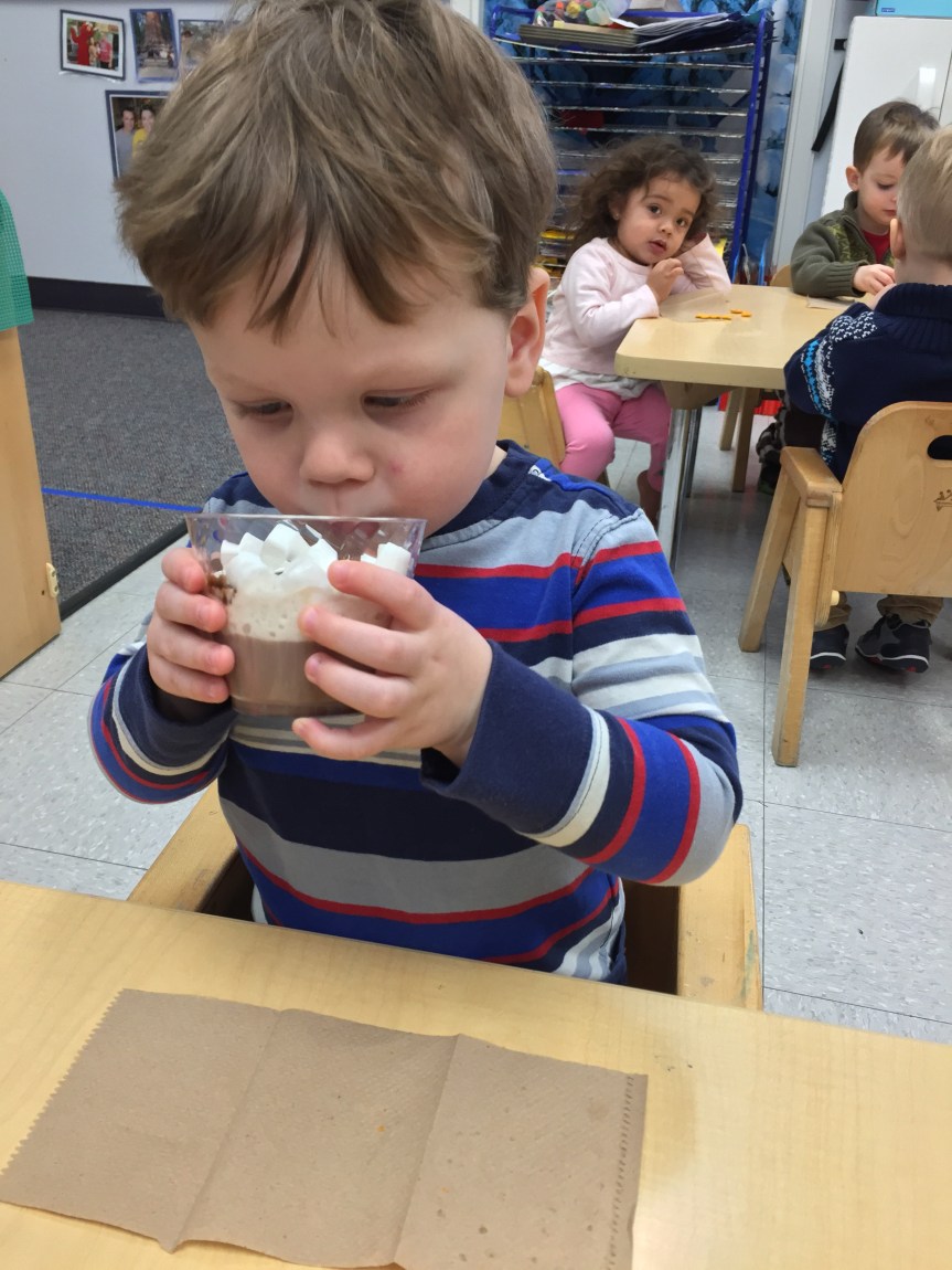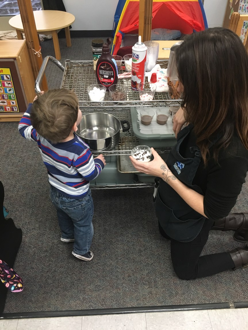 Last week Room 5 had a rockin’ hot cocoa bar with our morning snack and got a yummy lesson in applied math and graphing at the same time! One by one everyone came up to customize their own hot cocoa cup, and afterwards we voted on our favorite topping. We learned new vocabulary, made scientific observations about which items melted and at what speed (marshmallows take longer to melt than whipped cream!), and each friend cast their vote for favorite topping on our bar graph! Whipped cream and chocolate syrup tied for first place with marshmallows just one vote behind. This might be one of our favorite ways to introduce graphing to preschoolers. What do you think?