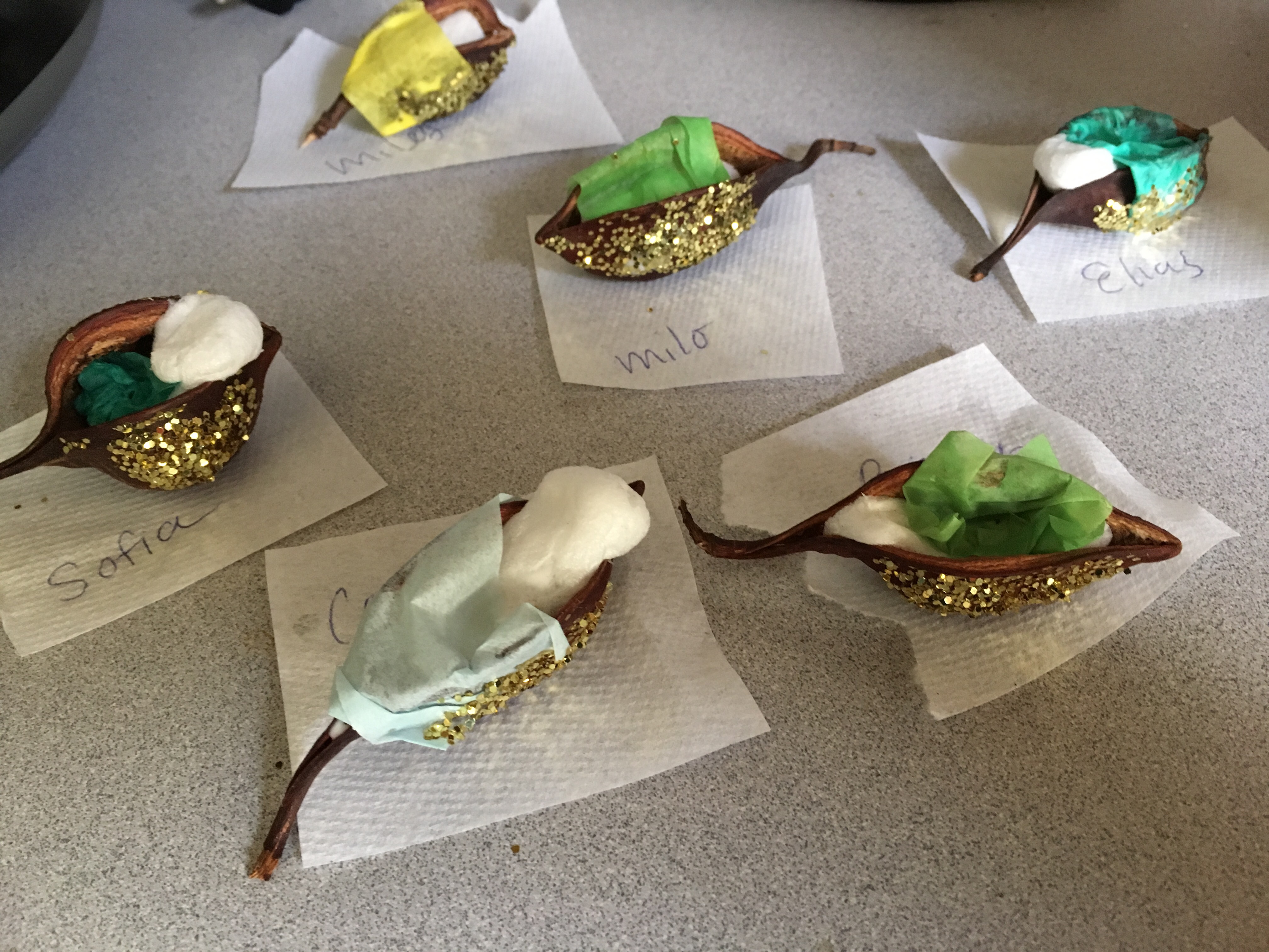 Back in December the children created sweet little baby Jesus using packaging popcorn and a seed pod as his manger. They dusted him off with gold glitter. They were thrilled to be taking baby Jesus home with them…