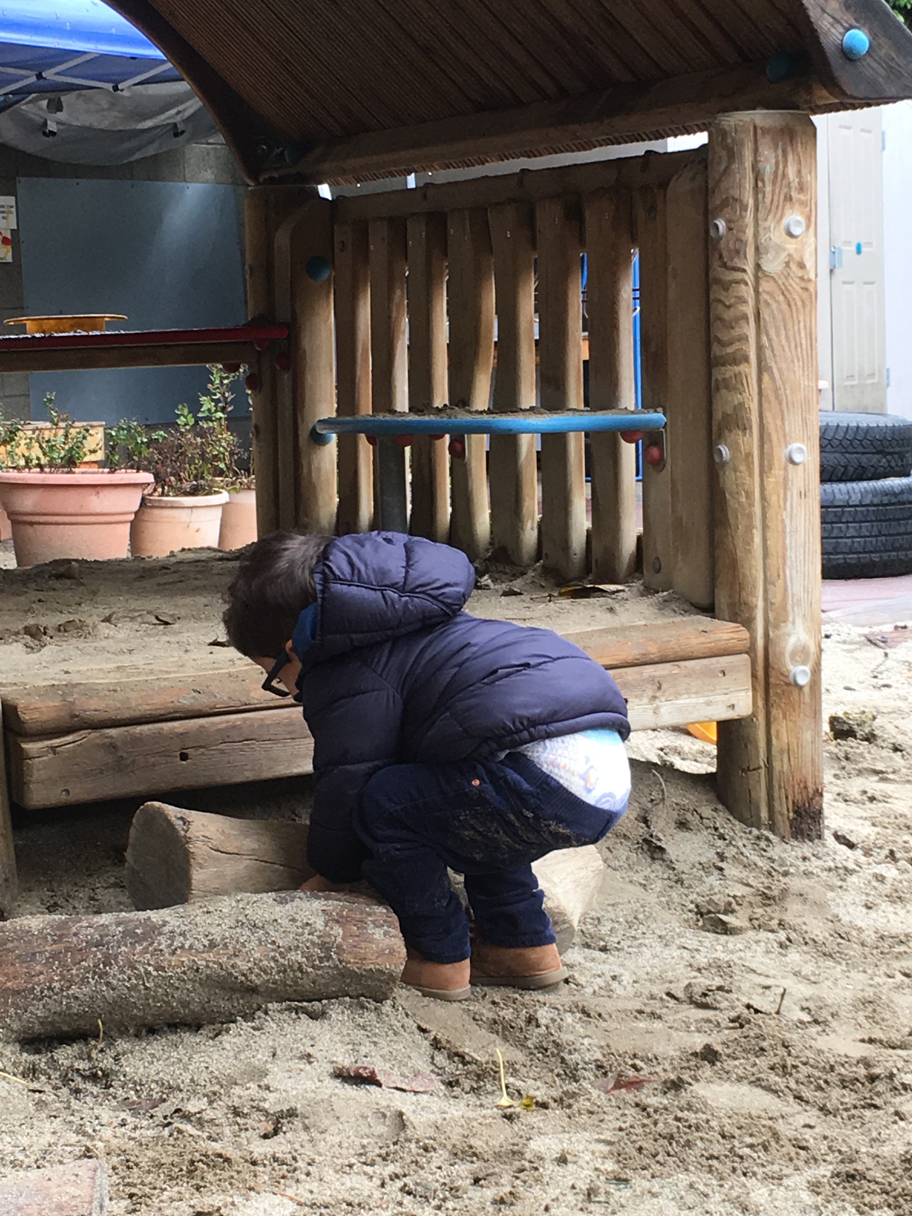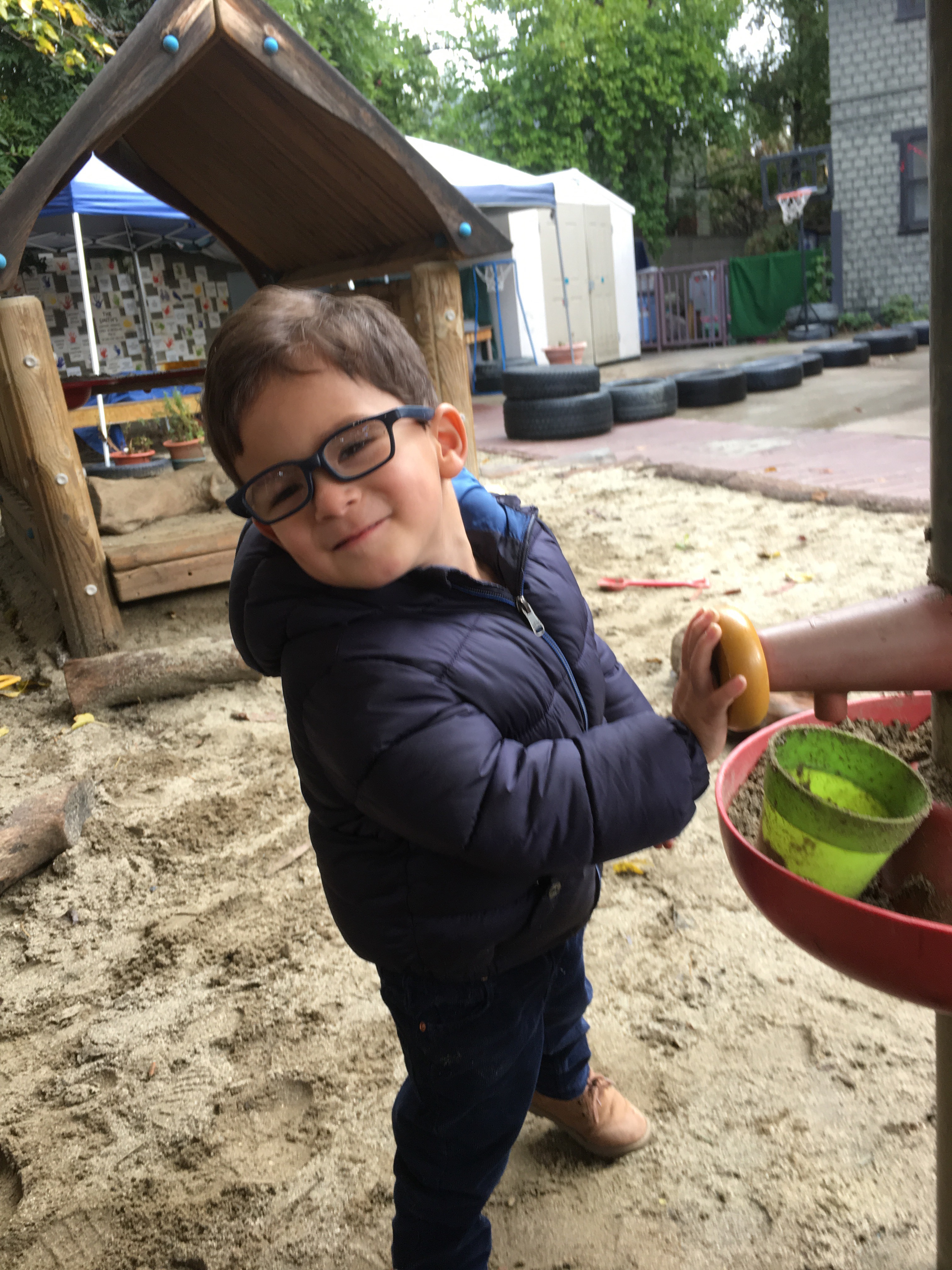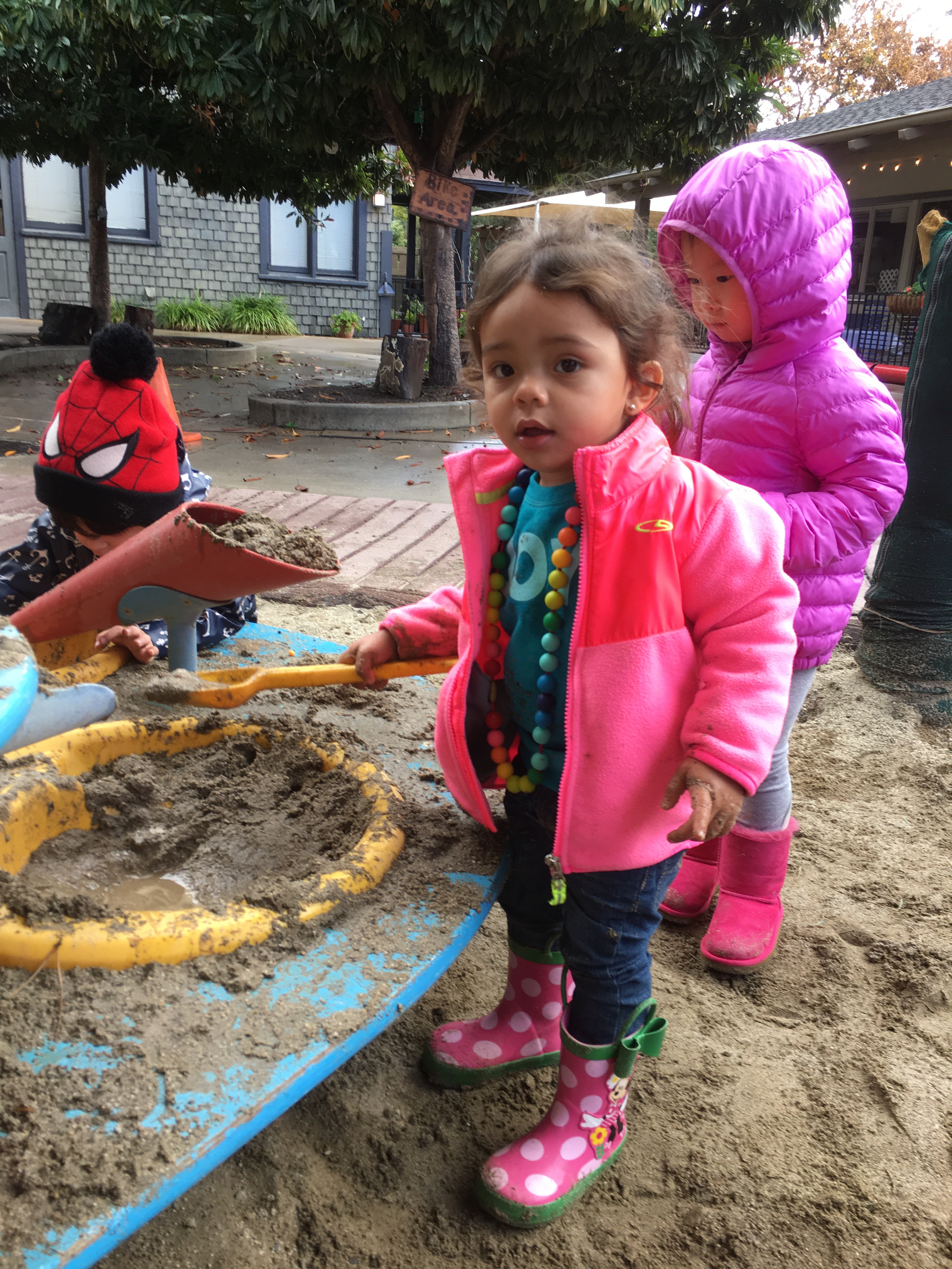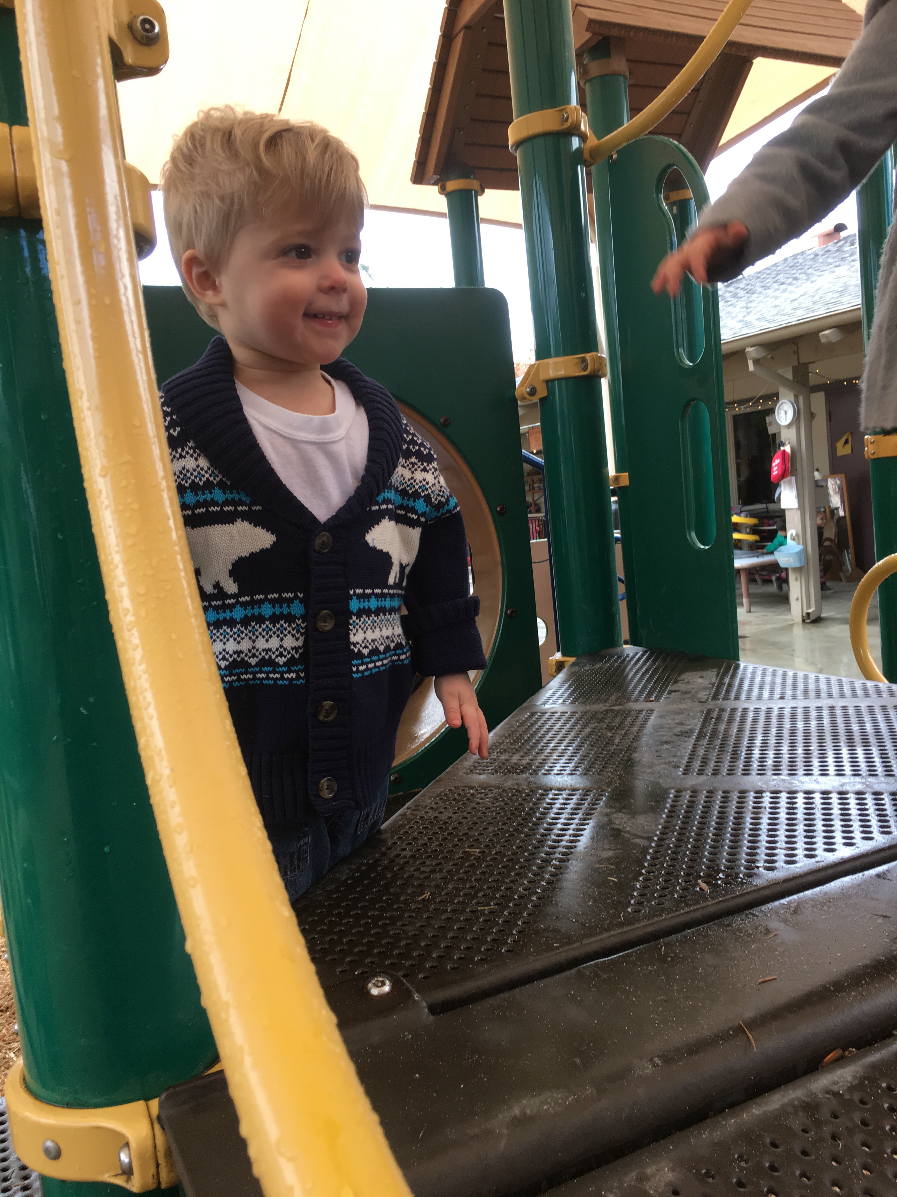 Our two-year-olds jumped right back in to the cozy routine of their classroom and warmly welcomed all our new friends to the Room 5 family! They have been eagerly awaiting their return to the big playground and we all know that two-year-olds are nothing if not tenacious negotiators… these toddlers were NOT going to let a little rain keep them from a good time! So, we layered and buttoned up and headed outside!