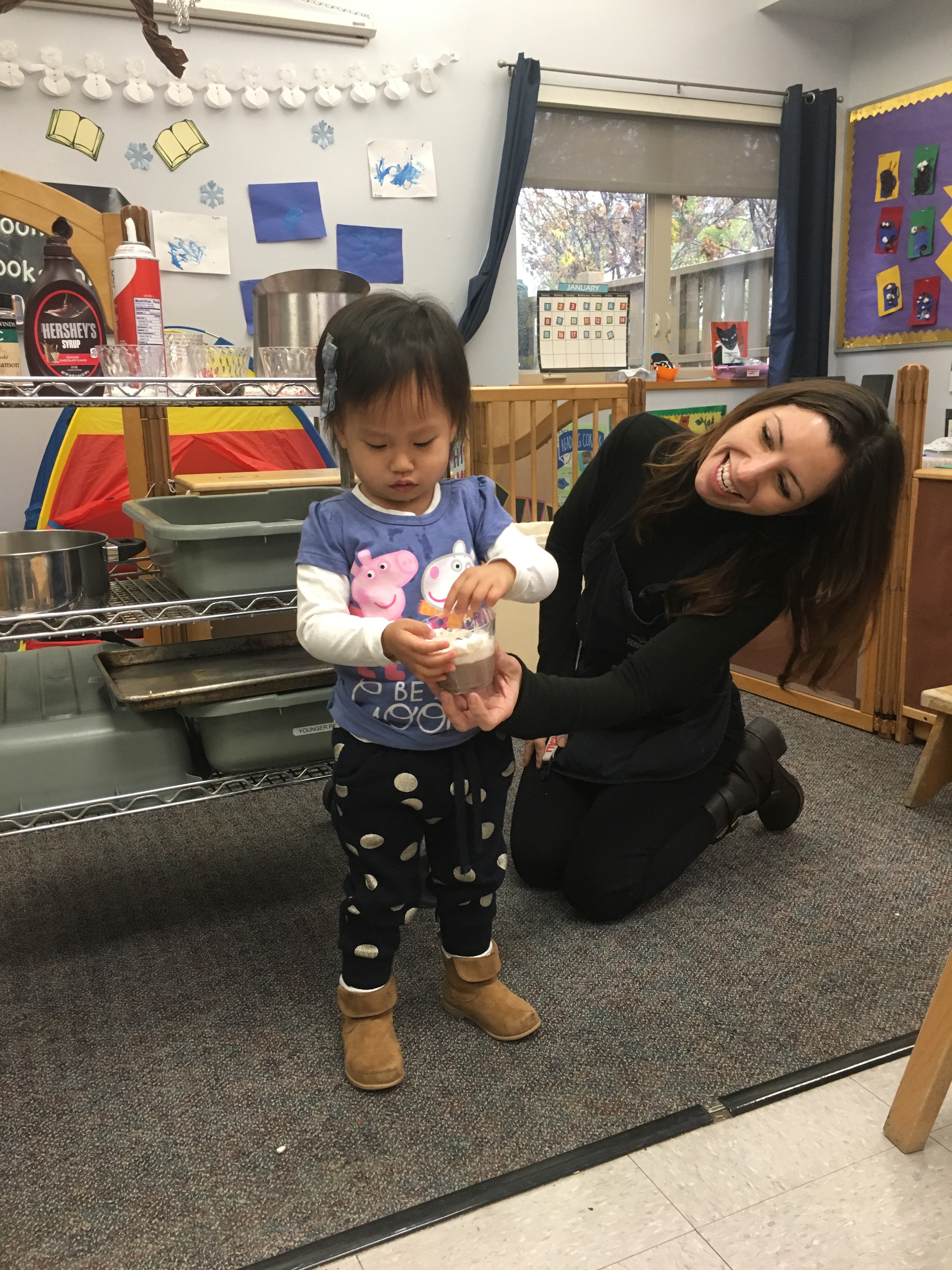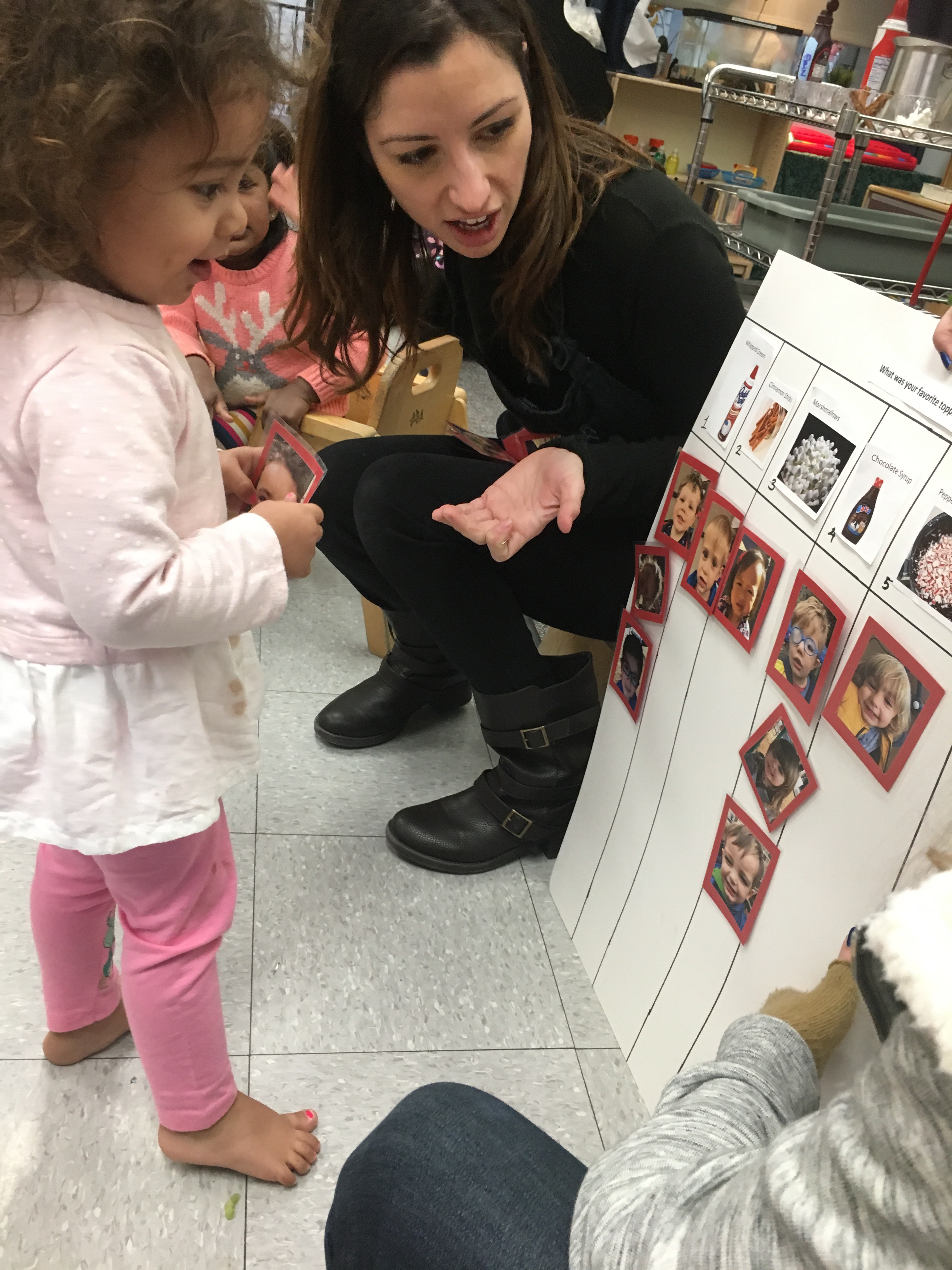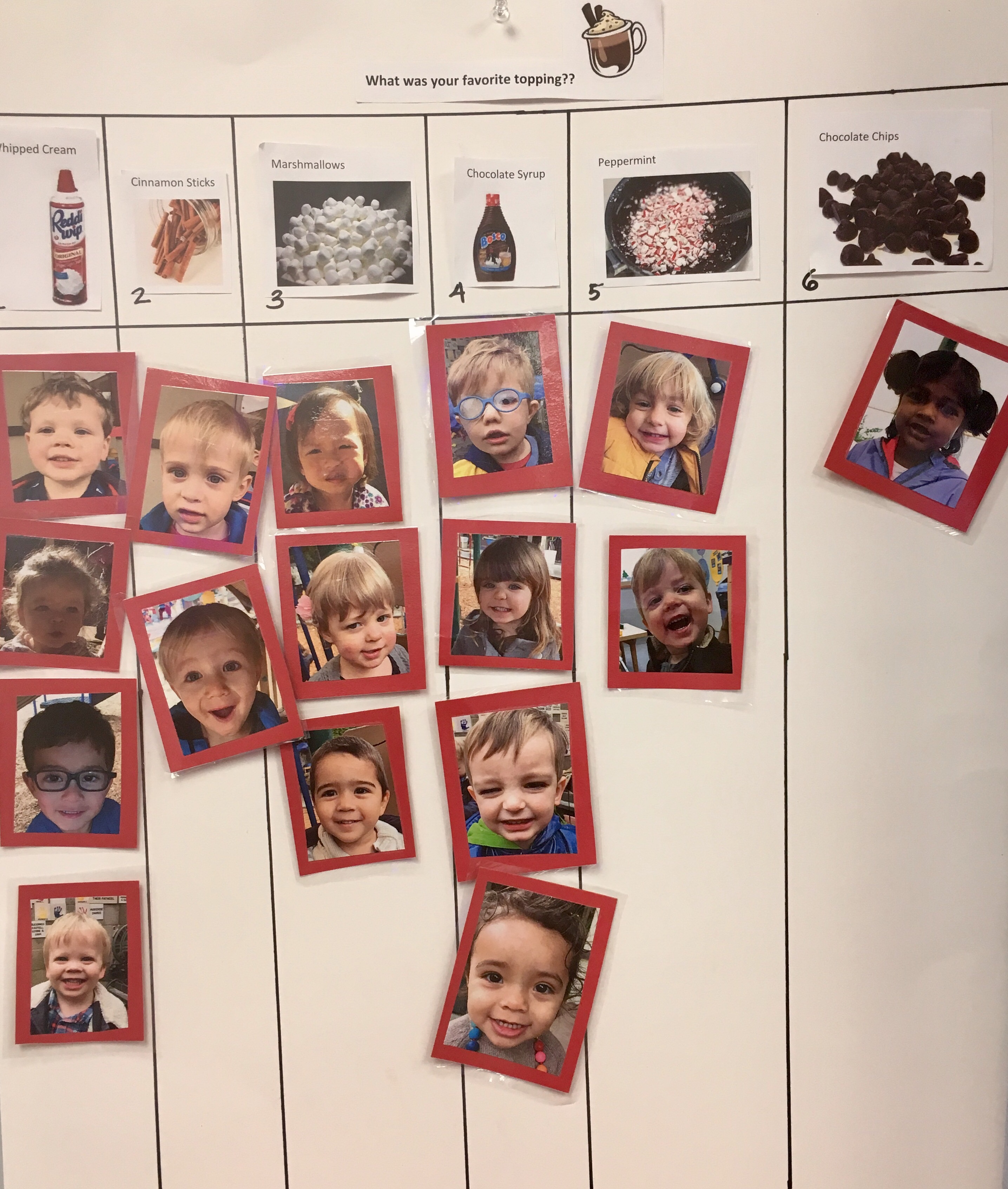 Last week Room 5 had a rockin’ hot cocoa bar with our morning snack and got a yummy lesson in applied math and graphing at the same time! One by one everyone came up to customize their own hot cocoa cup, and afterwards we voted on our favorite topping. We learned new vocabulary, made scientific observations about which items melted and at what speed (marshmallows take longer to melt than whipped cream!), and each friend cast their vote for favorite topping on our bar graph! Whipped cream and chocolate syrup tied for first place with marshmallows just one vote behind. This might be one of our favorite ways to introduce graphing to preschoolers. What do you think?