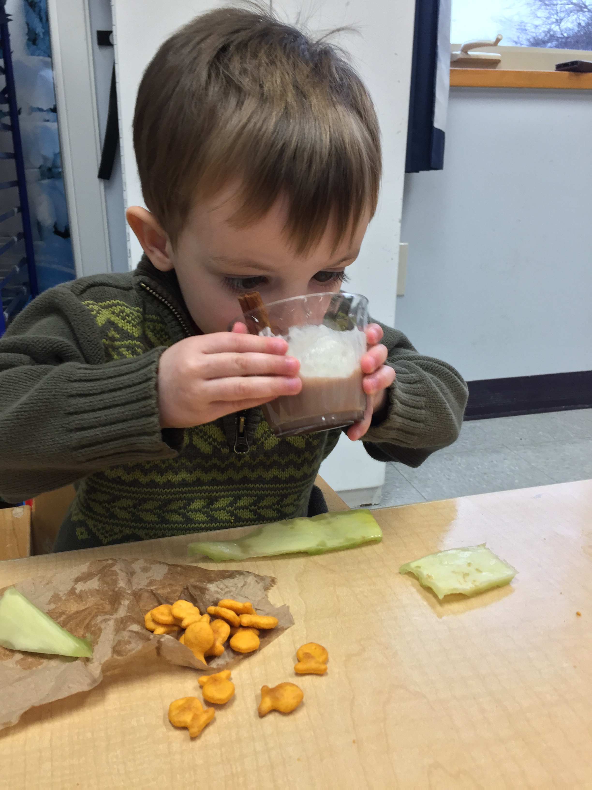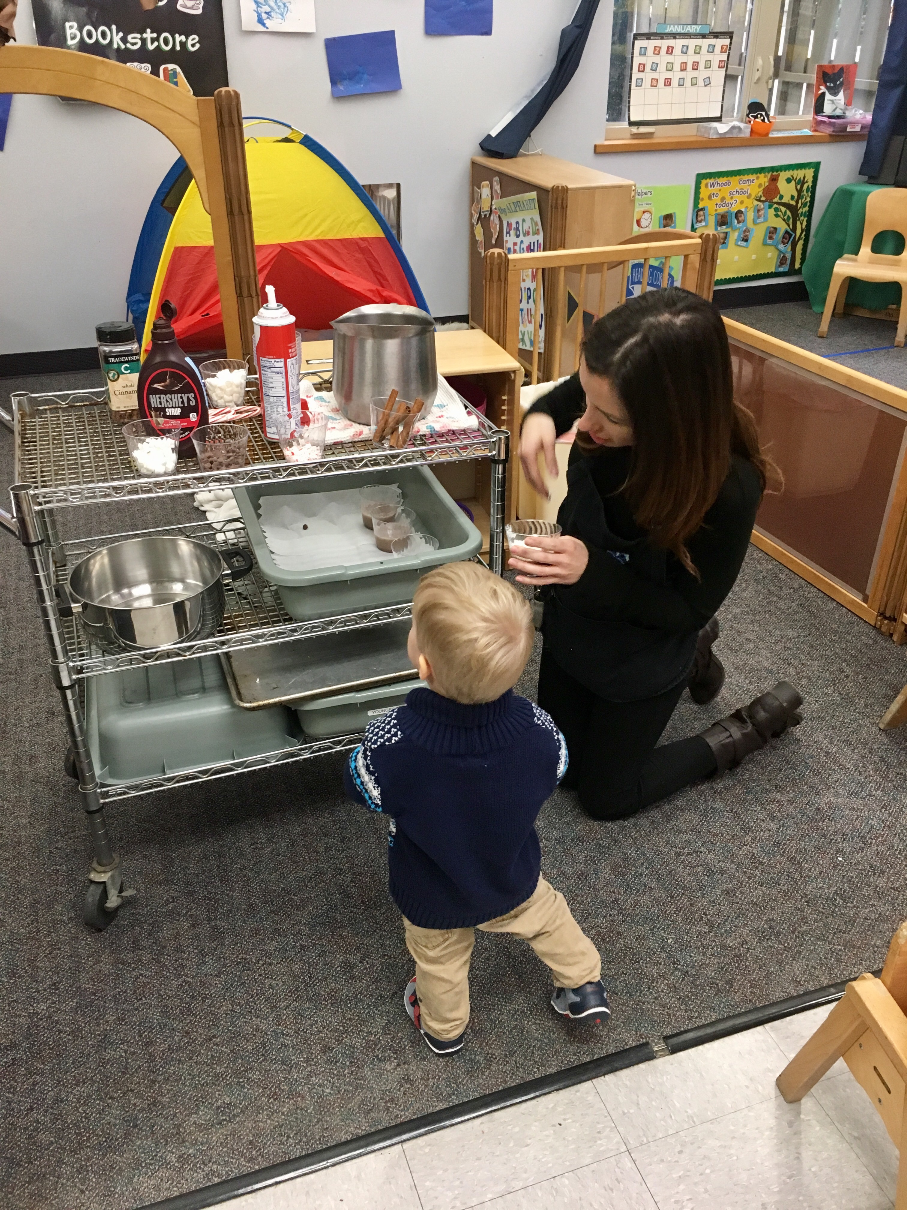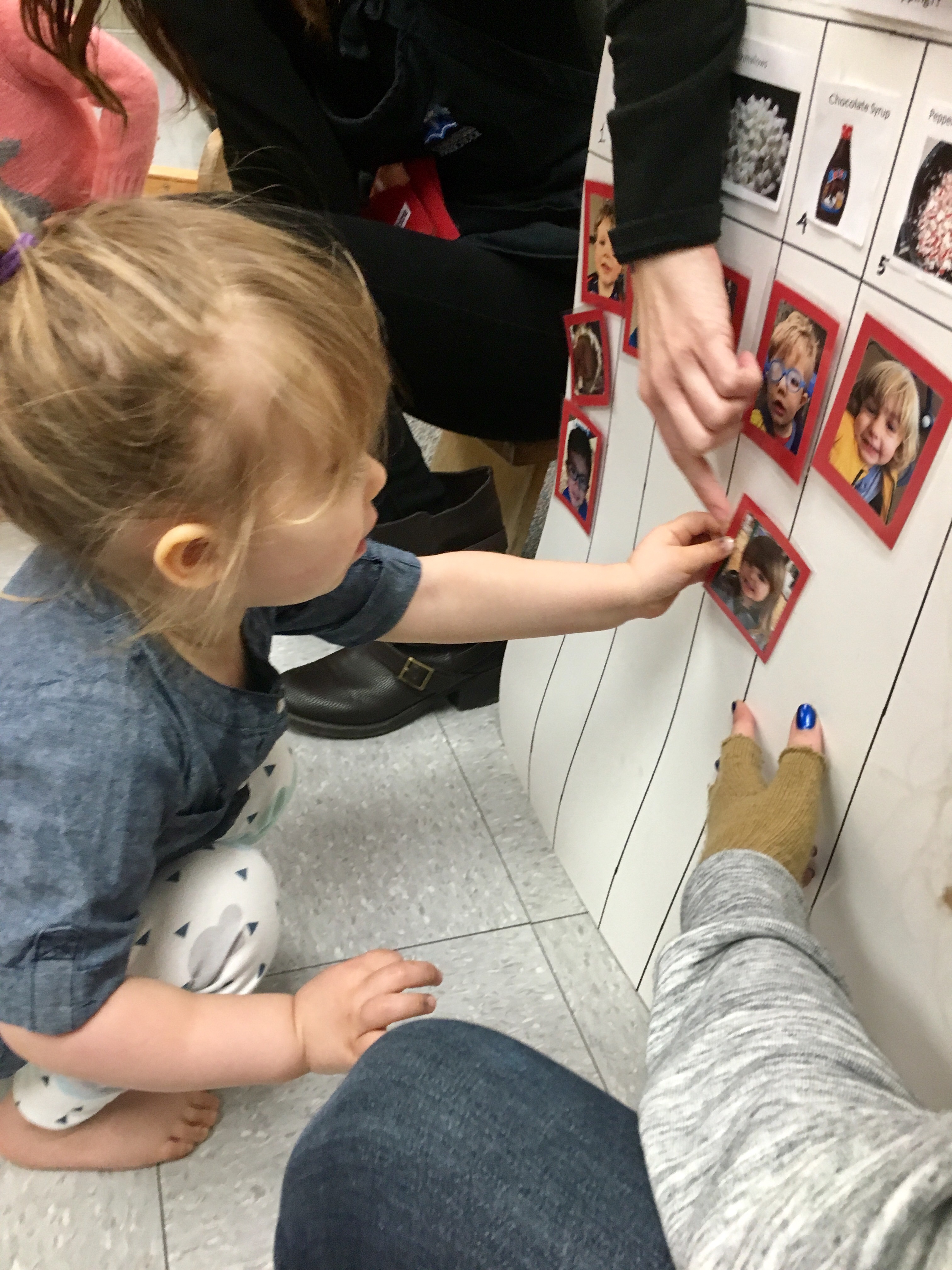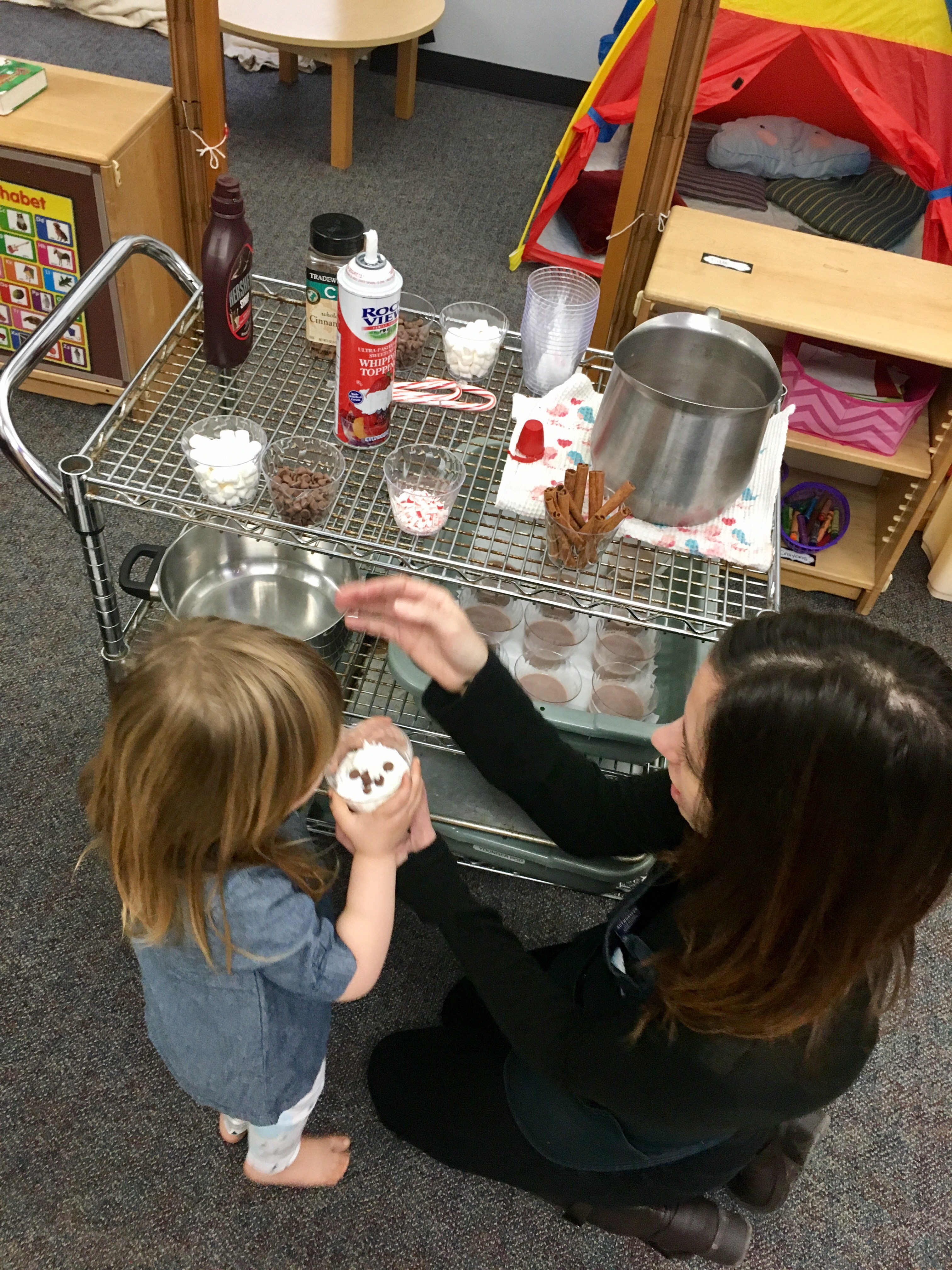 Last week Room 5 had a rockin’ hot cocoa bar with our morning snack and got a yummy lesson in applied math and graphing at the same time! One by one everyone came up to customize their own hot cocoa cup, and afterwards we voted on our favorite topping. We learned new vocabulary, made scientific observations about which items melted and at what speed (marshmallows take longer to melt than whipped cream!), and each friend cast their vote for favorite topping on our bar graph! Whipped cream and chocolate syrup tied for first place with marshmallows just one vote behind. This might be one of our favorite ways to introduce graphing to preschoolers. What do you think?