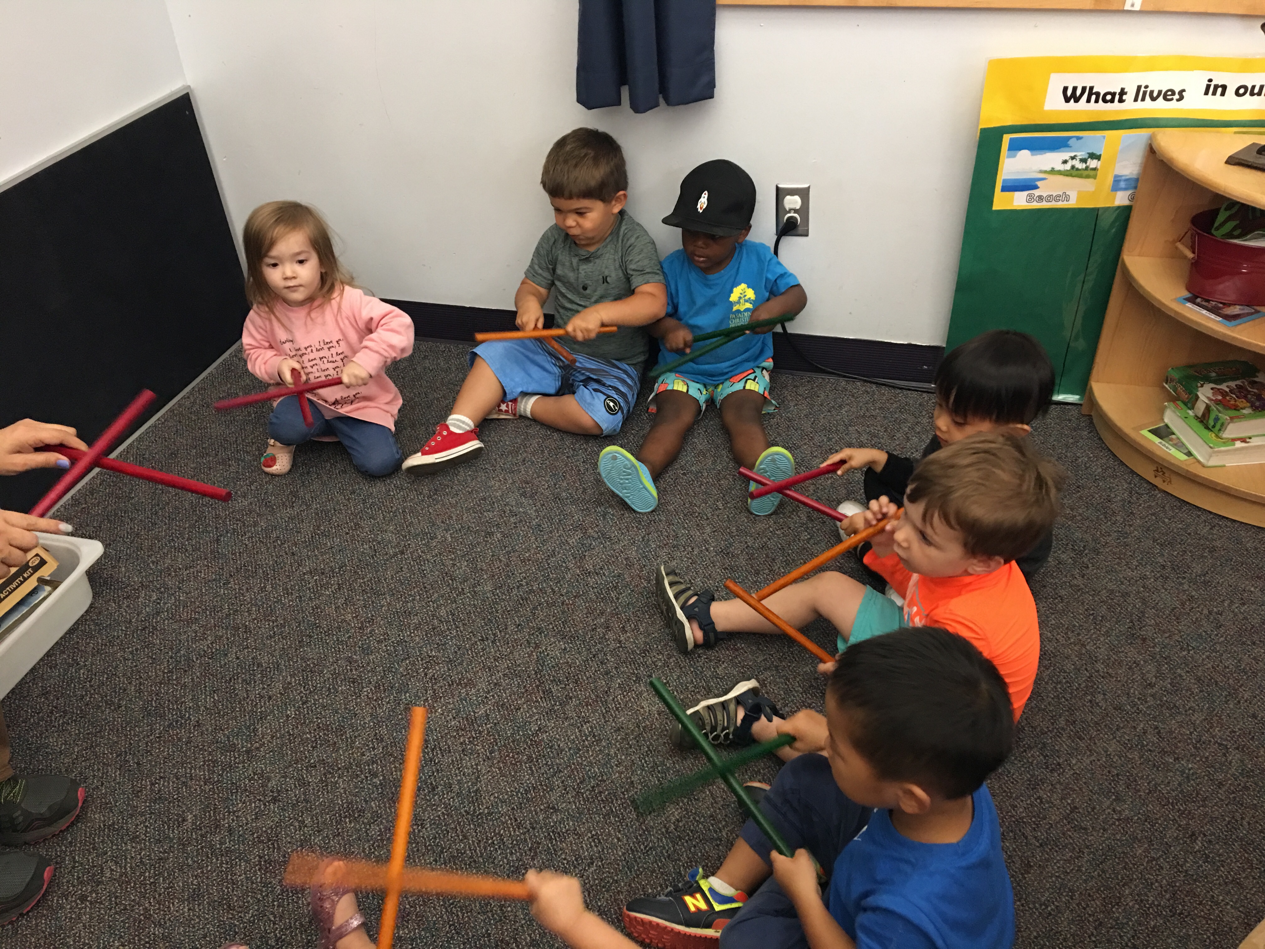 We are learning to listen and do by using rhythm sticks and the music CD by Hap Palmer. The children are getting really good at listening, following request, count the taps and keeping the beats.