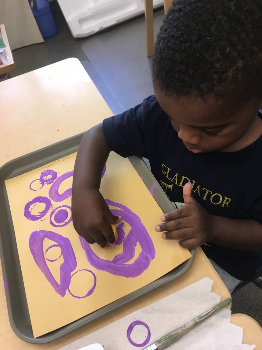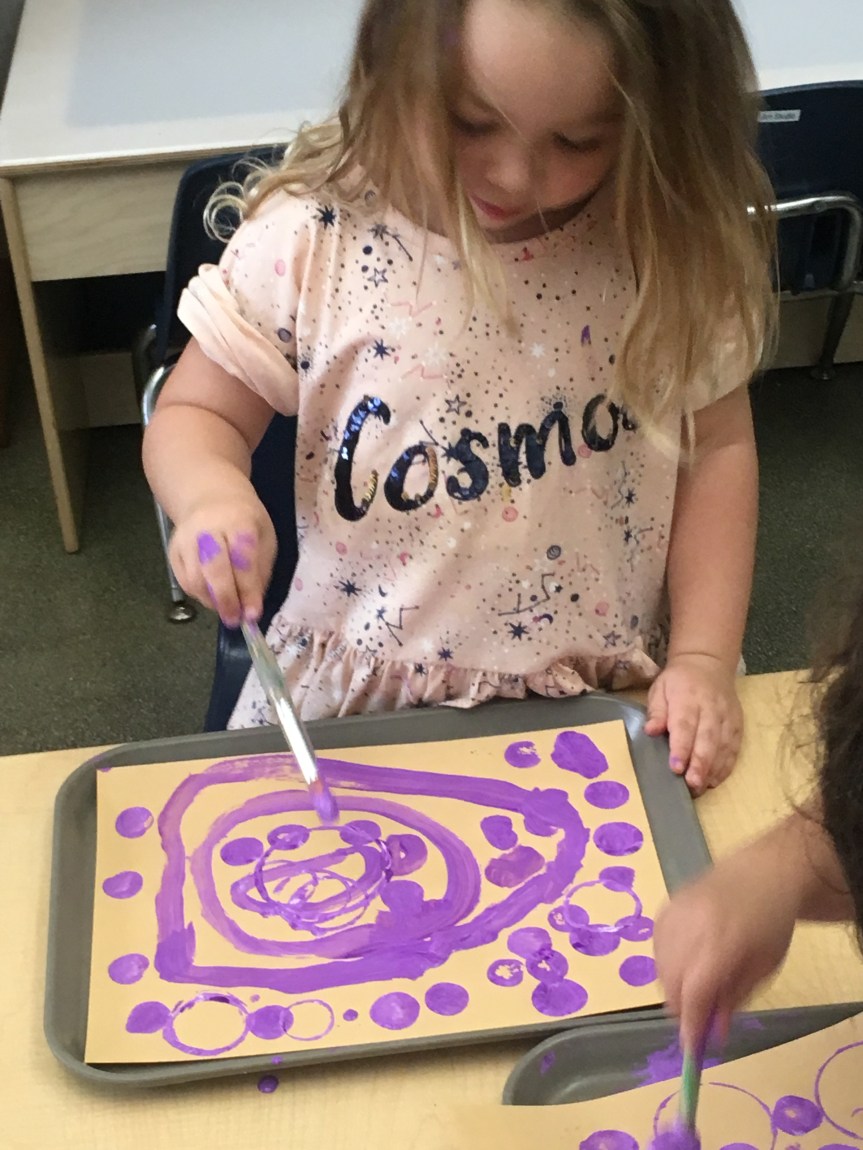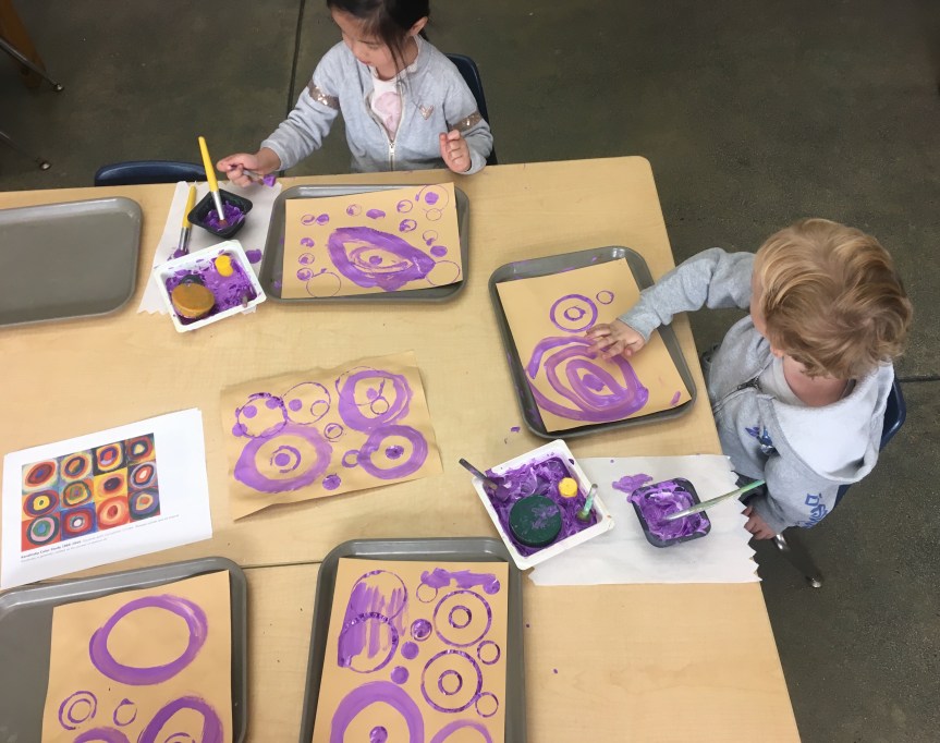 We looked at some of Kandinsky’s paintings. I also shared with them that he was credited as the pioneer of abstract art. We then focused on one of his most famous pieces, Color Study Squares with Concentric Circles, and made their own study but removing the distraction of many colors and only using 1 color. This allowed them to focus on arranging the circles across the paper. Enjoy! -Mrs. Monica