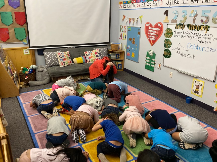 The students did such a great job at our annual Great Shake Out Earthquake Drill. At 10:17 am, on 10/17, we sounded the alarms (well…the elementary school did…the preschool simply played the “bunny in the hole” game). After we assumed the duck and cover position, we headed to the parking lot, took role call, and then continued to the PCS Field where the remainder of the drill was conducted.