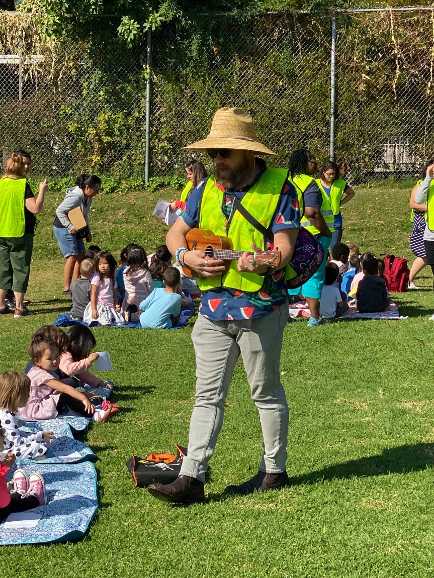 While the preschoolers enjoyed snacks and a ukulele serenade by Mr. Tim, the older students and PCS staff conducted mock scenarios of injured students being sent to first aid triage station, staff “stuck” in buildings, sidewalk/pathway closures, etc. The Pasadena Fire Department also came by with their truck to ensure we were all “safe” and to evaluate our efforts.
