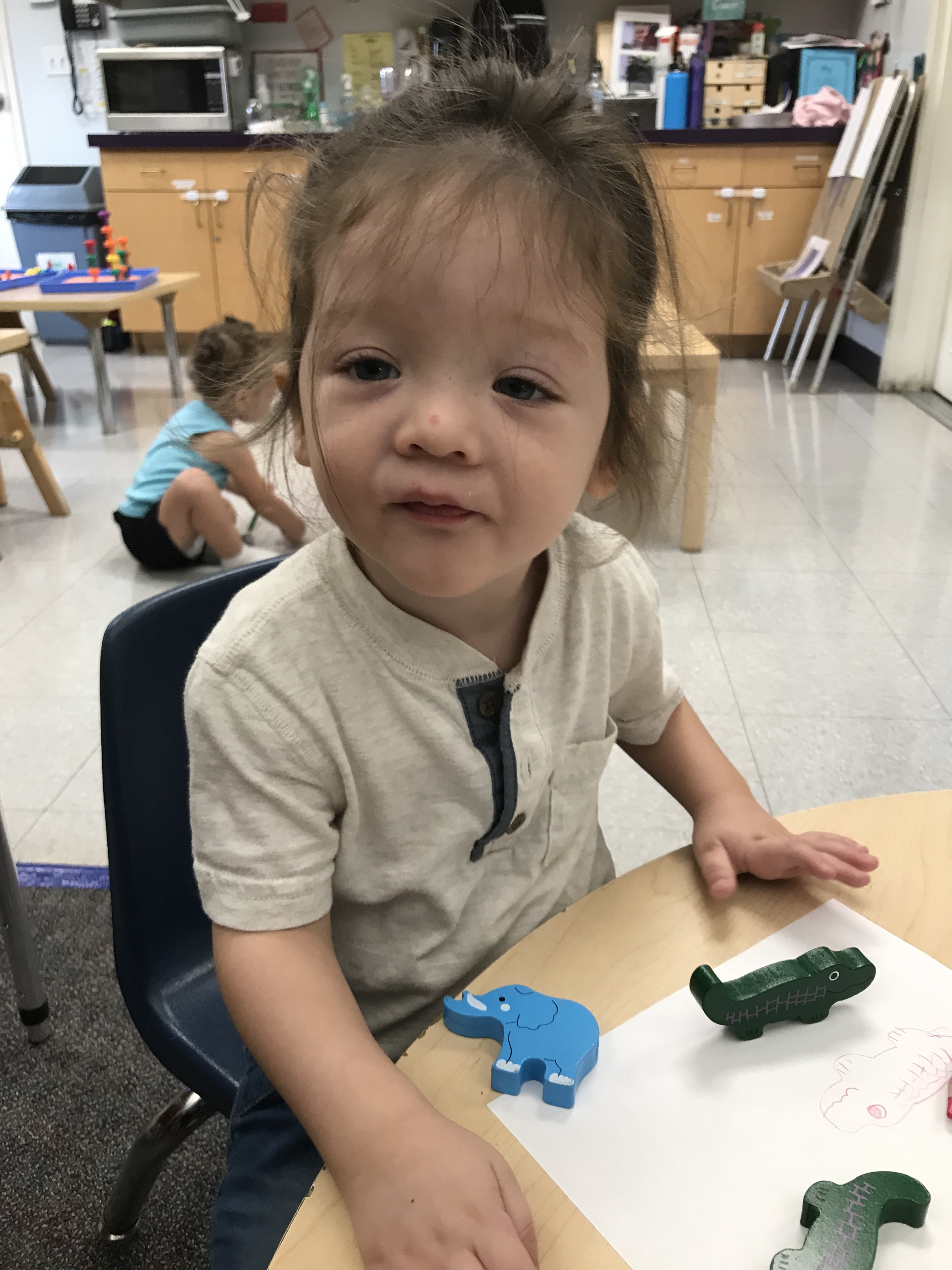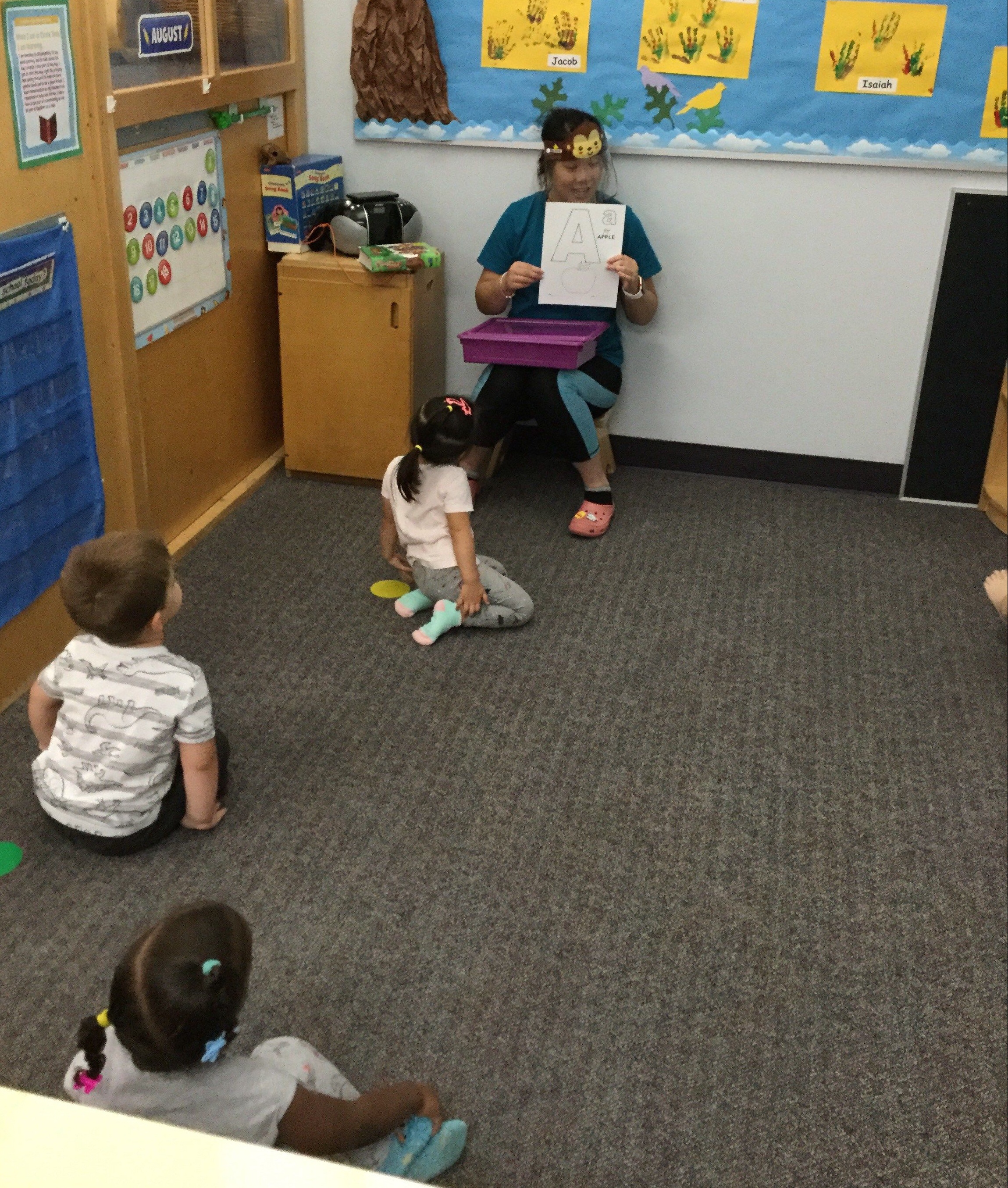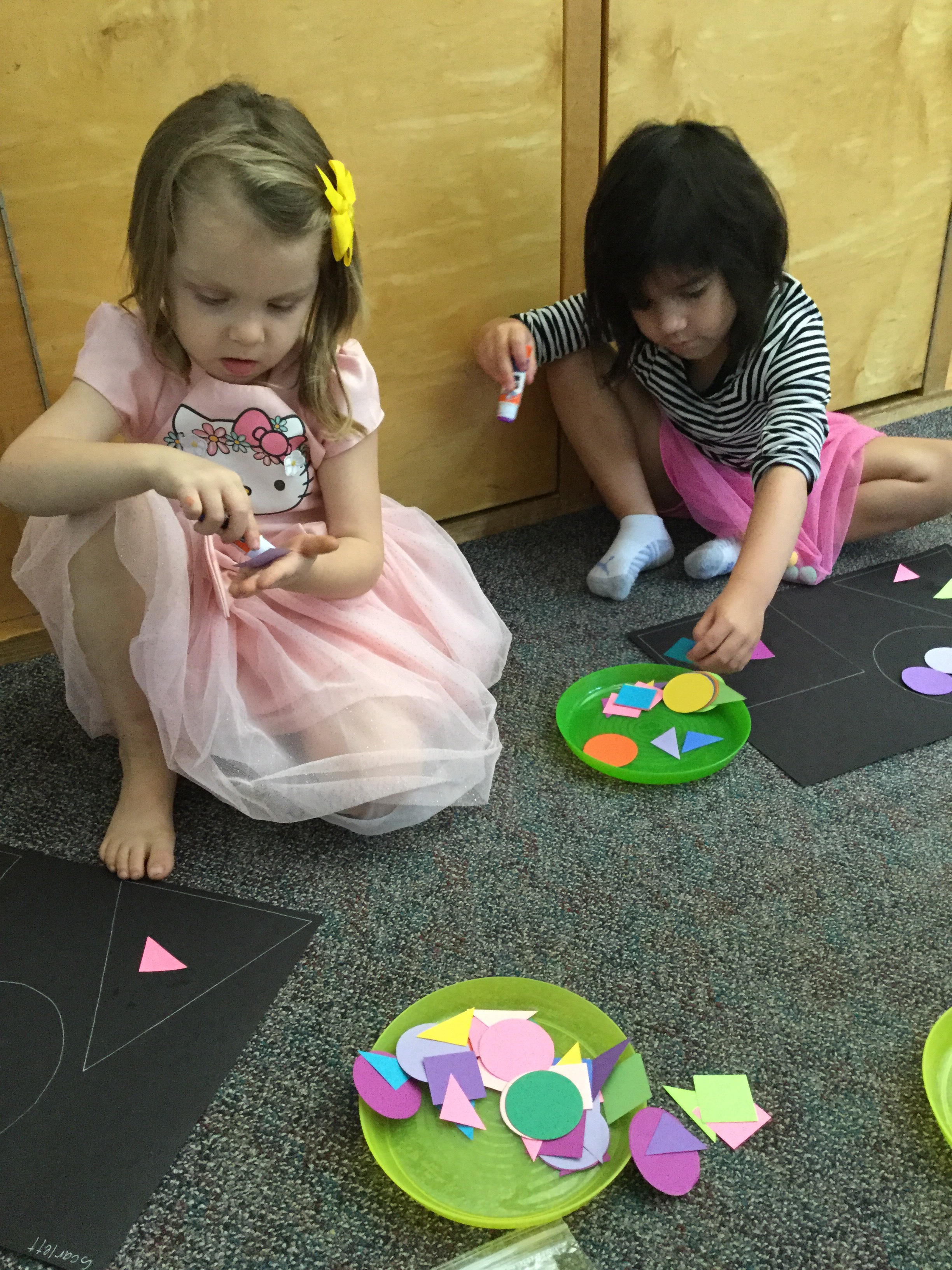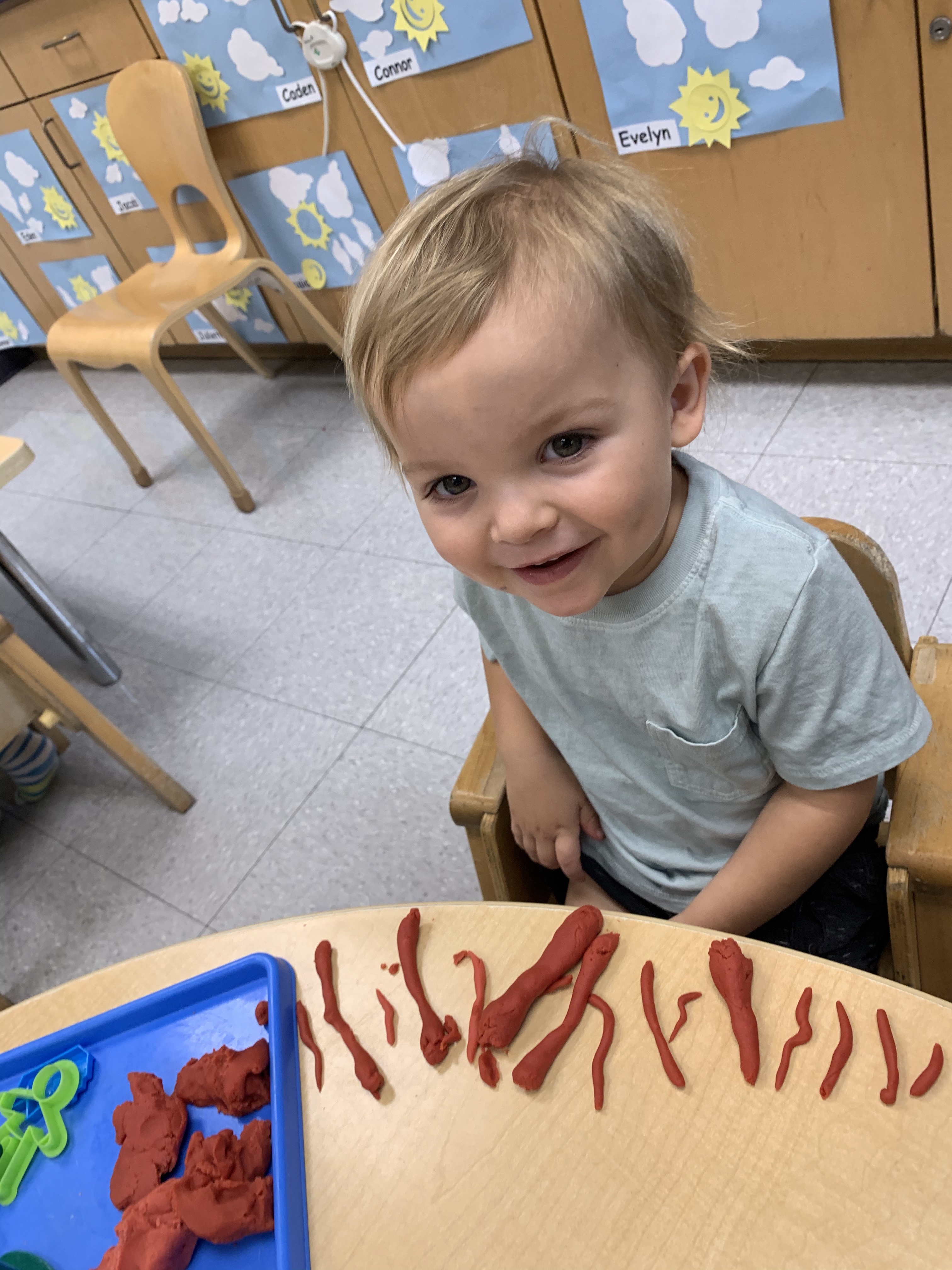 In small groups, we’ve done fun things like drawing our family portraits, shape sorting, making “shape soup,” creating shape sun catchers, apple sorting to recognize the letters Aa and Bb, dot counting, color mixing with play dough and more!