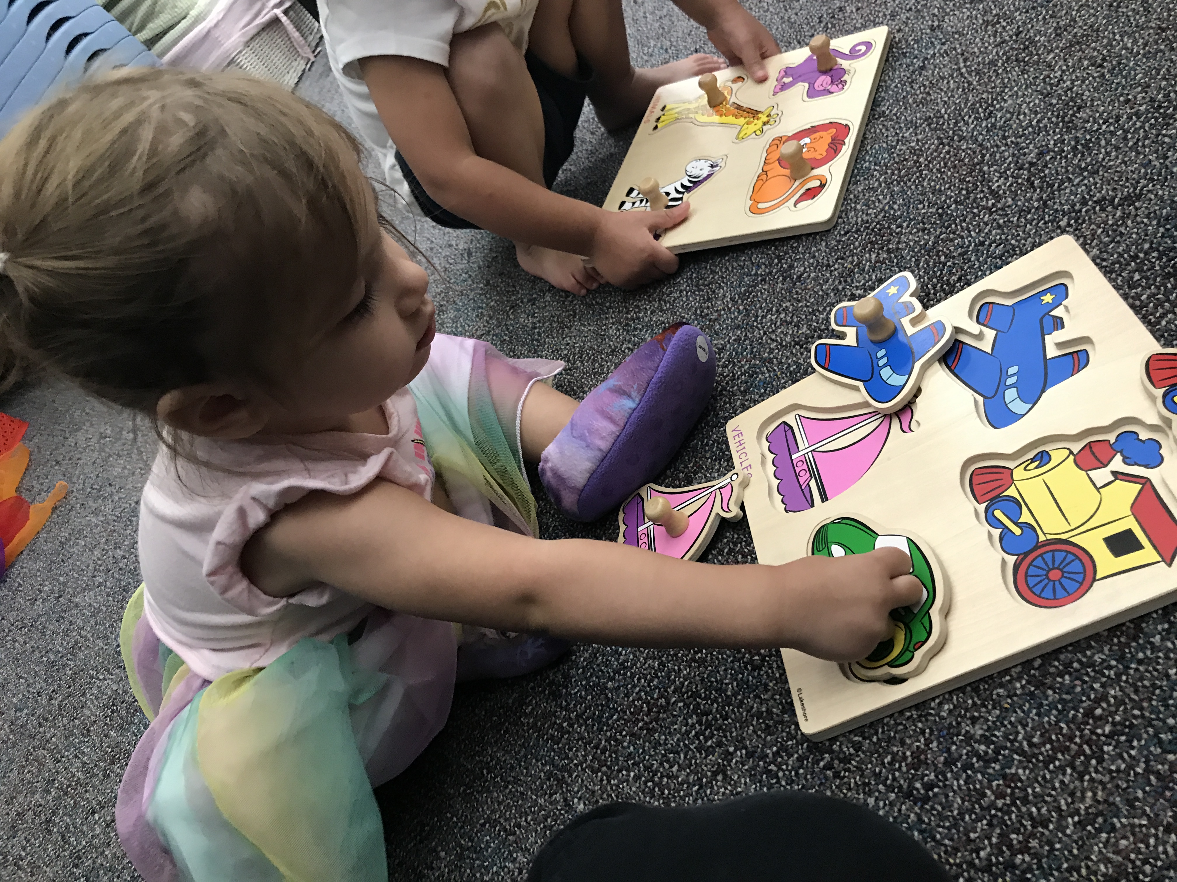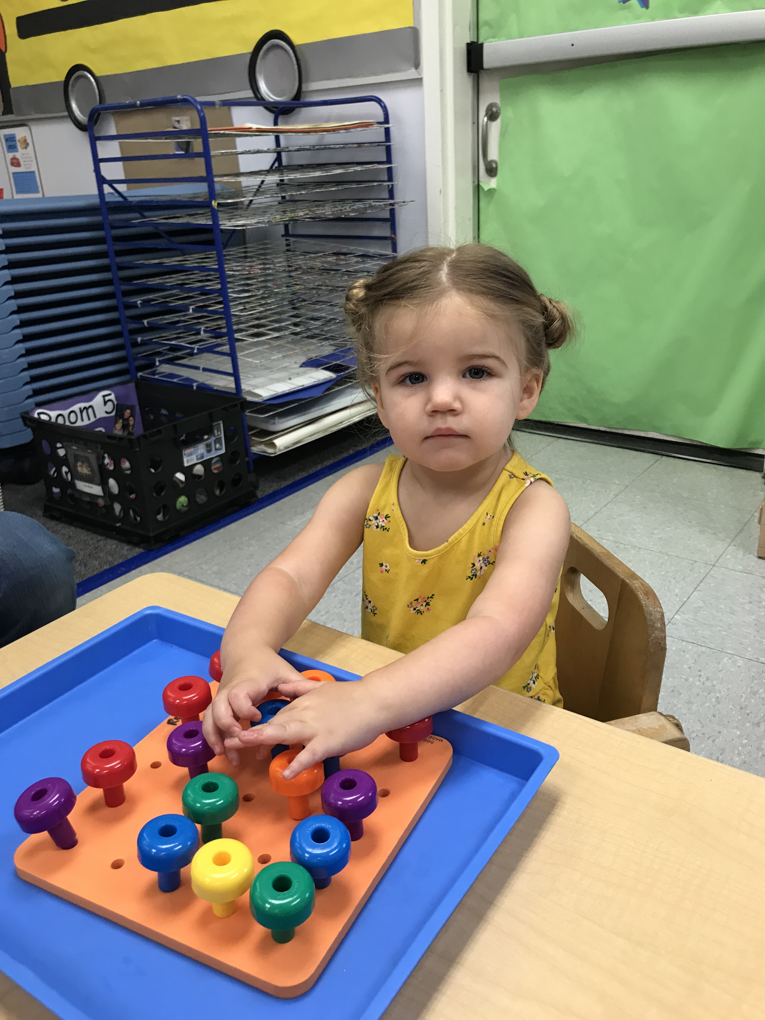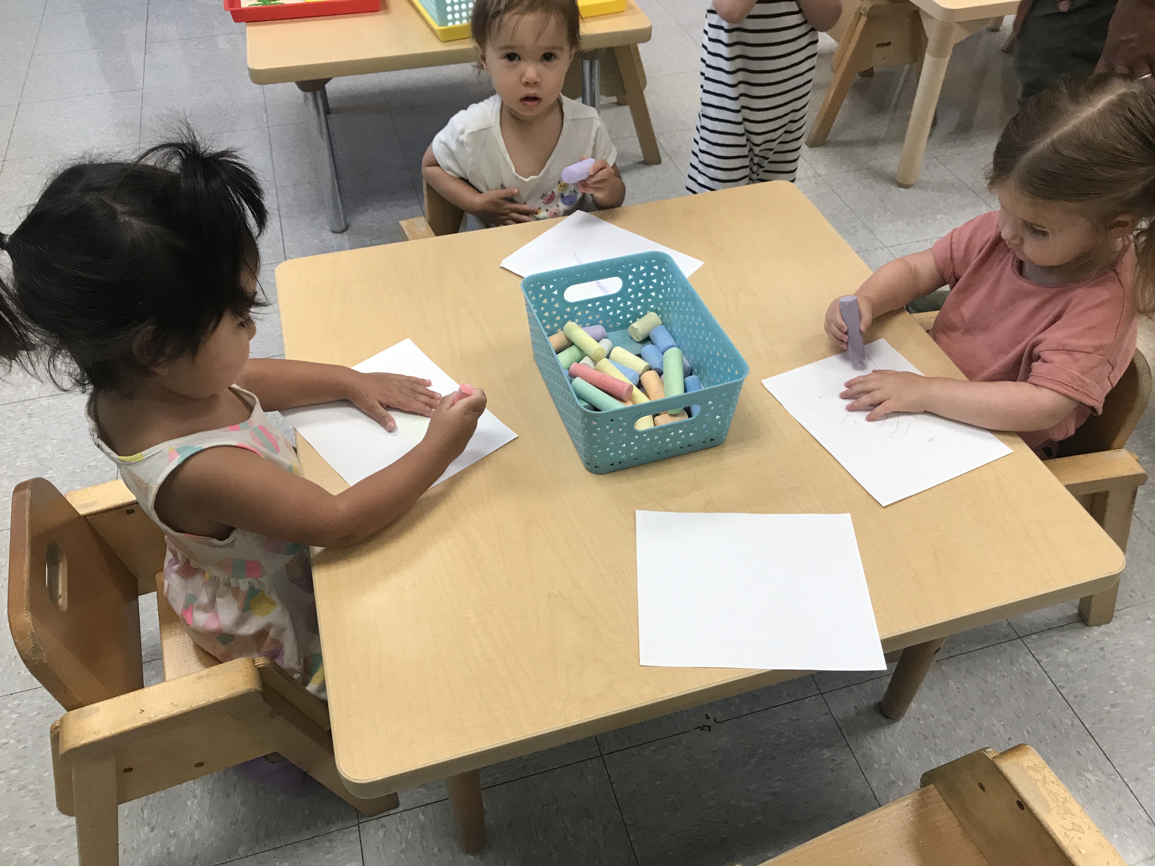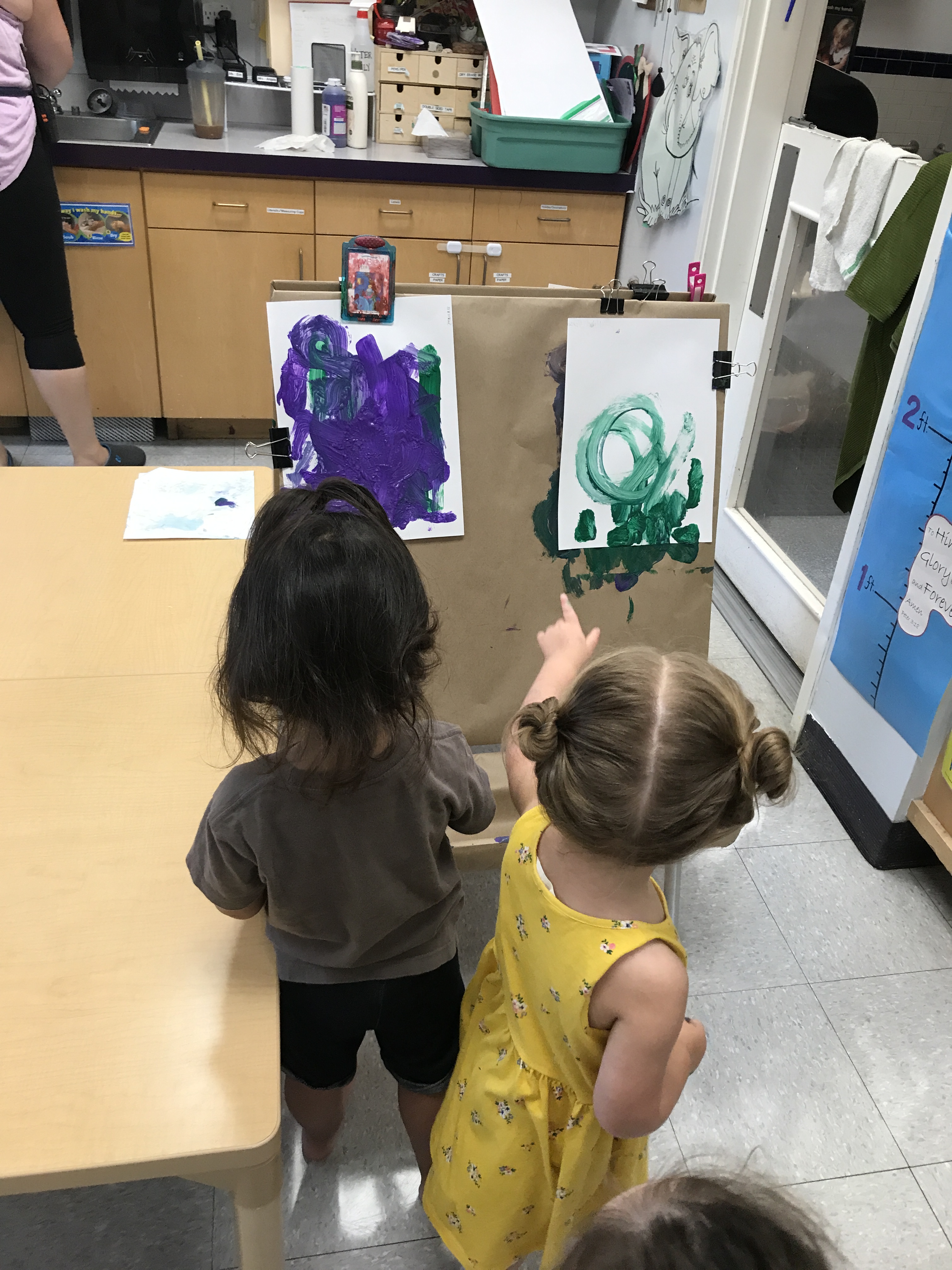 In small groups, we’ve done fun things like drawing our family portraits, shape sorting, making “shape soup,” creating shape sun catchers, apple sorting to recognize the letters Aa and Bb, dot counting, color mixing with play dough and more!