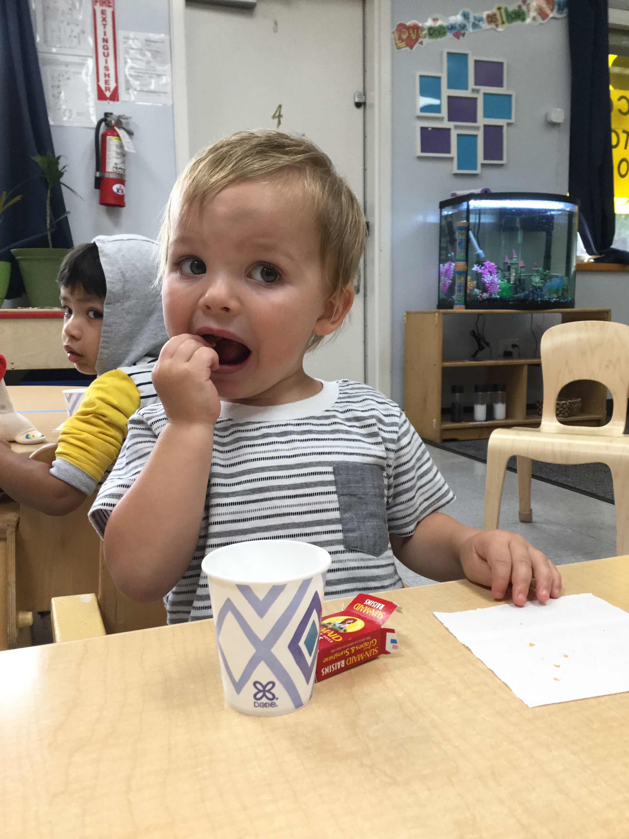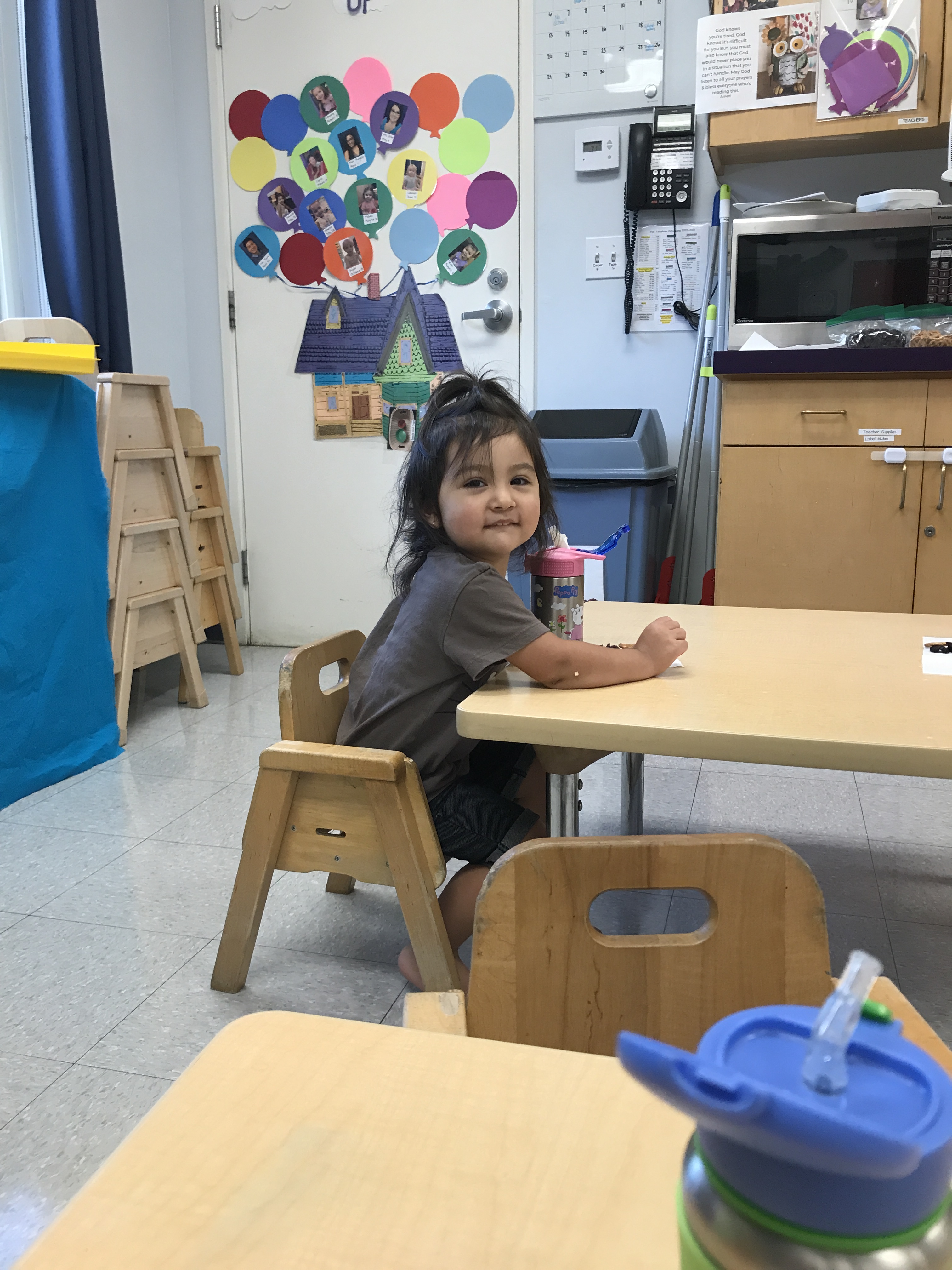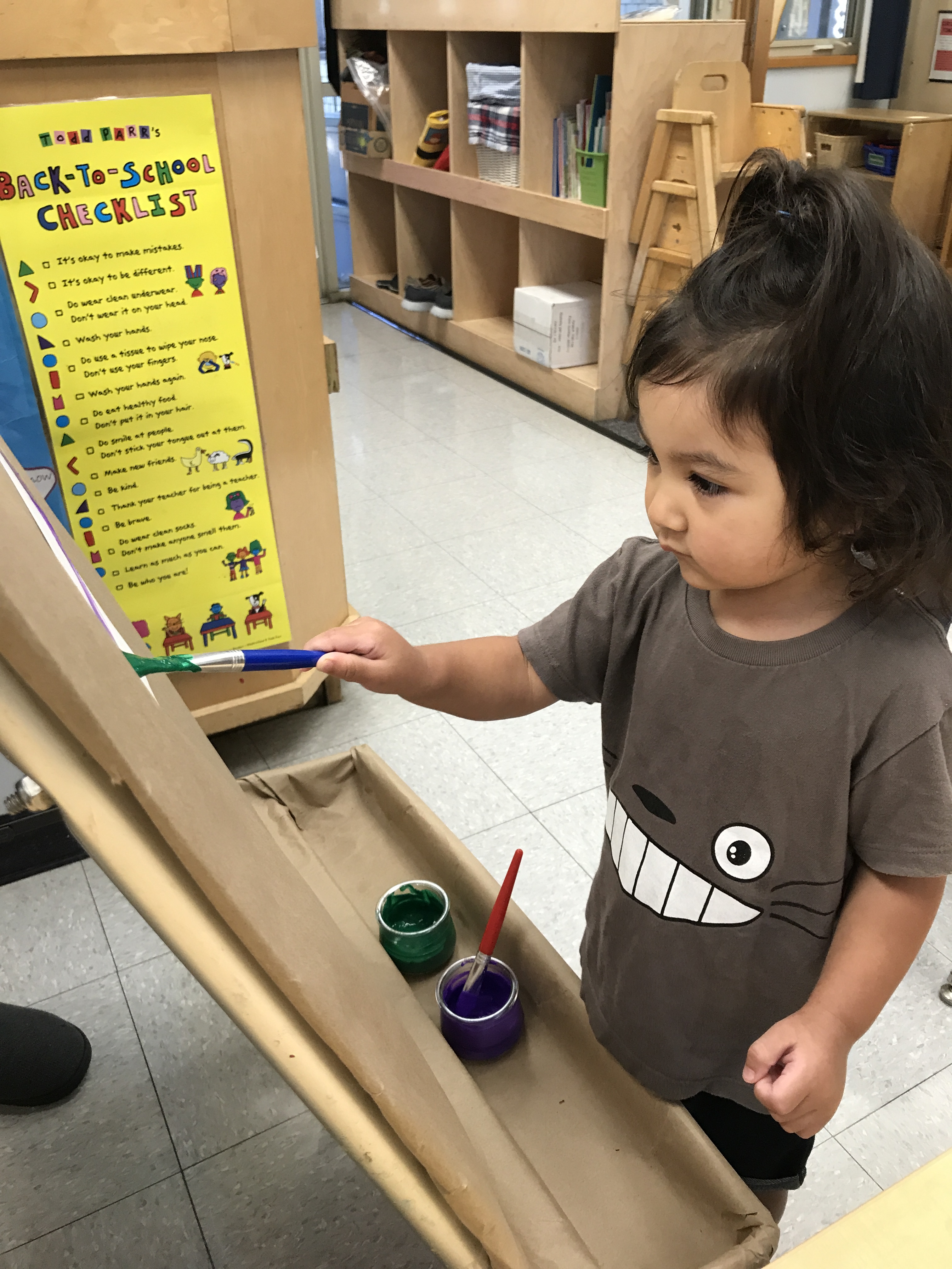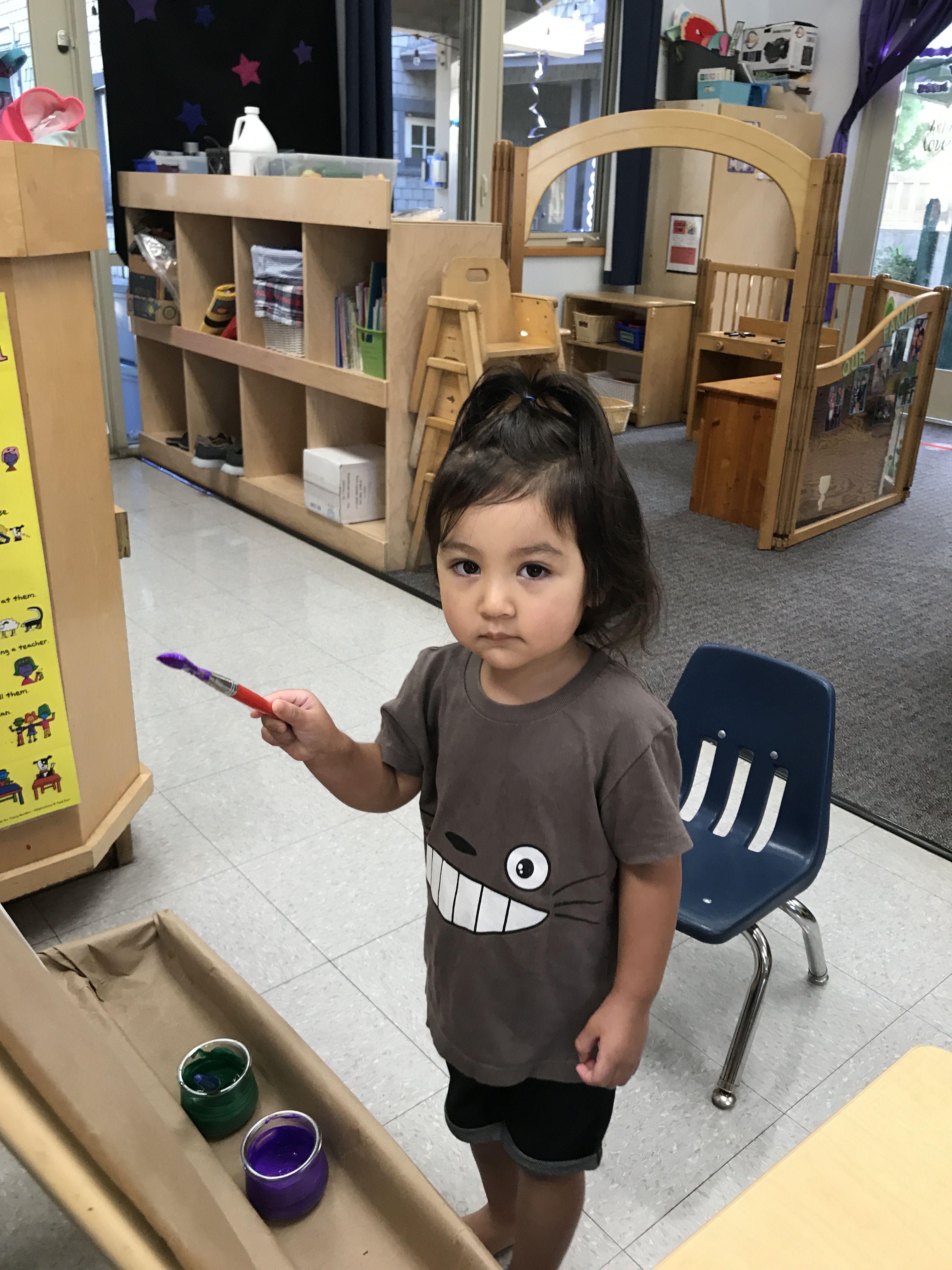 In small groups, we’ve done fun things like drawing our family portraits, shape sorting, making “shape soup,” creating shape sun catchers, apple sorting to recognize the letters Aa and Bb, dot counting, color mixing with play dough and more!