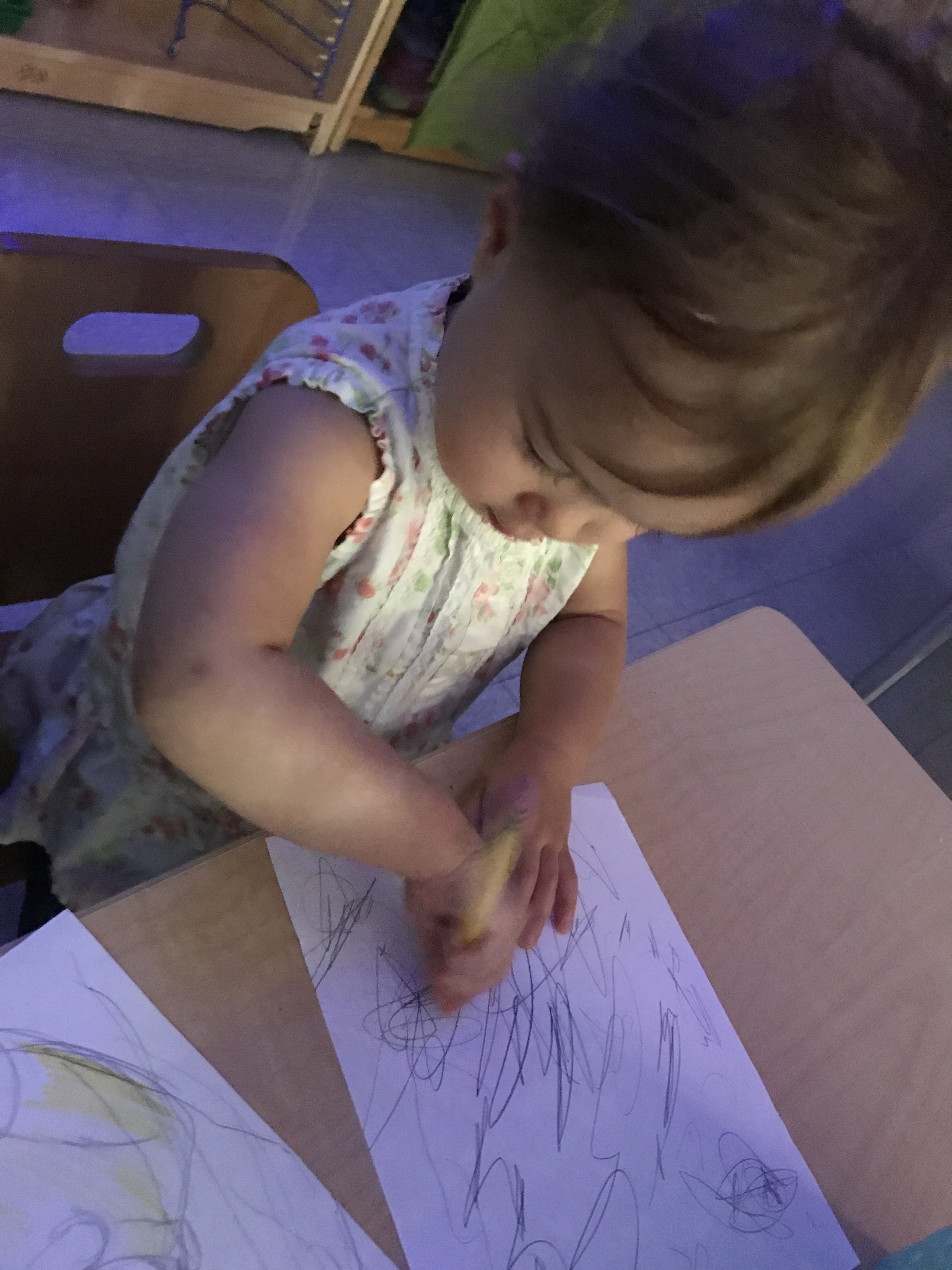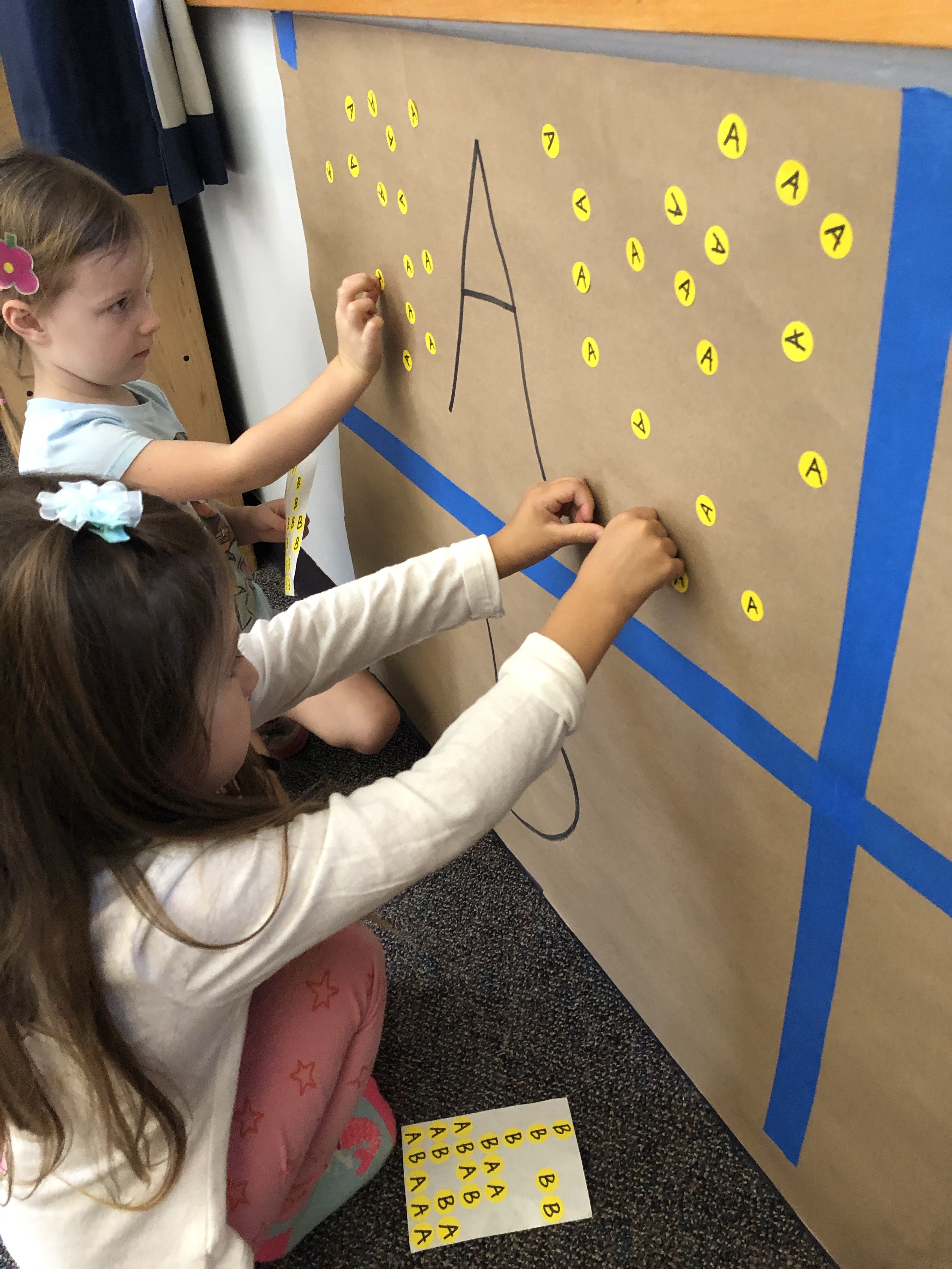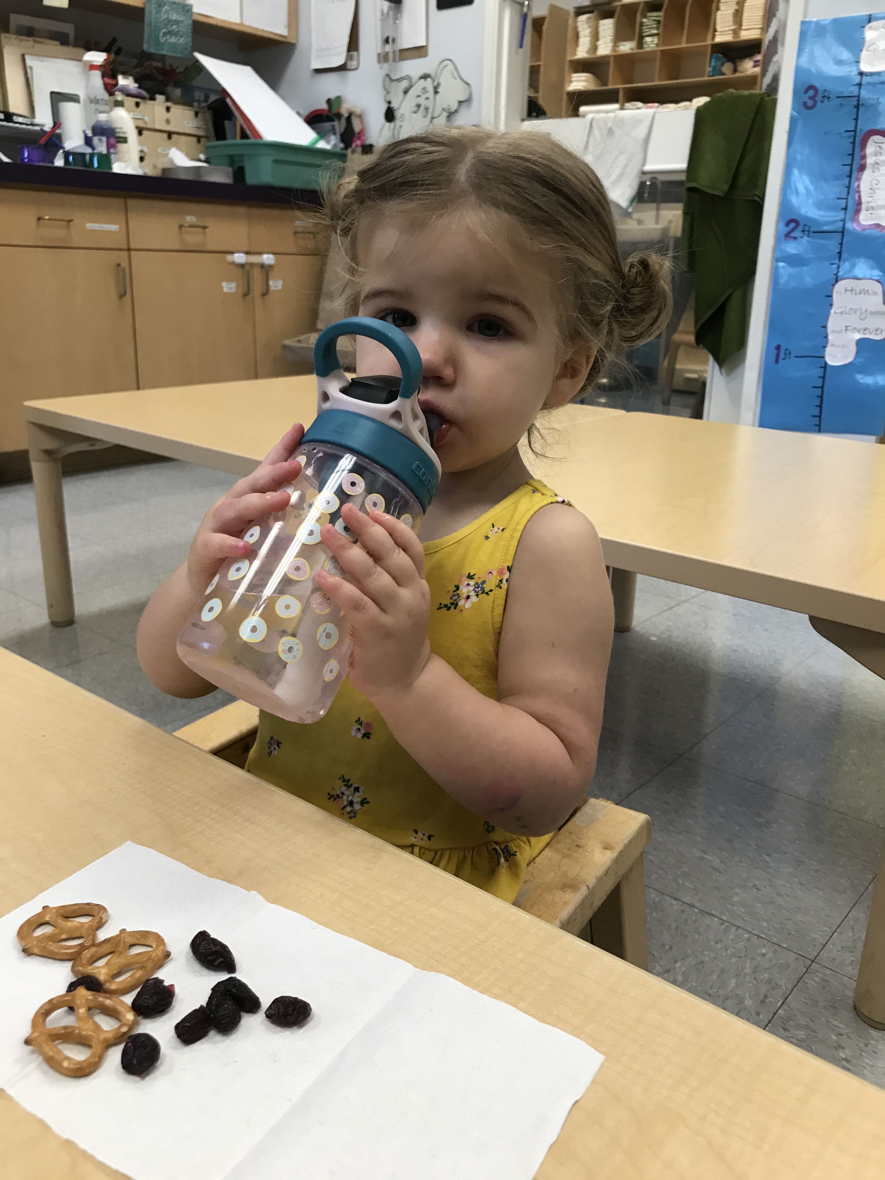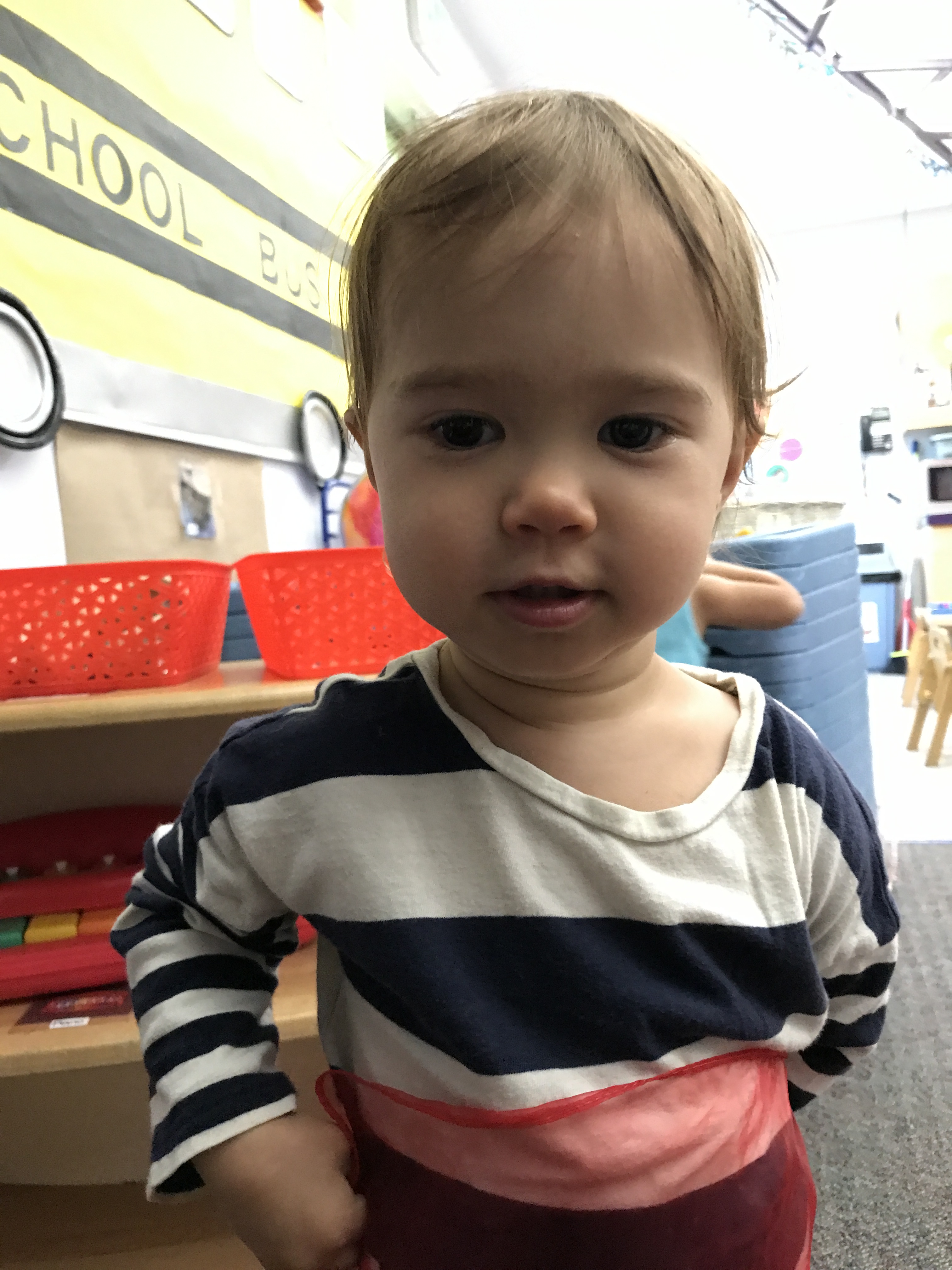 In small groups, we’ve done fun things like drawing our family portraits, shape sorting, making “shape soup,” creating shape sun catchers, apple sorting to recognize the letters Aa and Bb, dot counting, color mixing with play dough and more!