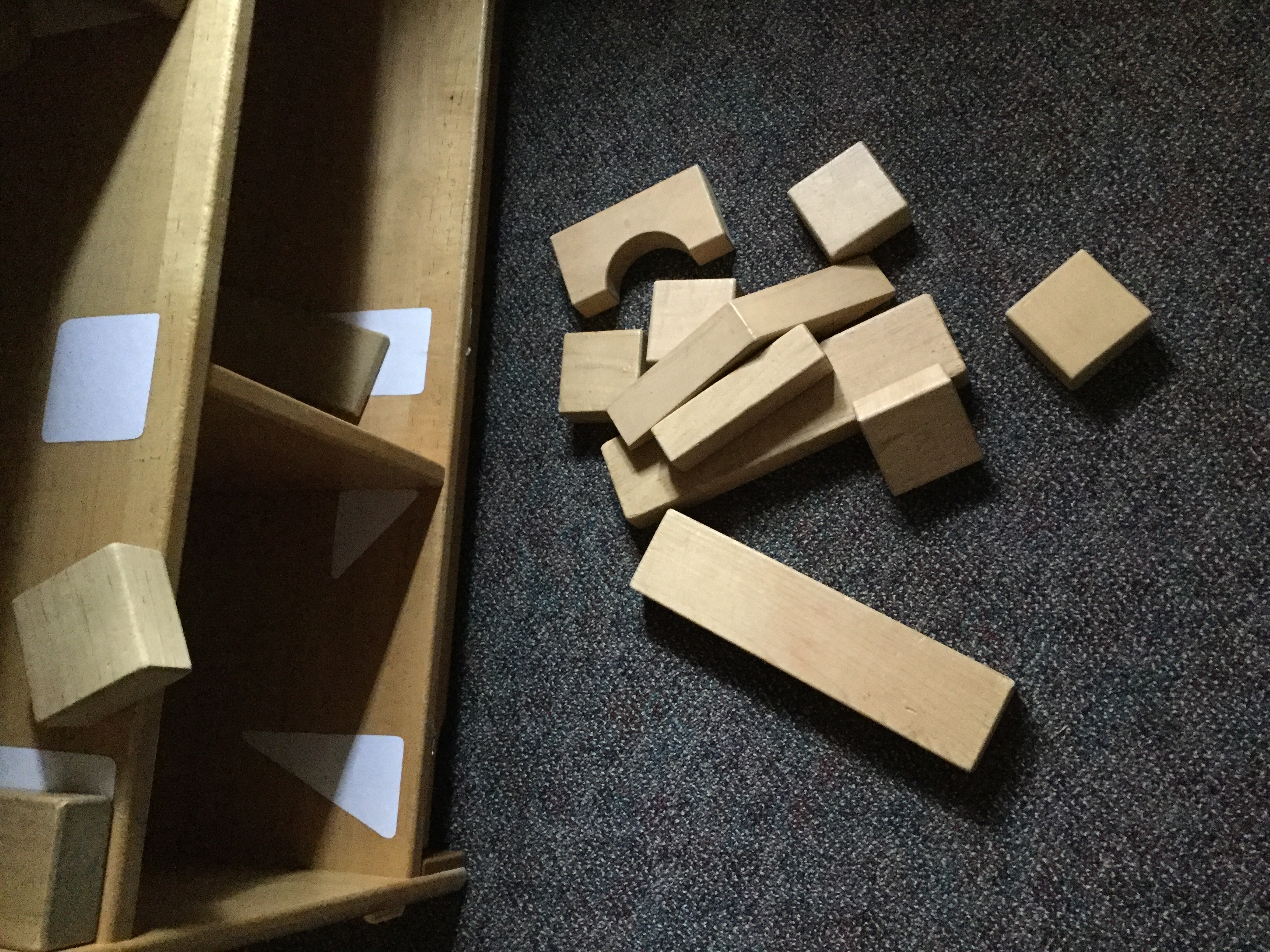 Science and math: they discover that one long block is equal to two short blocks ( proportions, fractions). Match block shapes to shelf label (spatial sense). Make patterns ( square, square, triangle, triangle and so on.