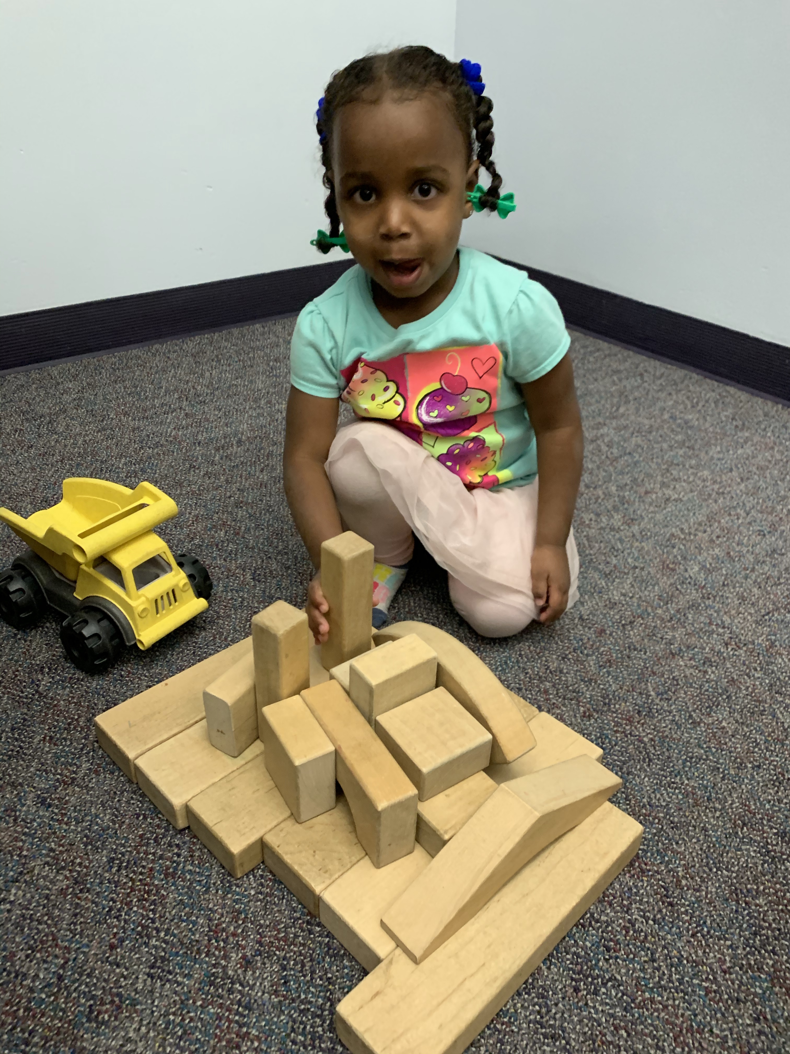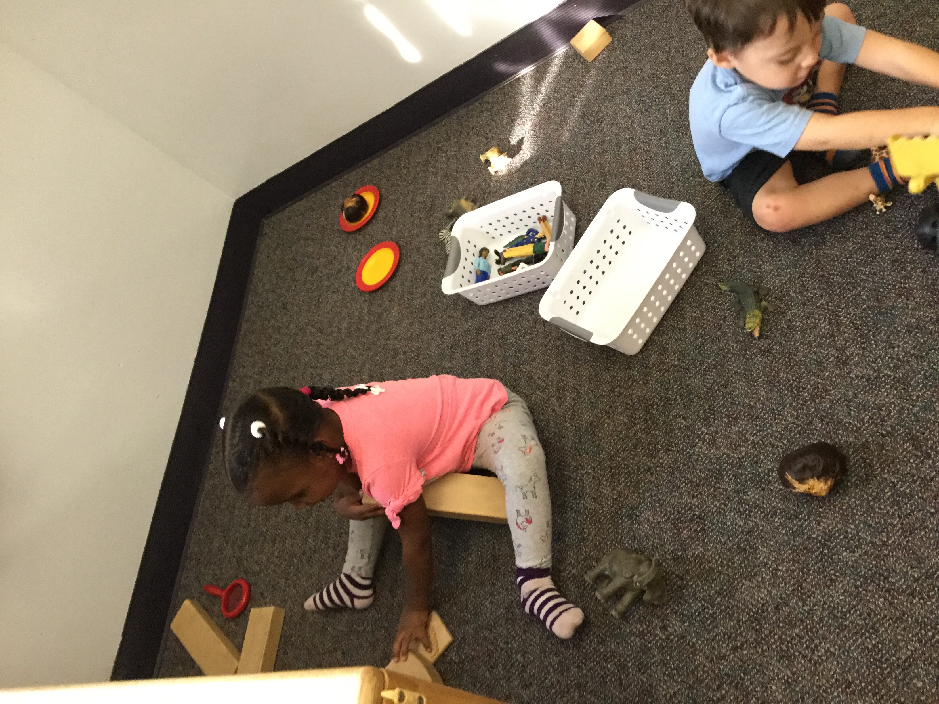 Social and emotional: rebuild after a block tower falls (self confidence, perseverance), put away blocks when finished building (self regulation,sense of community).