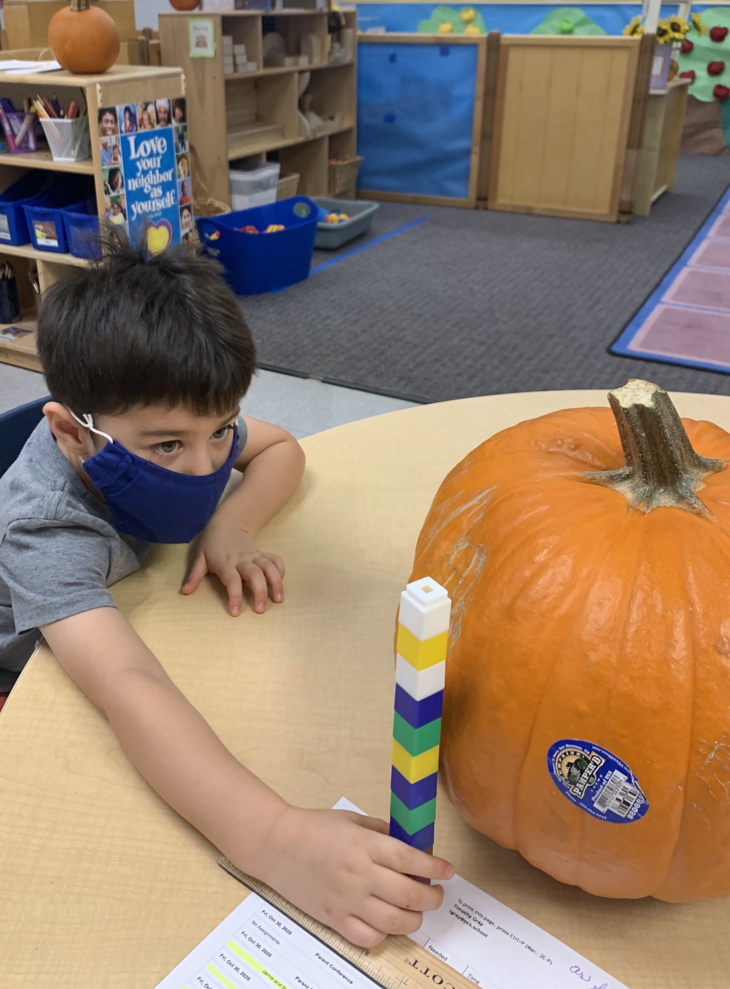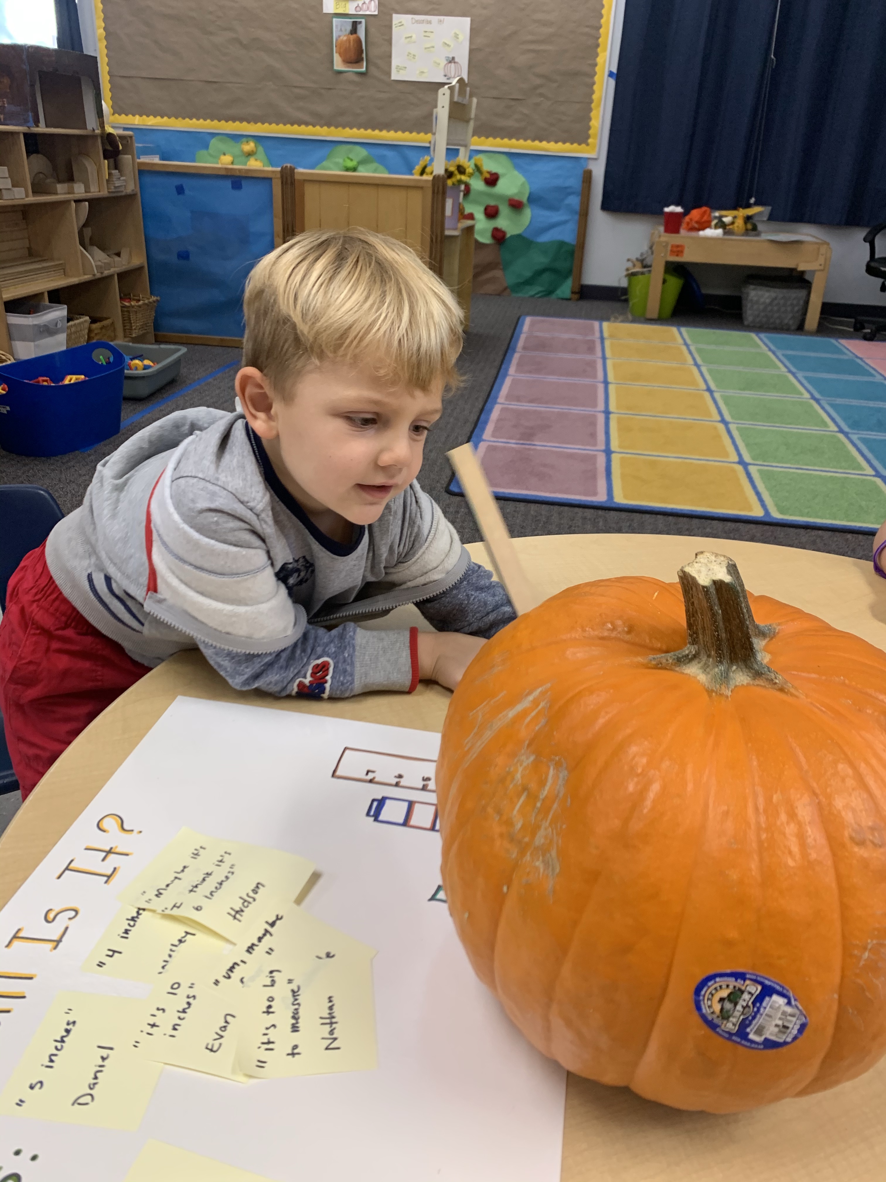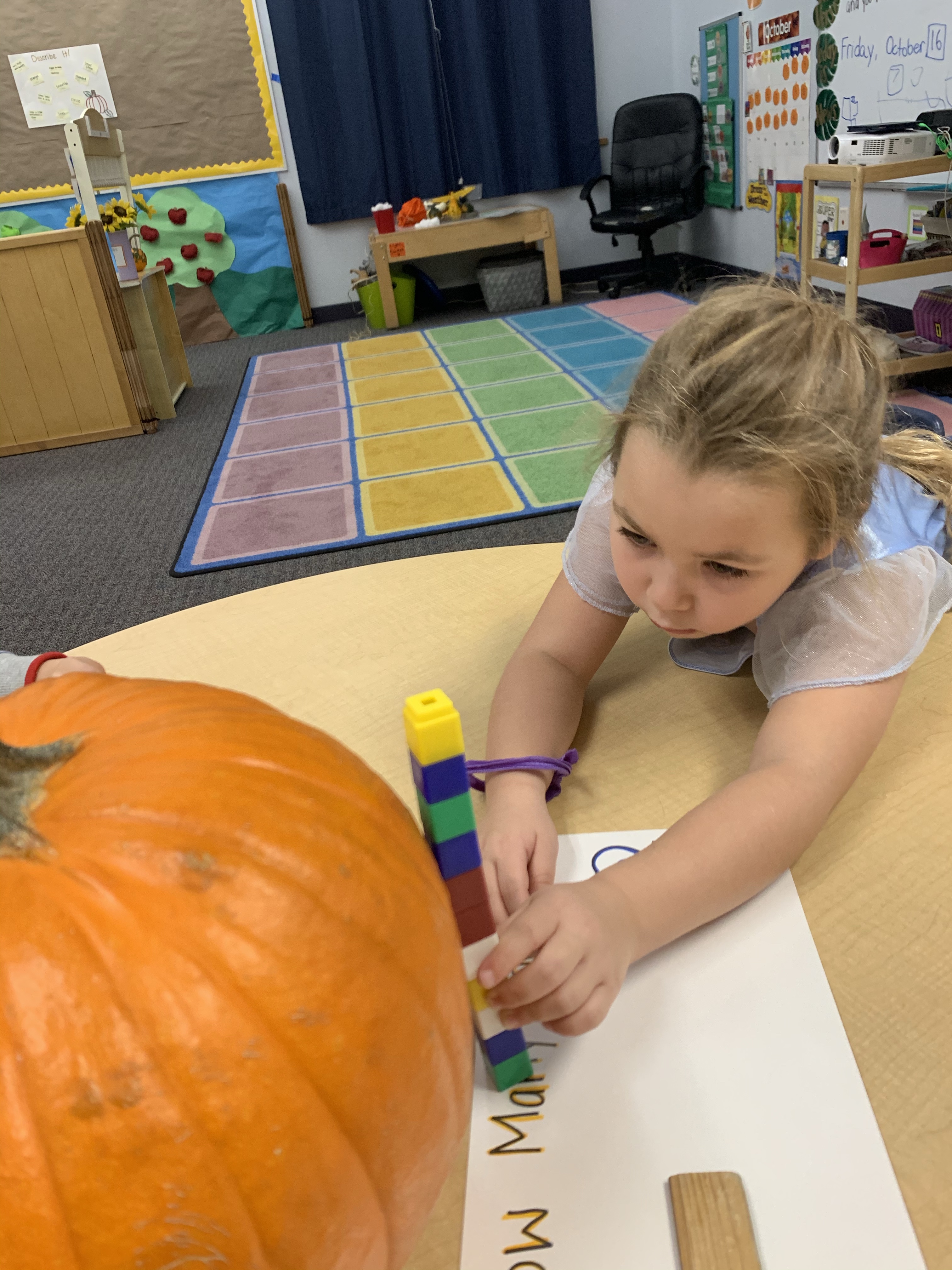 We put on our investigator caps and studied the mysterious pumpkin. We needed to investigate the length of the pumpkin, describe the characteristics of the pumpkin and explore what was hidden in this so called pumpkin. Let me tell you, we were amazed with the discoveries made! We used cubes to measure the length of this pumpkin. We had a wide range of predictions as to how tall the pumpkin was. Soon after we concluded that our pumpkin was 11 inches tall, which was the equivalent to 15 cubes. We used some descriptive words like: large, big, higher to reach, rounded, small stem and lines. The most exciting discovery was learning that seeds sink! Who knew! Our Pumpkin Investigation was a success!