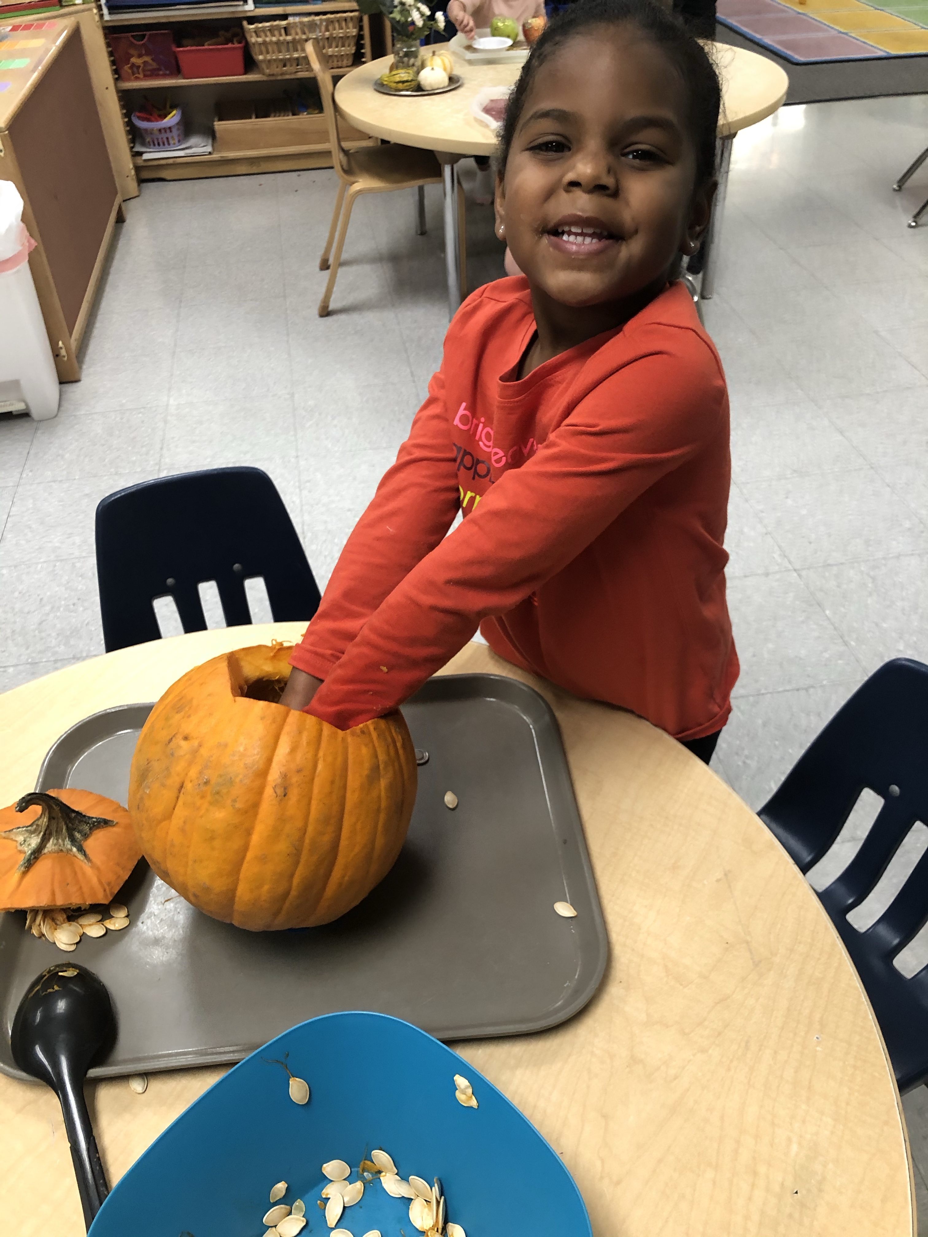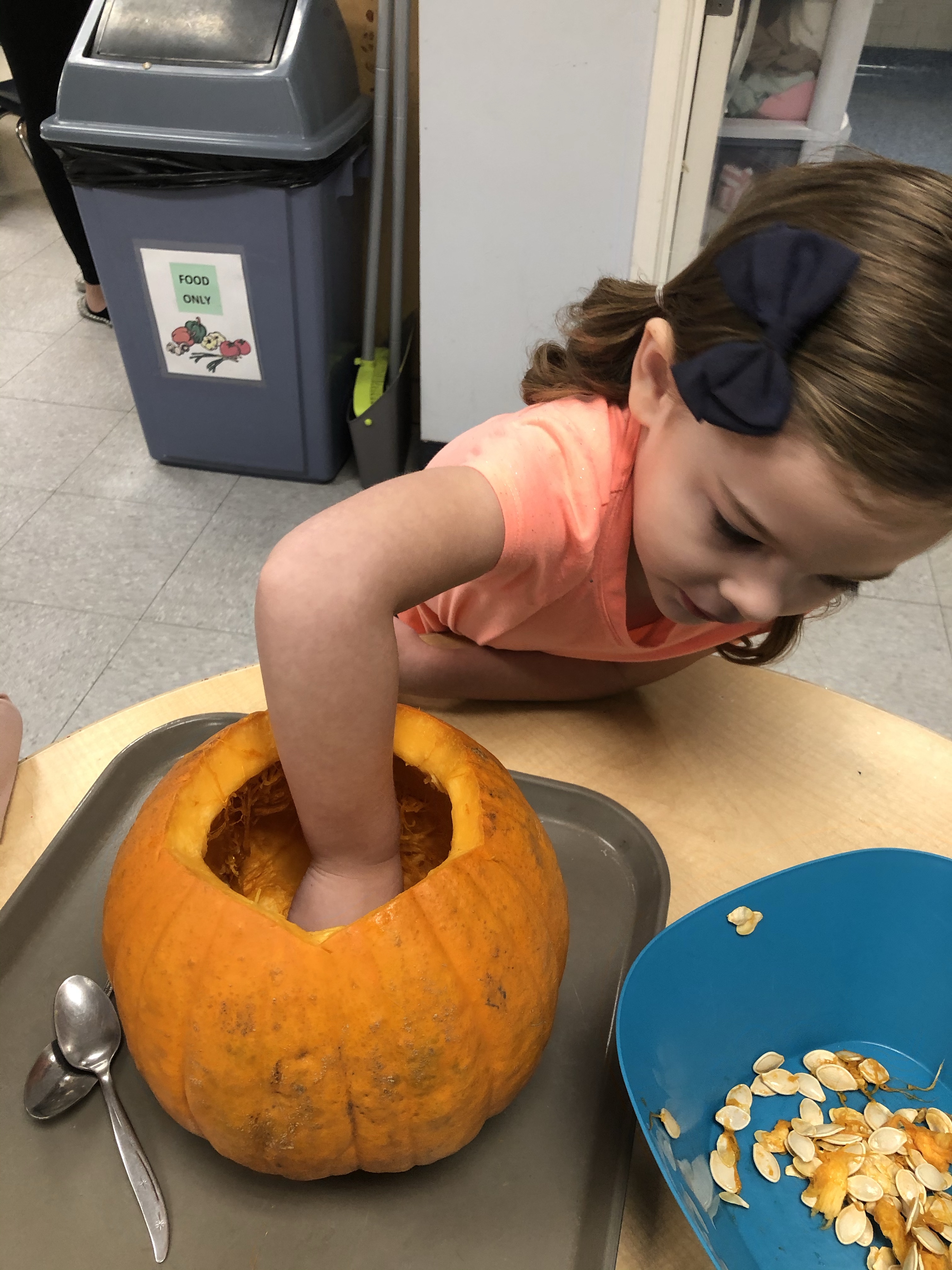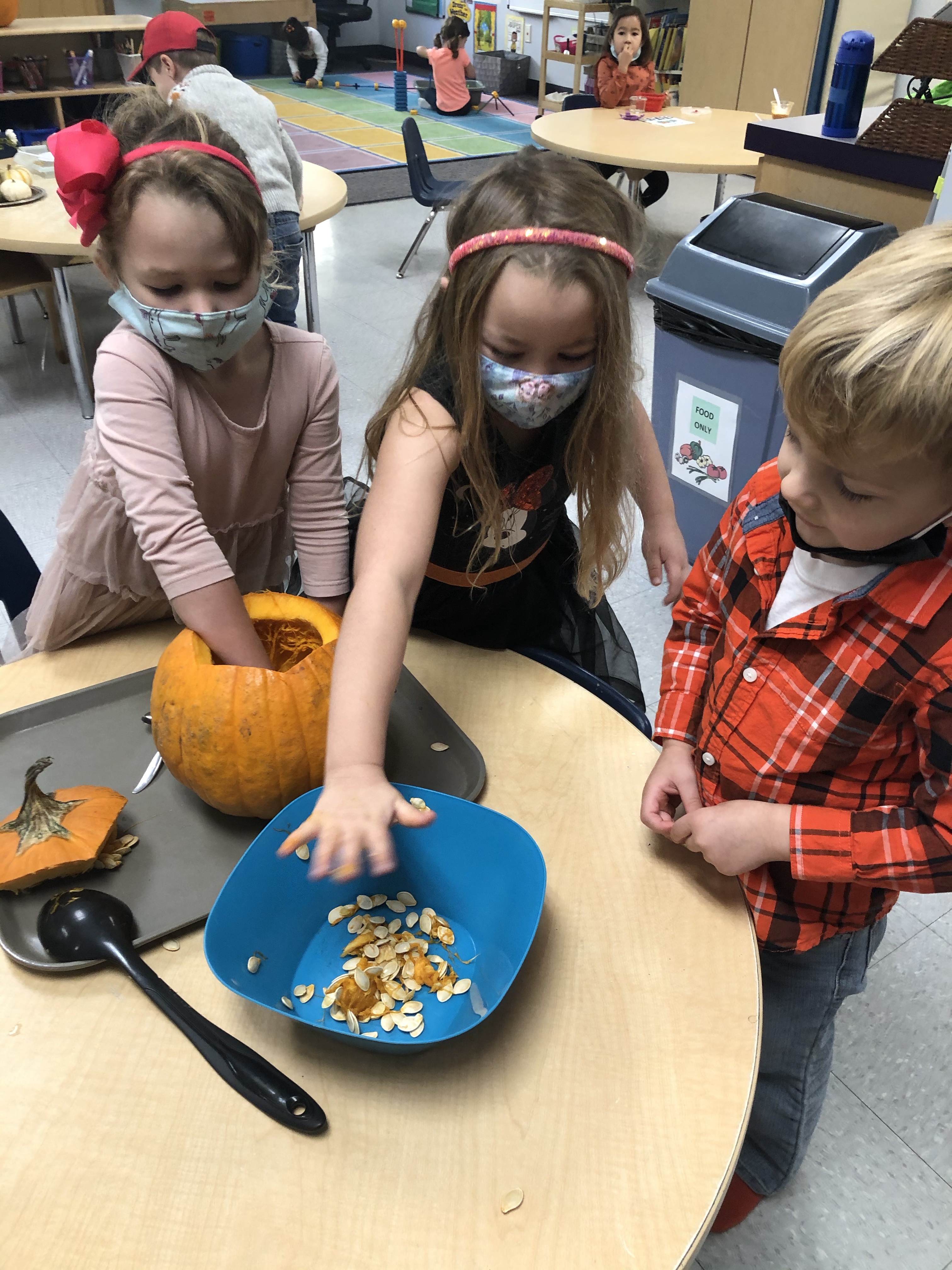 We put on our investigator caps and studied the mysterious pumpkin. We needed to investigate the length of the pumpkin, describe the characteristics of the pumpkin and explore what was hidden in this so called pumpkin. Let me tell you, we were amazed with the discoveries made! We used cubes to measure the length of this pumpkin. We had a wide range of predictions as to how tall the pumpkin was. Soon after we concluded that our pumpkin was 11 inches tall, which was the equivalent to 15 cubes. We used some descriptive words like: large, big, higher to reach, rounded, small stem and lines. The most exciting discovery was learning that seeds sink! Who knew! Our Pumpkin Investigation was a success!