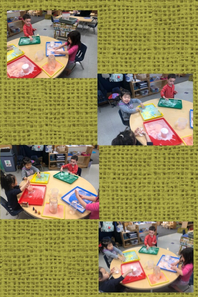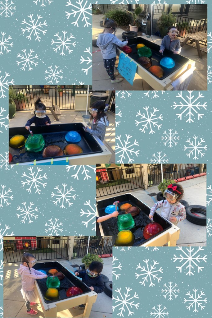 Way to have fun inside our class. We had a chance to explore the freezing ice blocks and watch it slowly Melt in the sun.