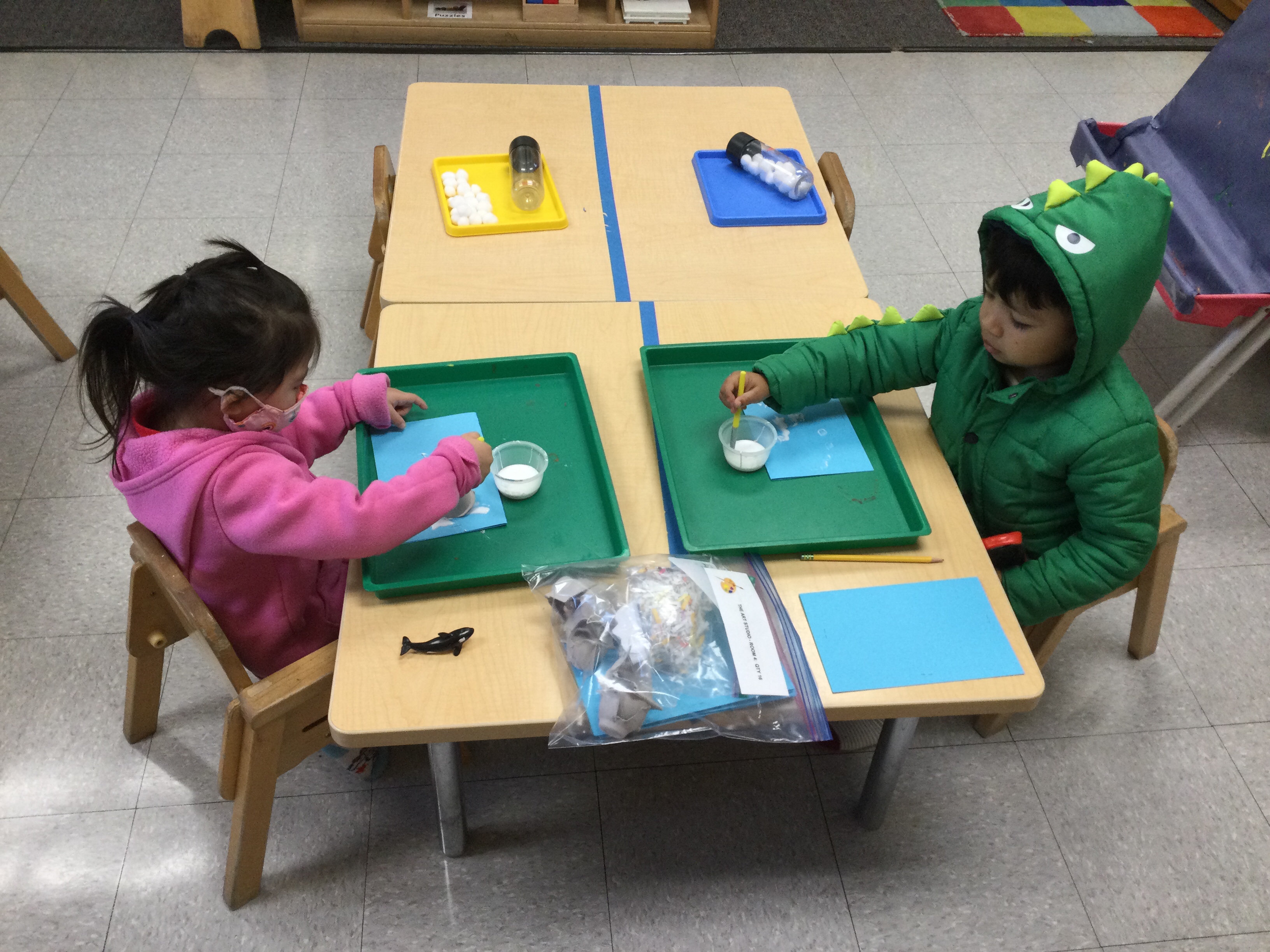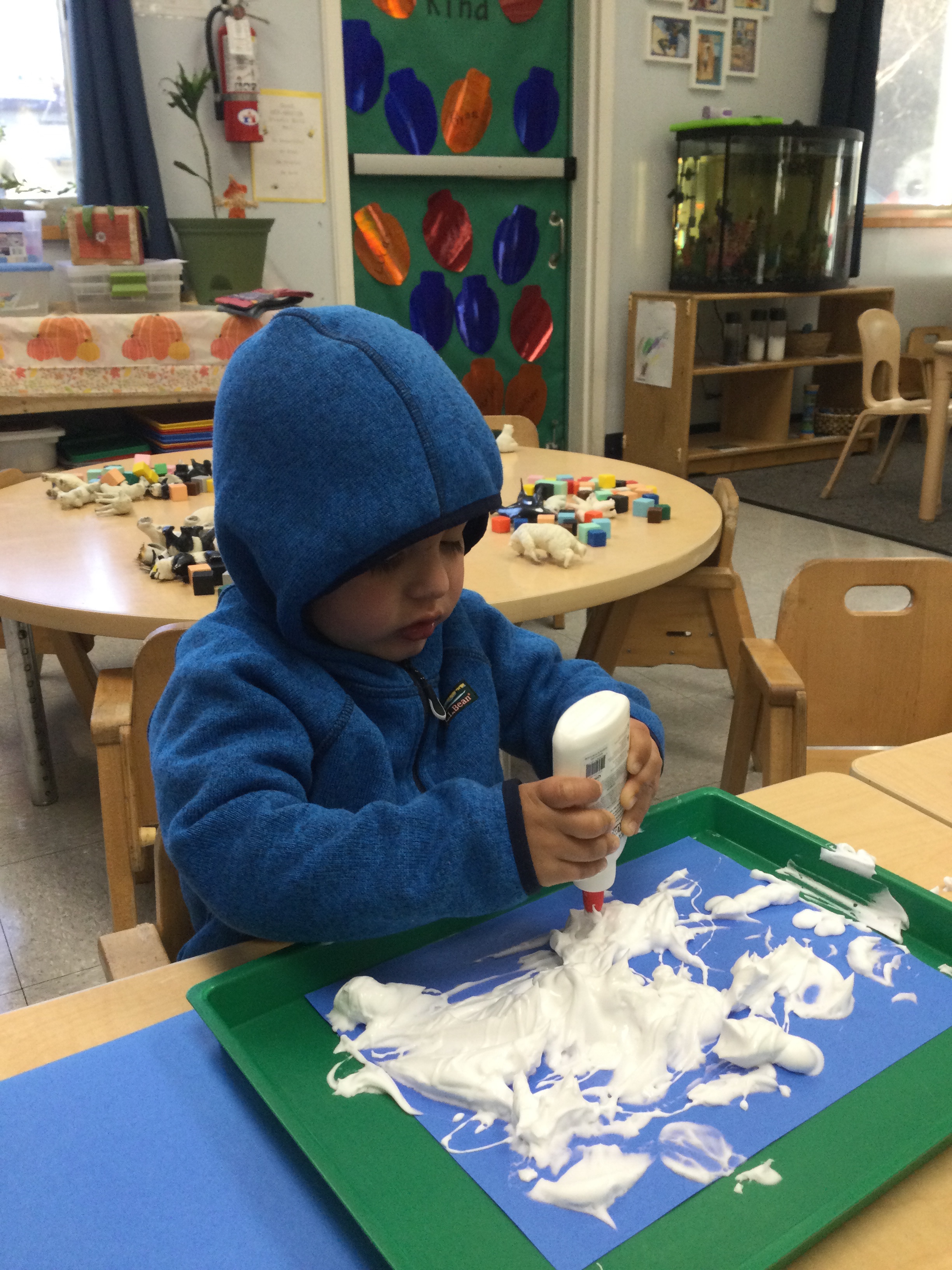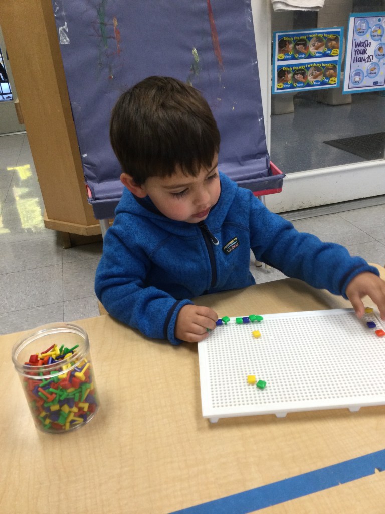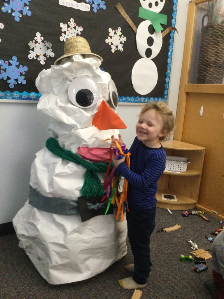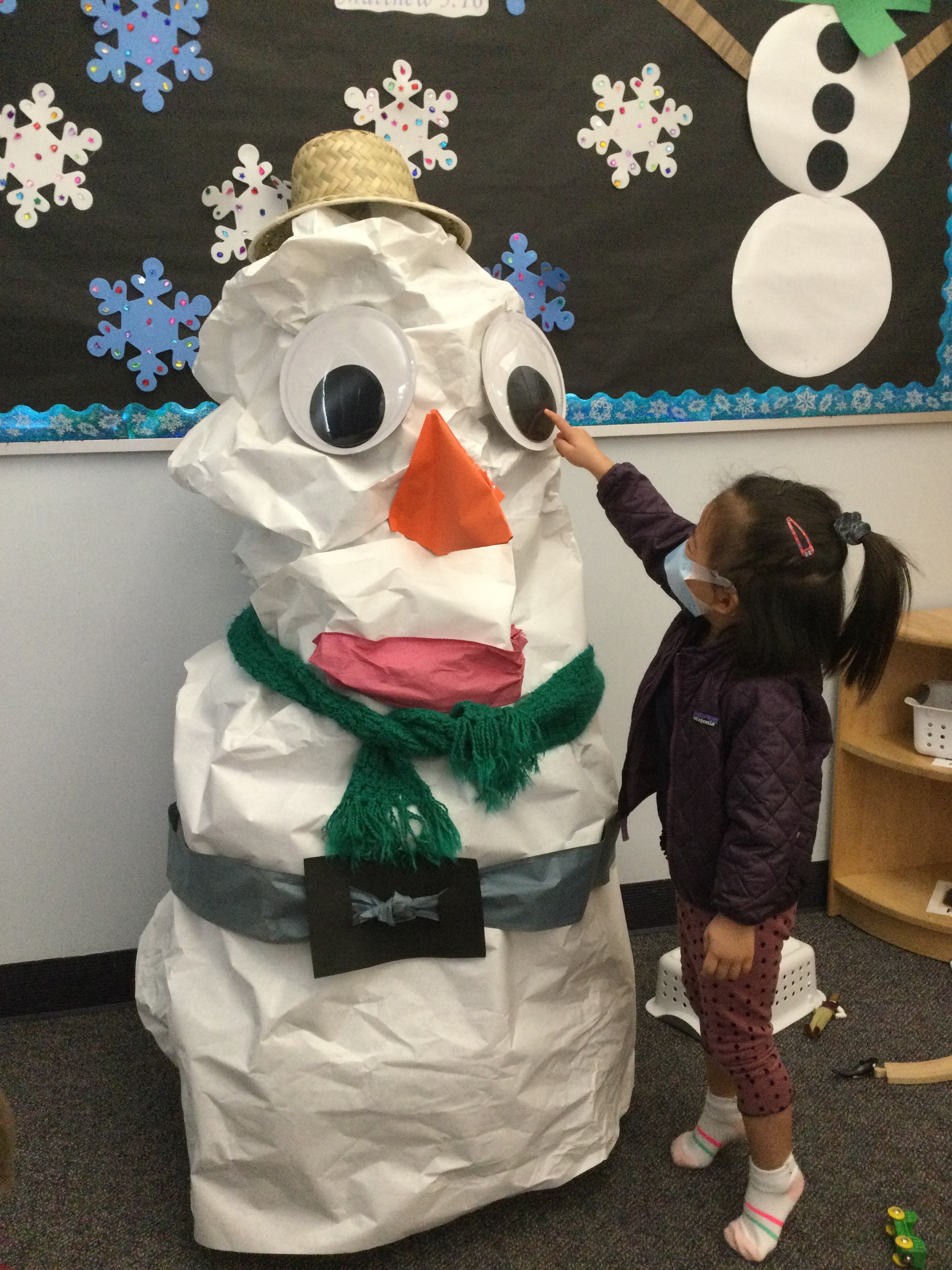 January is a good time to talk about the cold weather since is cold outside and everyone is wearing jackets. We have on display winter books such as; “All You Need for a Snowman,” “Snowballs,” “There Was an Old Lady Who Swallowed Some Snow,” “When it starts to Snow,” and “Snowmen at Night.” We are making fun winter arts and craft and have turned our Christmas tree into a giant snowman.