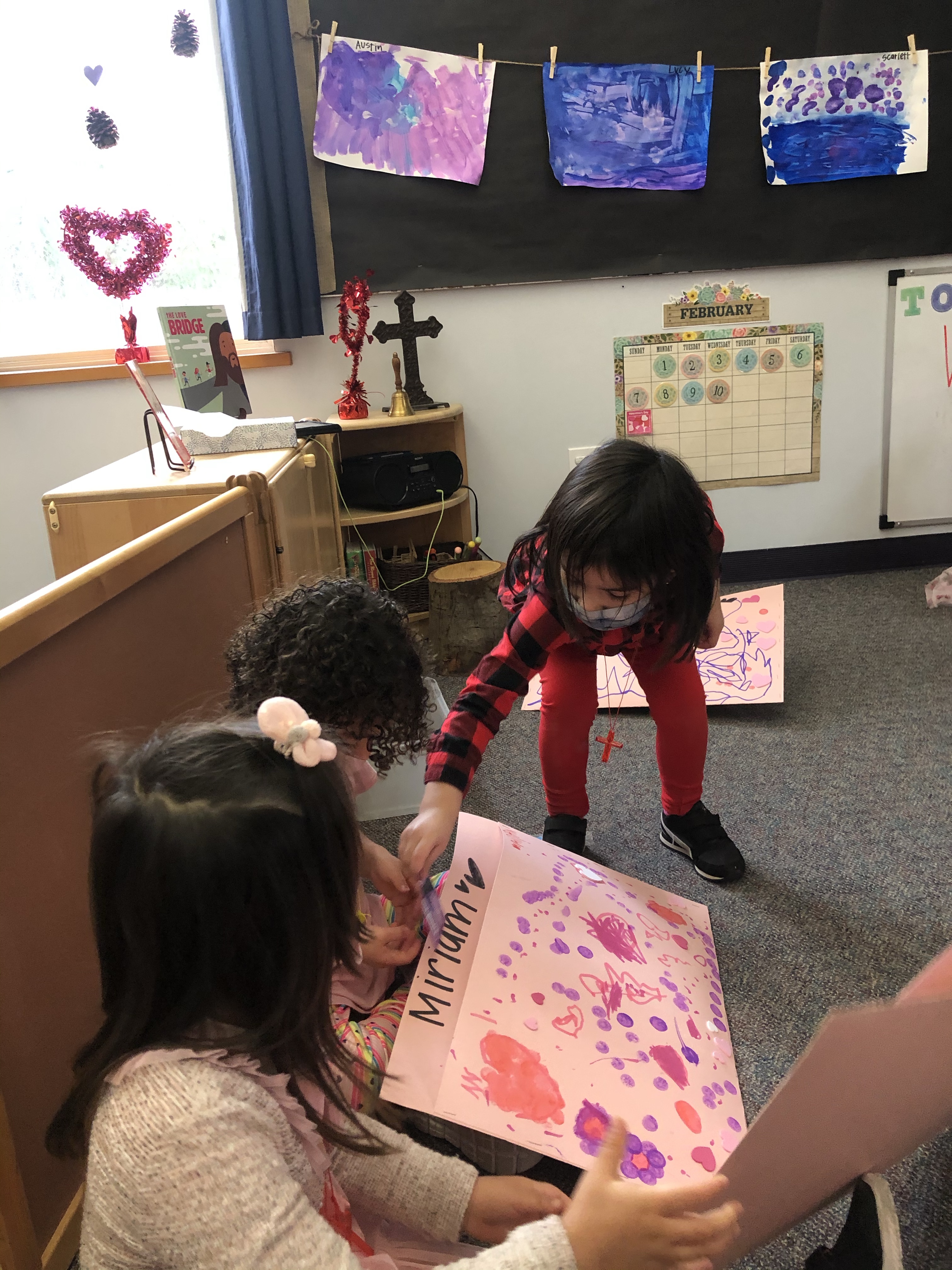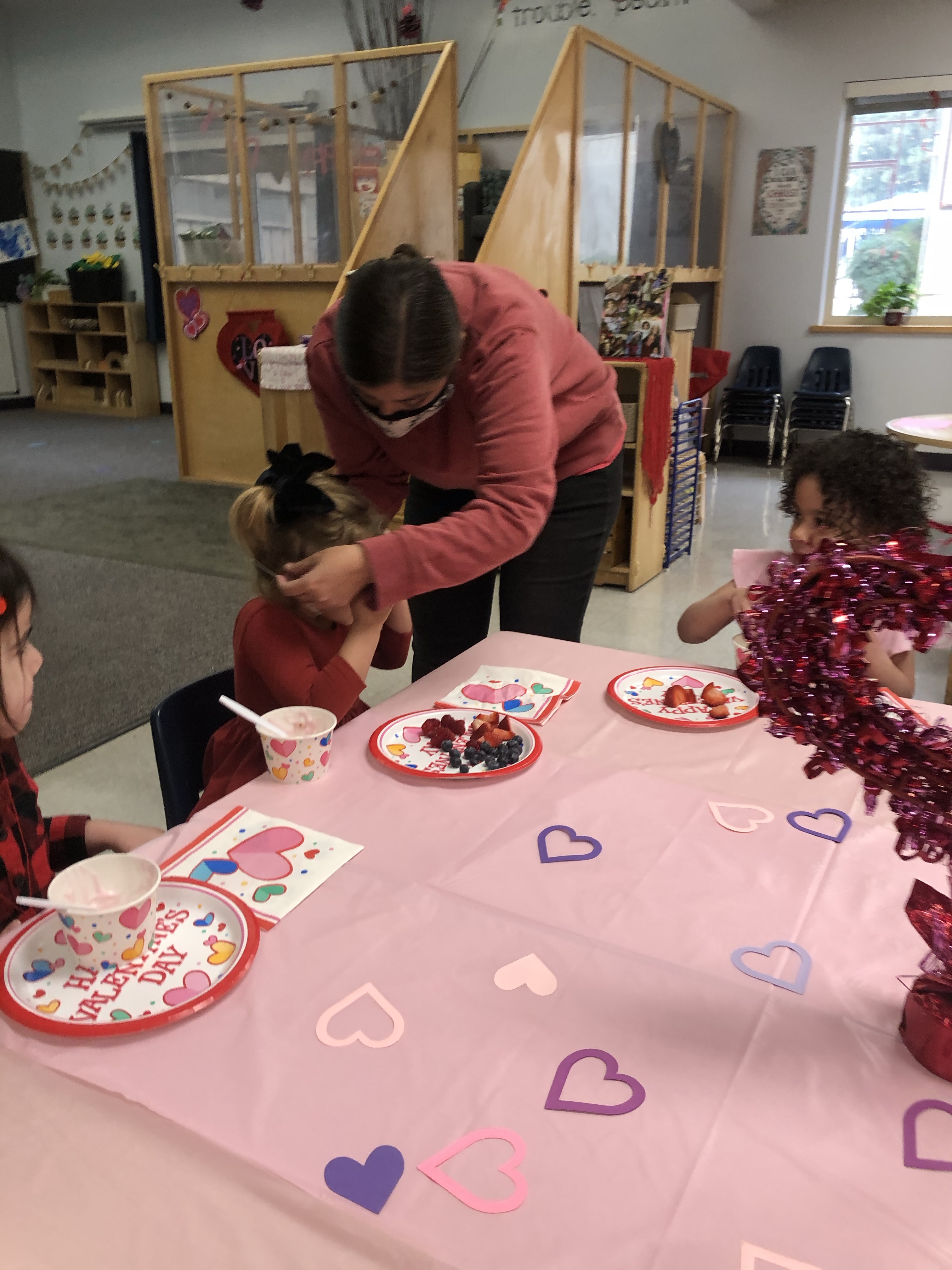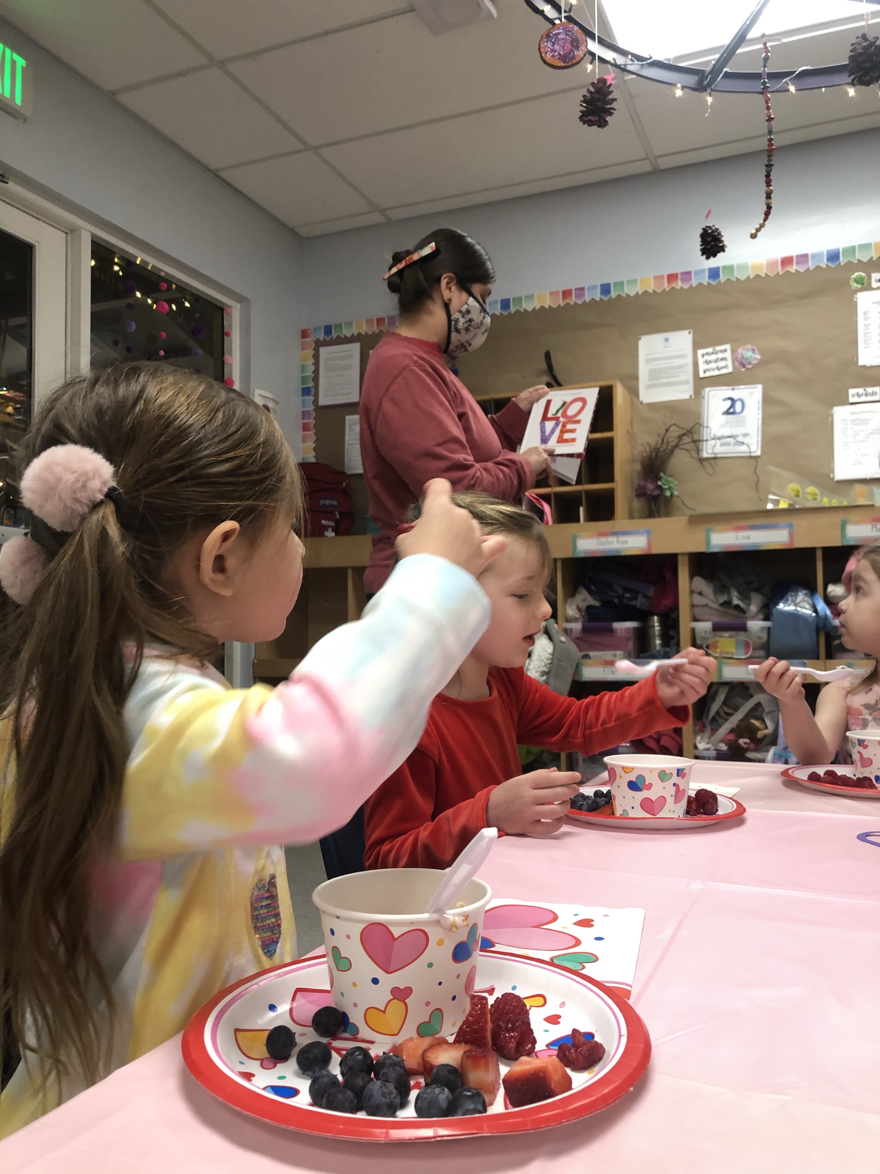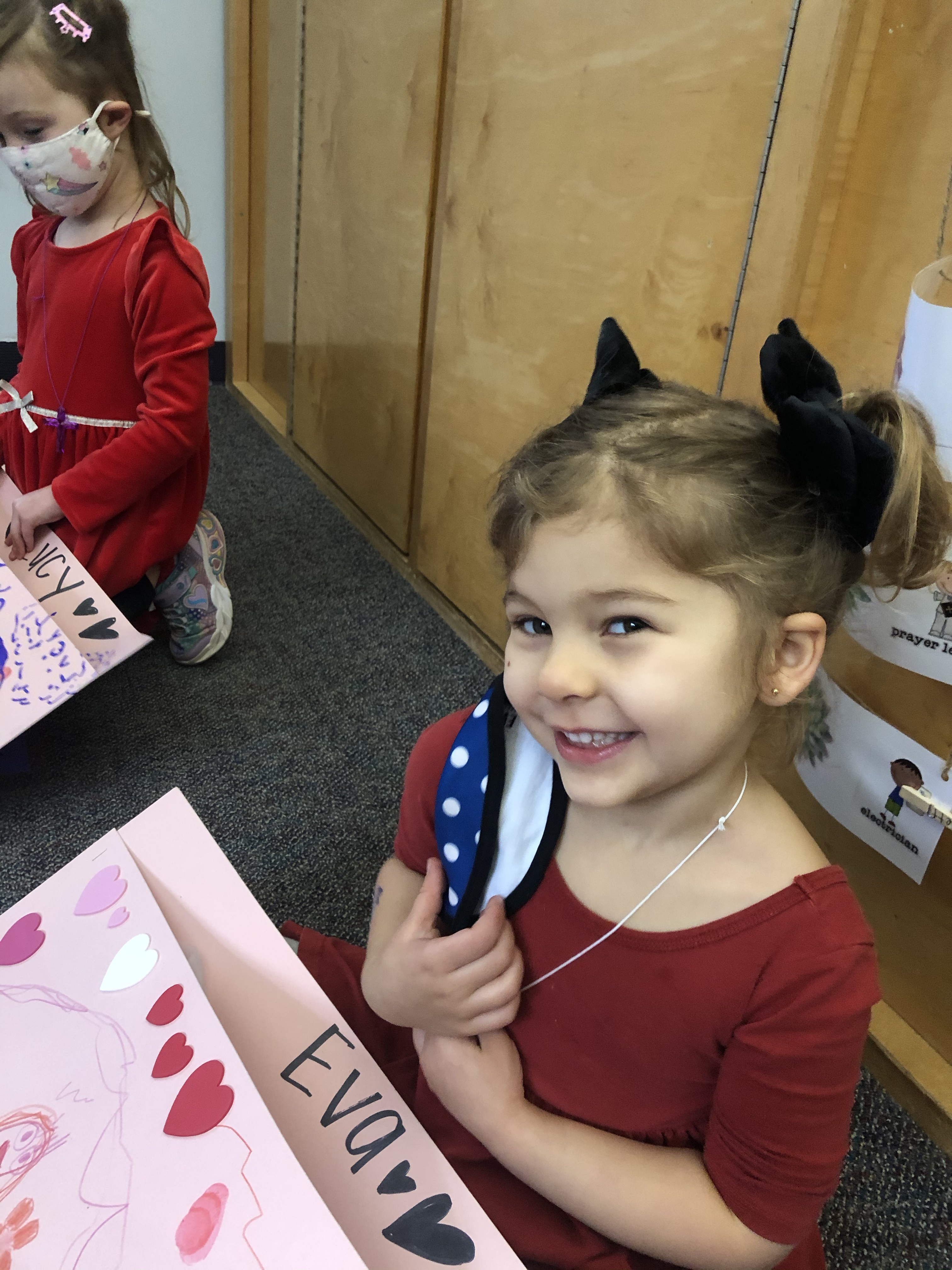 Room 2 celebrated Valentine’s Day with our Jesus Loves Me Party! We enjoyed a festive valentine fruit parfait and passed out our valentine cards. Ms. Monica stopped by for a special reading of Love by Eric Carle and passed out cross necklaces to remind us who loves us the most—JESUS!