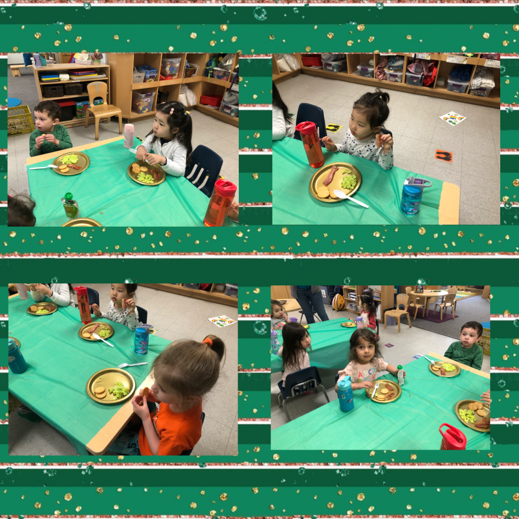 Sugar cookie,cheese and crackers for a special occasion. Bell pepper printsBig Yard flower fun!We read the book Little Blue and Little Yellow. The kids were able to see the transformation to green by mixing both blue and yellow play dough. Voilà!
