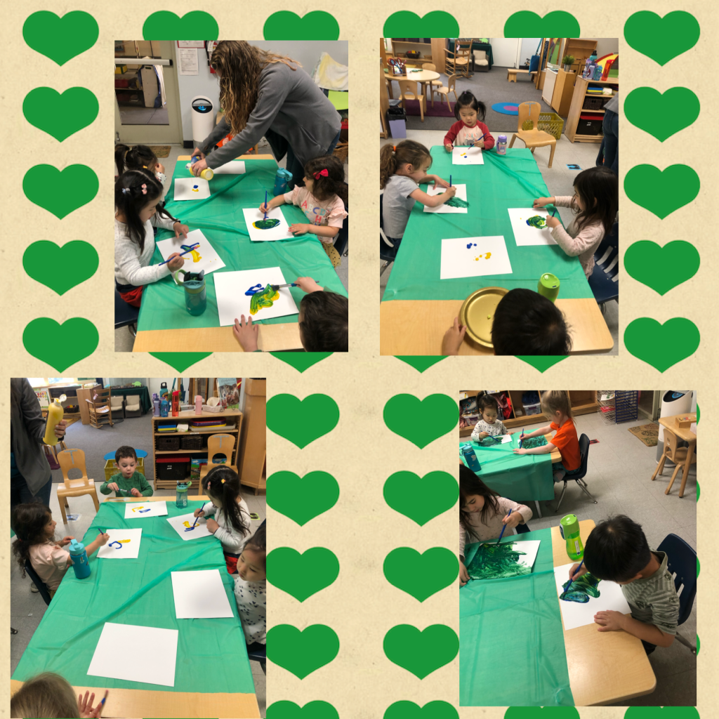 We ate Green Eggs and Ham (bacon). Some of us were unsure about the green eggs but we all tried them. Everyone loves bacon! We did an art project from Ms. Monica! We mixed blue and yellow to get green! We played Flower Shop in the yard outside and we wore them in our hair and decorated Ms. Sheri with flowers. All in all we had a busy day playing with each other. We look forward to playing together again tomorrow!