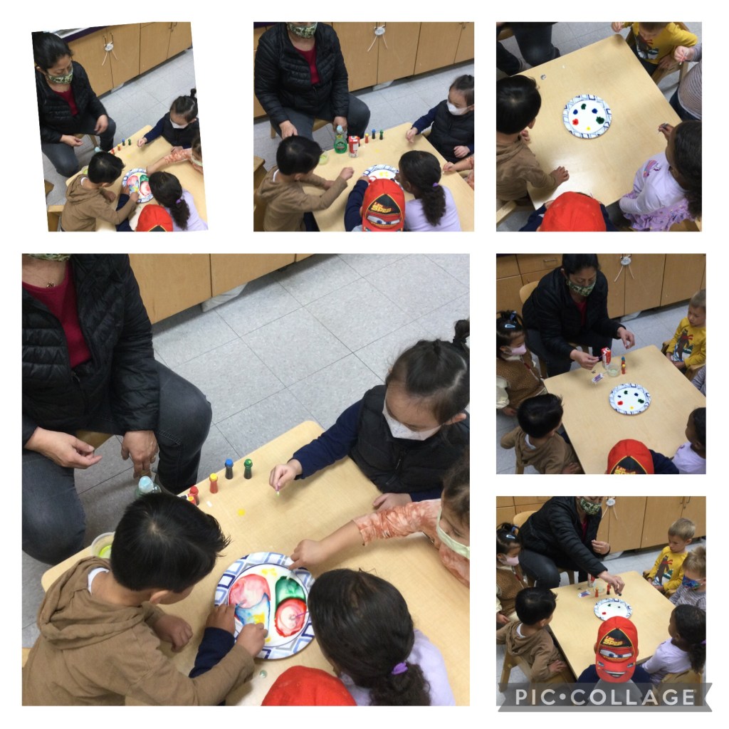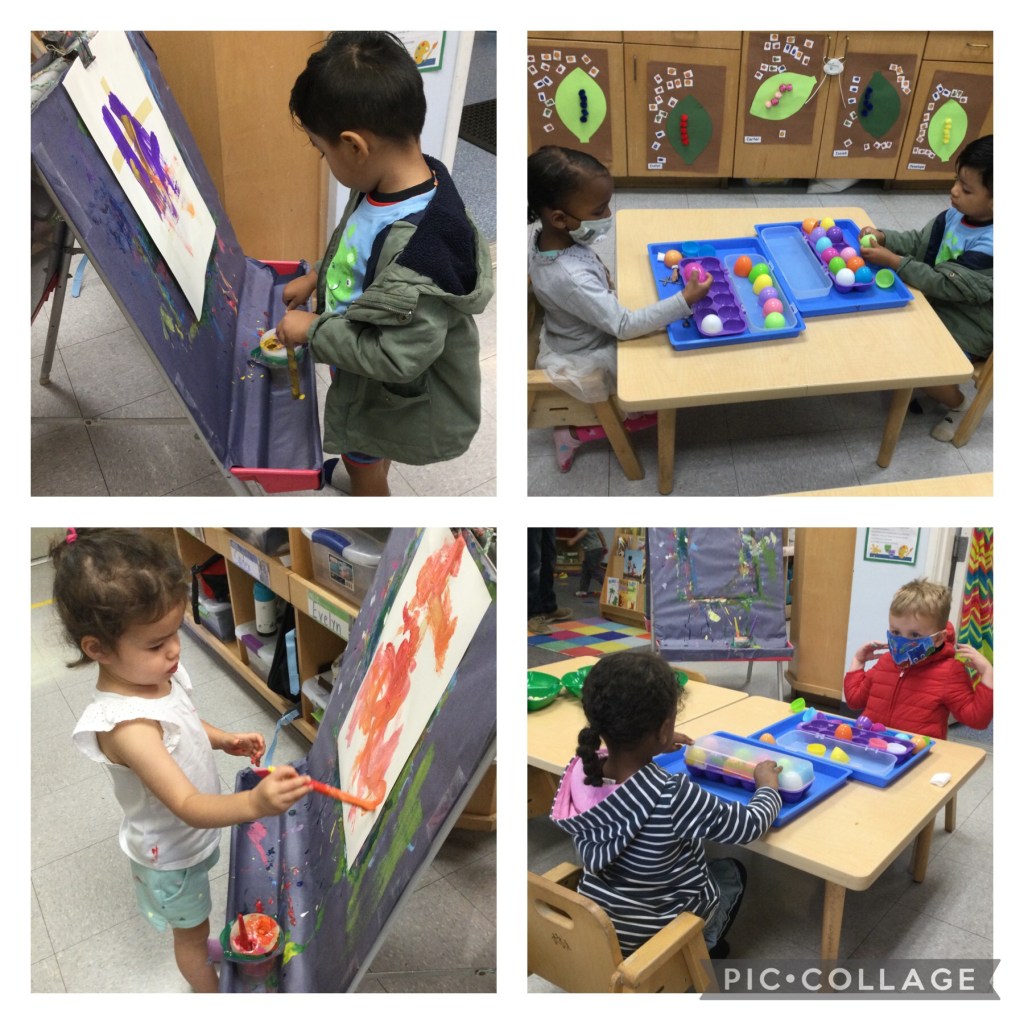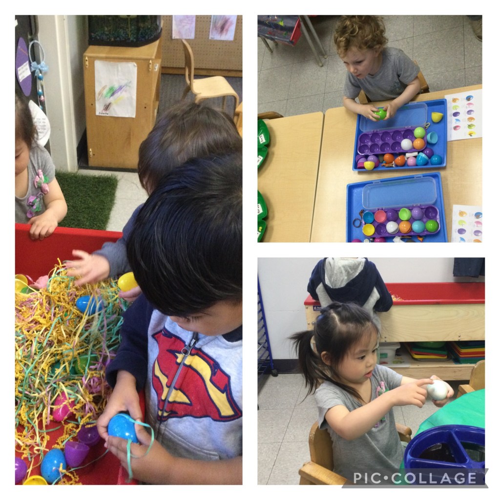 Indoor egg discovery. Discovering what was inside the eggs was the main focus and important task for our little friends in class. But as teaches we planned this activity with different skills our little children can gain from it. For example; recalling items in a group, back and forth conversation, spacial awareness, recognize colors and shapes.