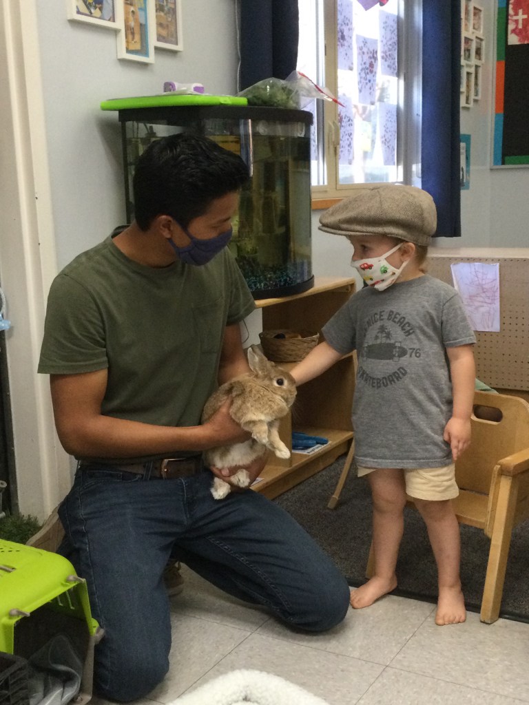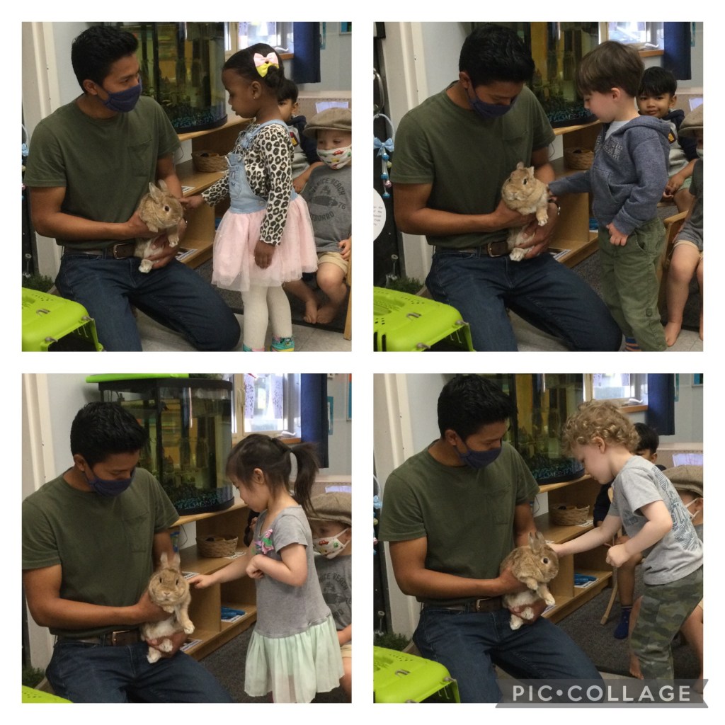 Mr. Yorlin brought his pet bunny “Pancake” from home. In class we sat around in circle and instructed the kids to use two fingers and gently pet the bunny. The kids patiently waited for their name to be called, they were very excited, used their listening ears, gentle hands and followed directions on how to pet “Pancake.”