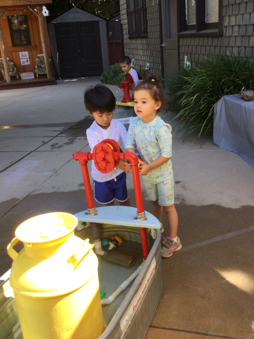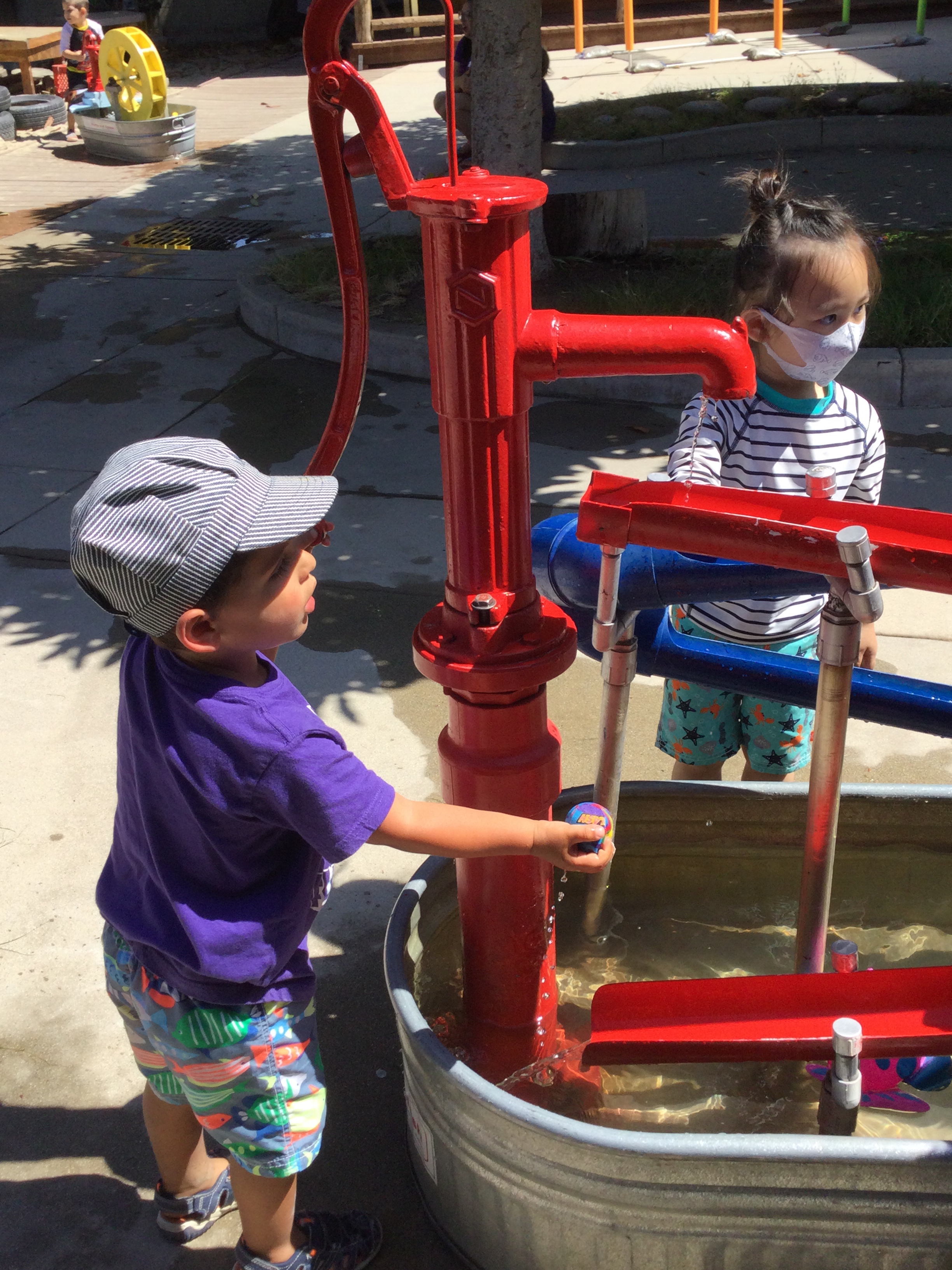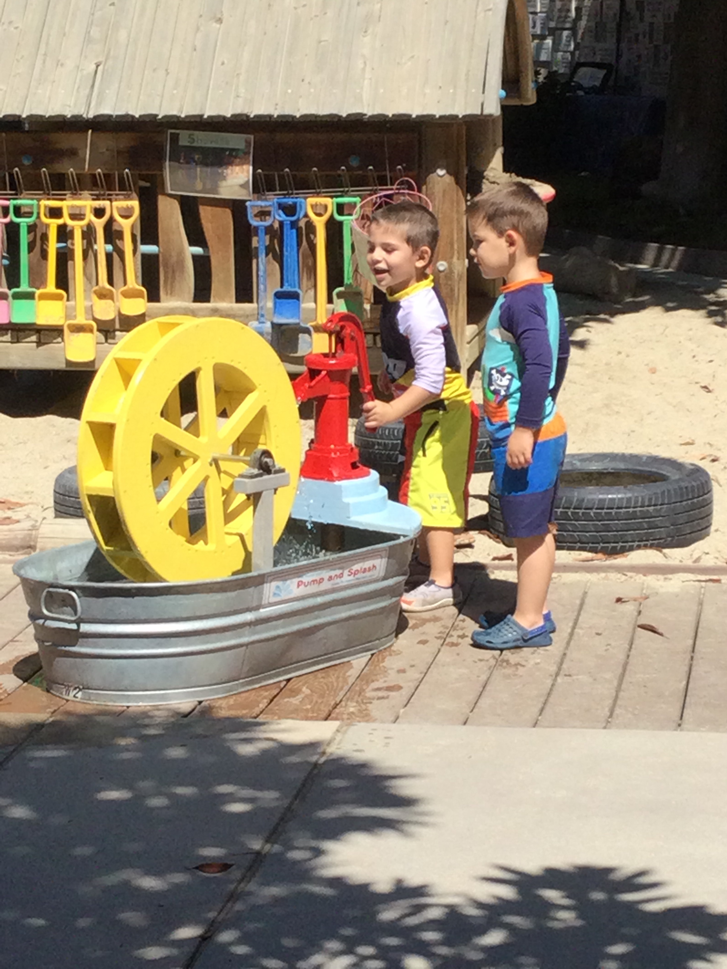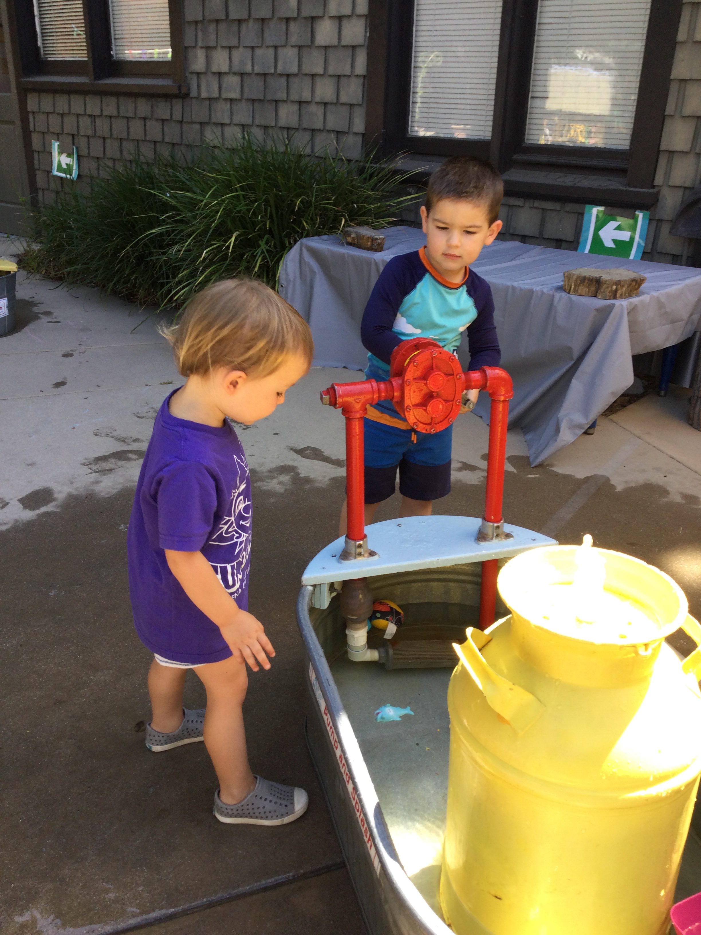 Our Pump-and-Splash was an exciting activity to enjoy outside. We had large, medium and small barrels of water to discover their mechanical function. Yes! These barrels can be cranked to the right for a great big splash surprise and other barrels can be pumped up an down to watch the floating ducks move through the pipes. So much fun!😄