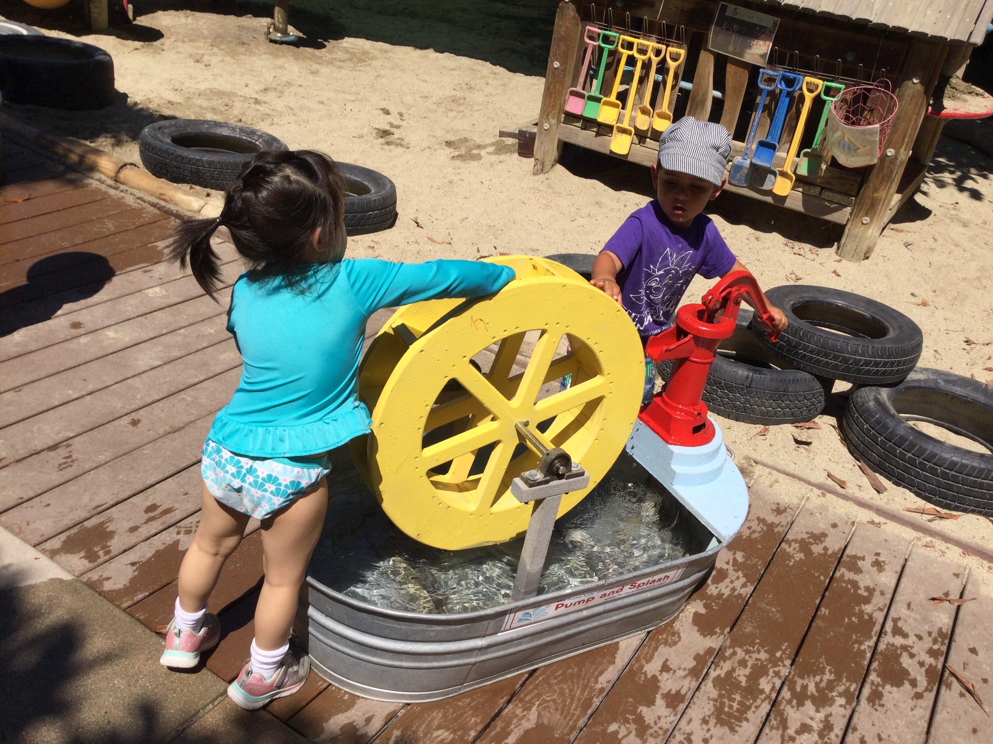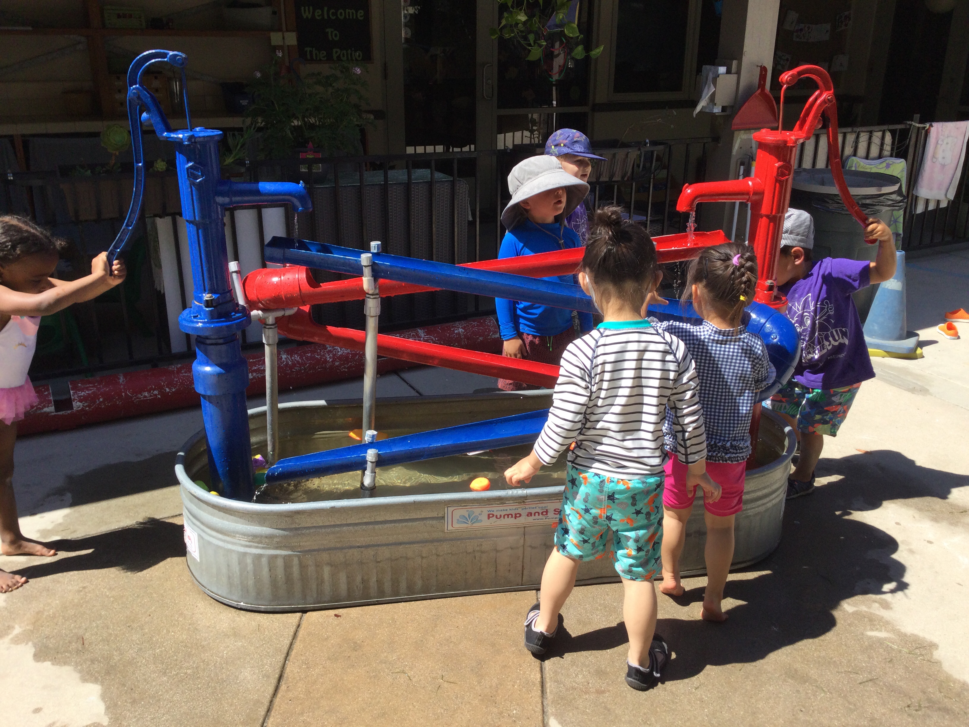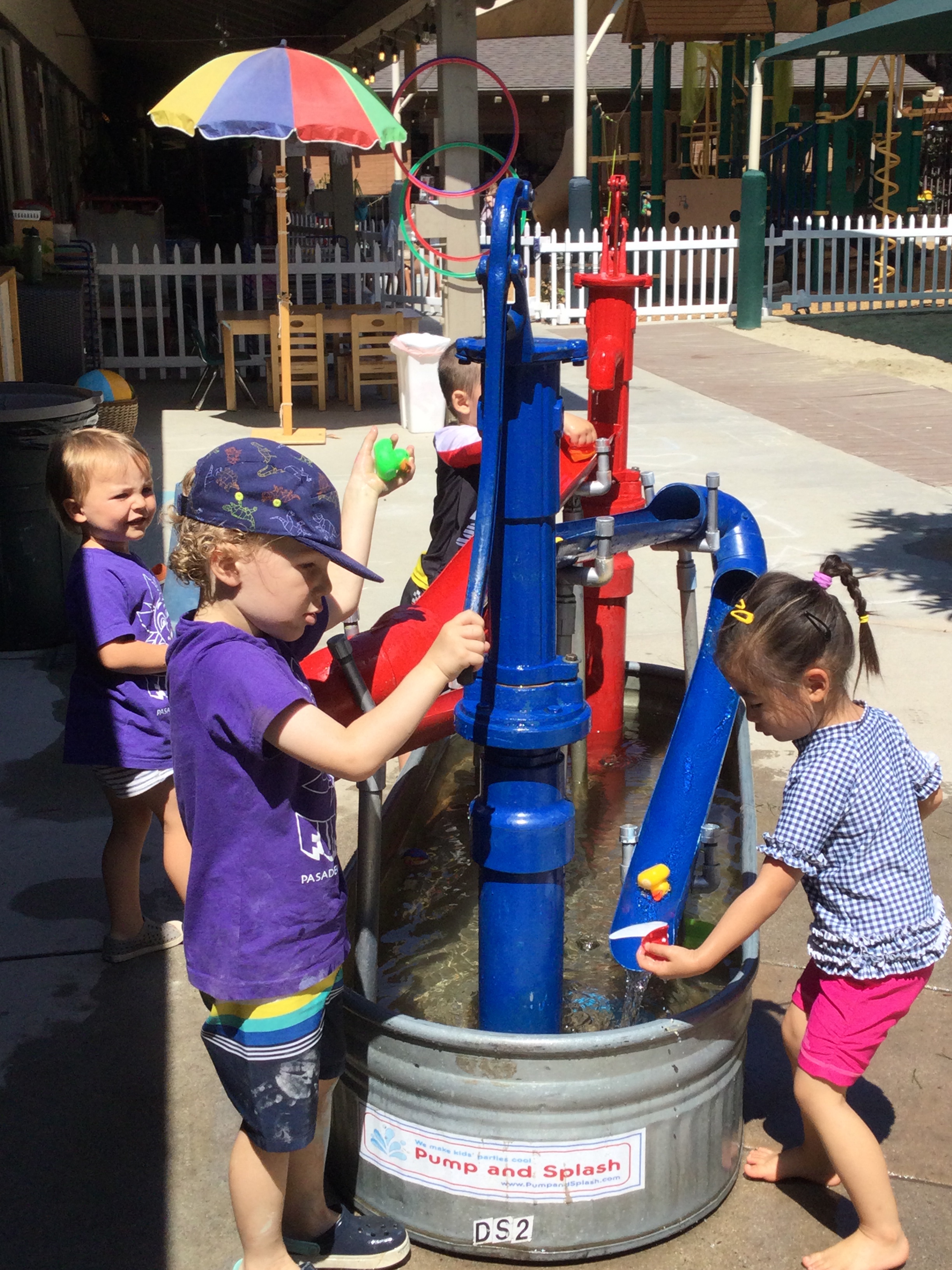 Our Pump-and-Splash was an exciting activity to enjoy outside. We had large, medium and small barrels of water to discover their mechanical function. Yes! These barrels can be cranked to the right for a great big splash surprise and other barrels can be pumped up an down to watch the floating ducks move through the pipes. So much fun!😄