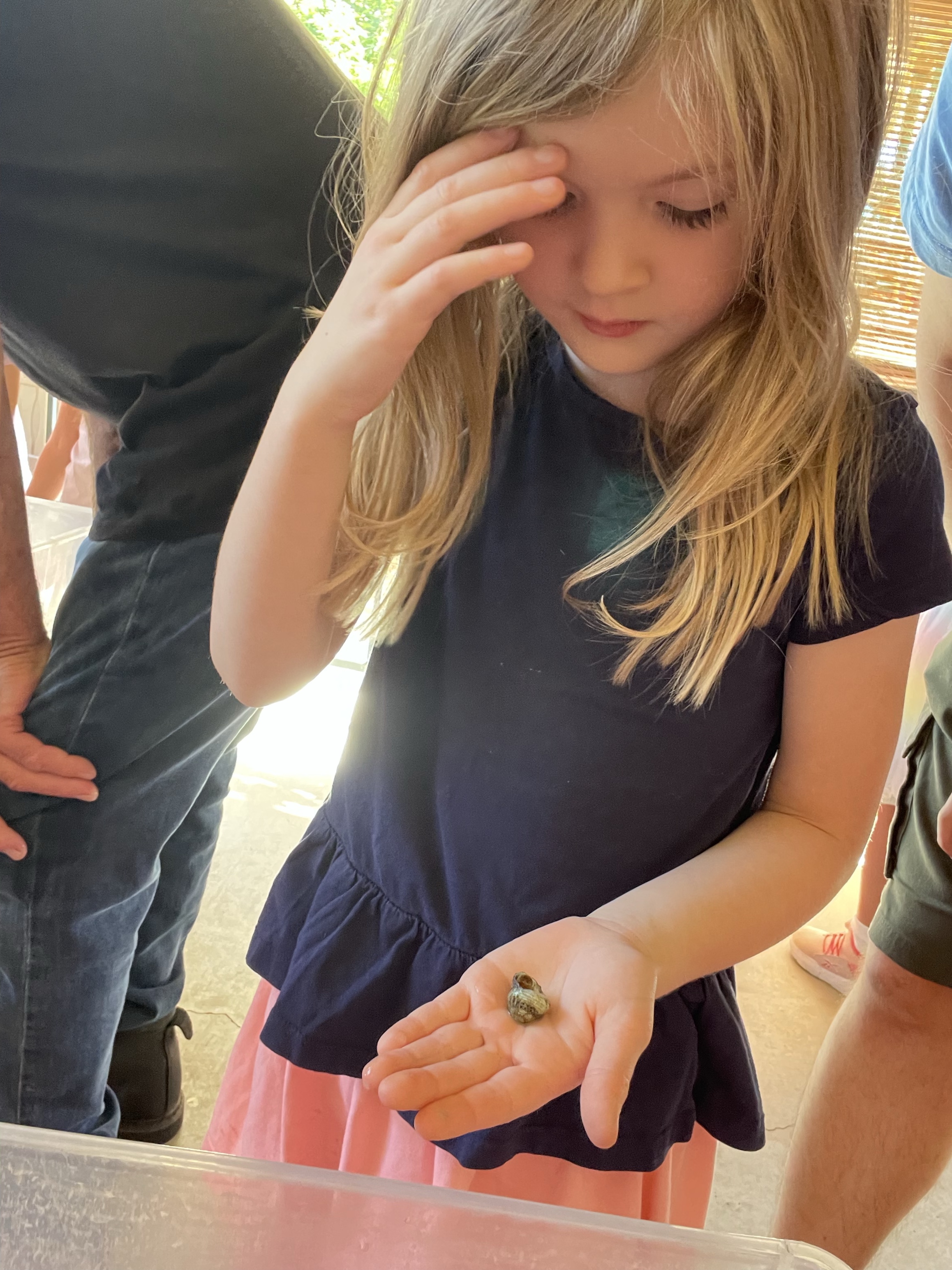 The Mobile Tide pools at PCS. We had some adventurous kids who wanted to touch and hold the ocean animals that Captain Carol brought. He brought snails, hermit crabs, starfish, sea cucumber, shark, and a sting ray.