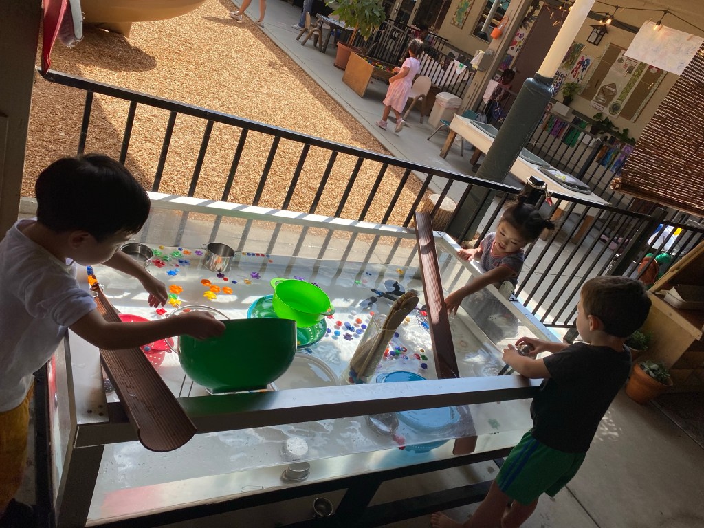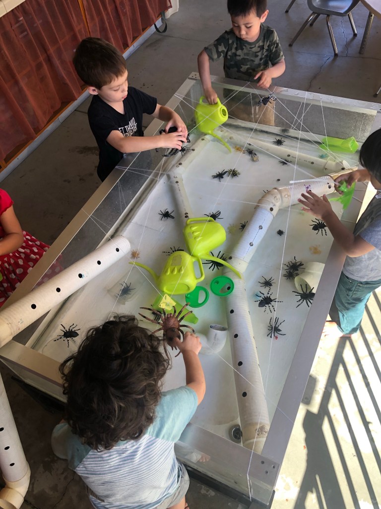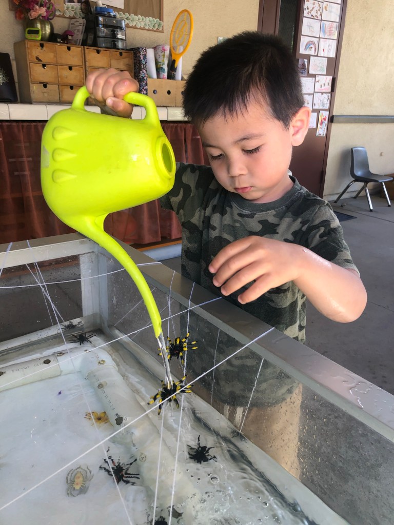 Our older pod friends are enjoying some itsy bitsy (and some not-so-itsy-bitsy) spiders at the water table this week! It’s a sensory experience that ties in literacy—language development and story-telling fun.