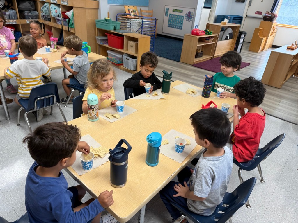 The preschoolers will meet in our parking lot, then walk to the large grassy field, where we will read books, sing songs, and maybe have a snack before returning to the preschool campus to finish our day.