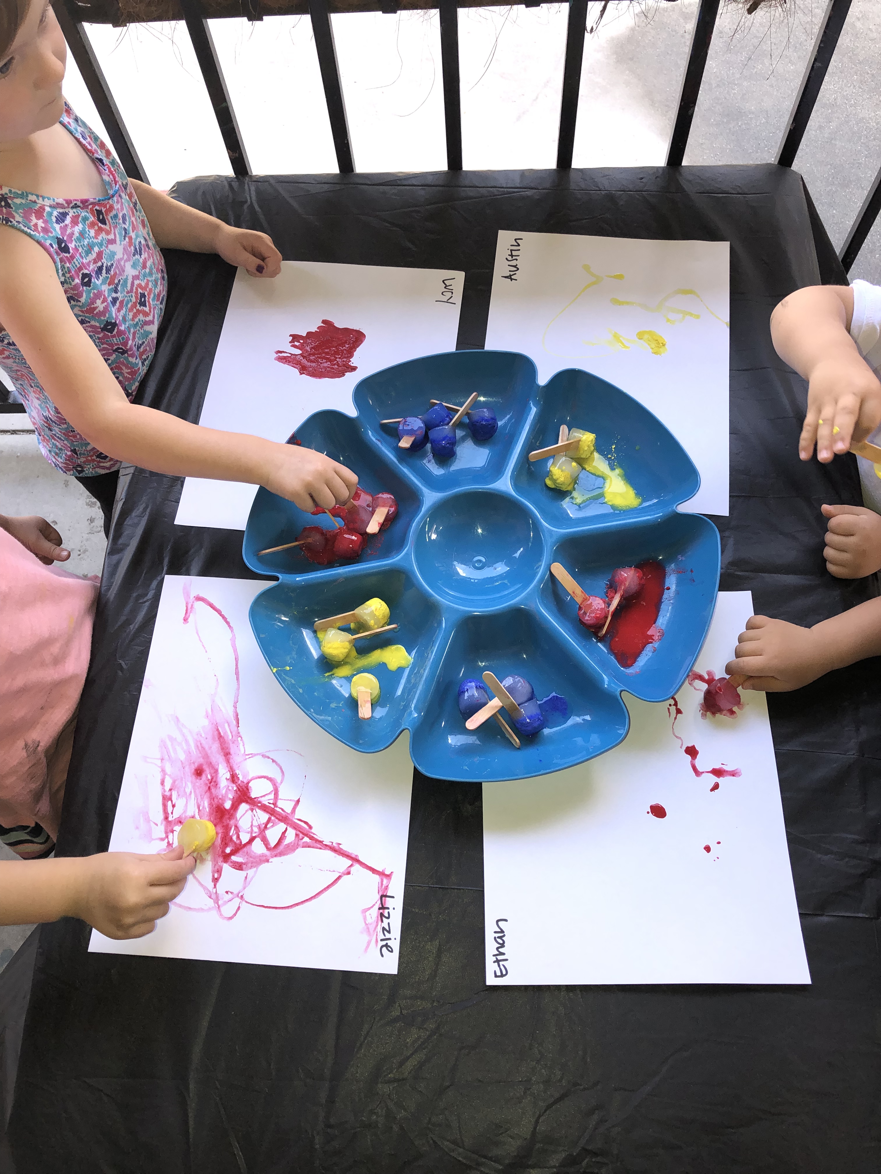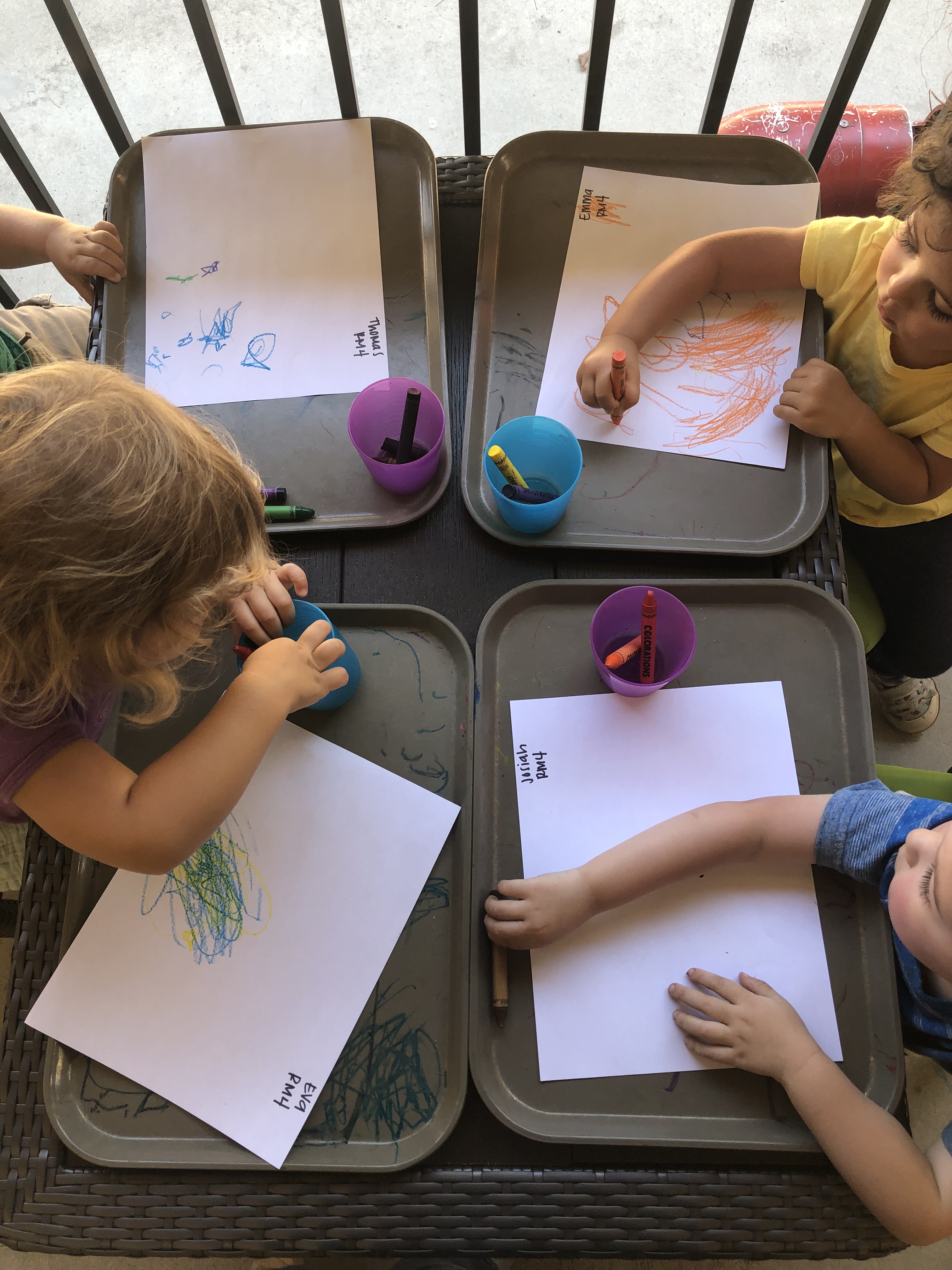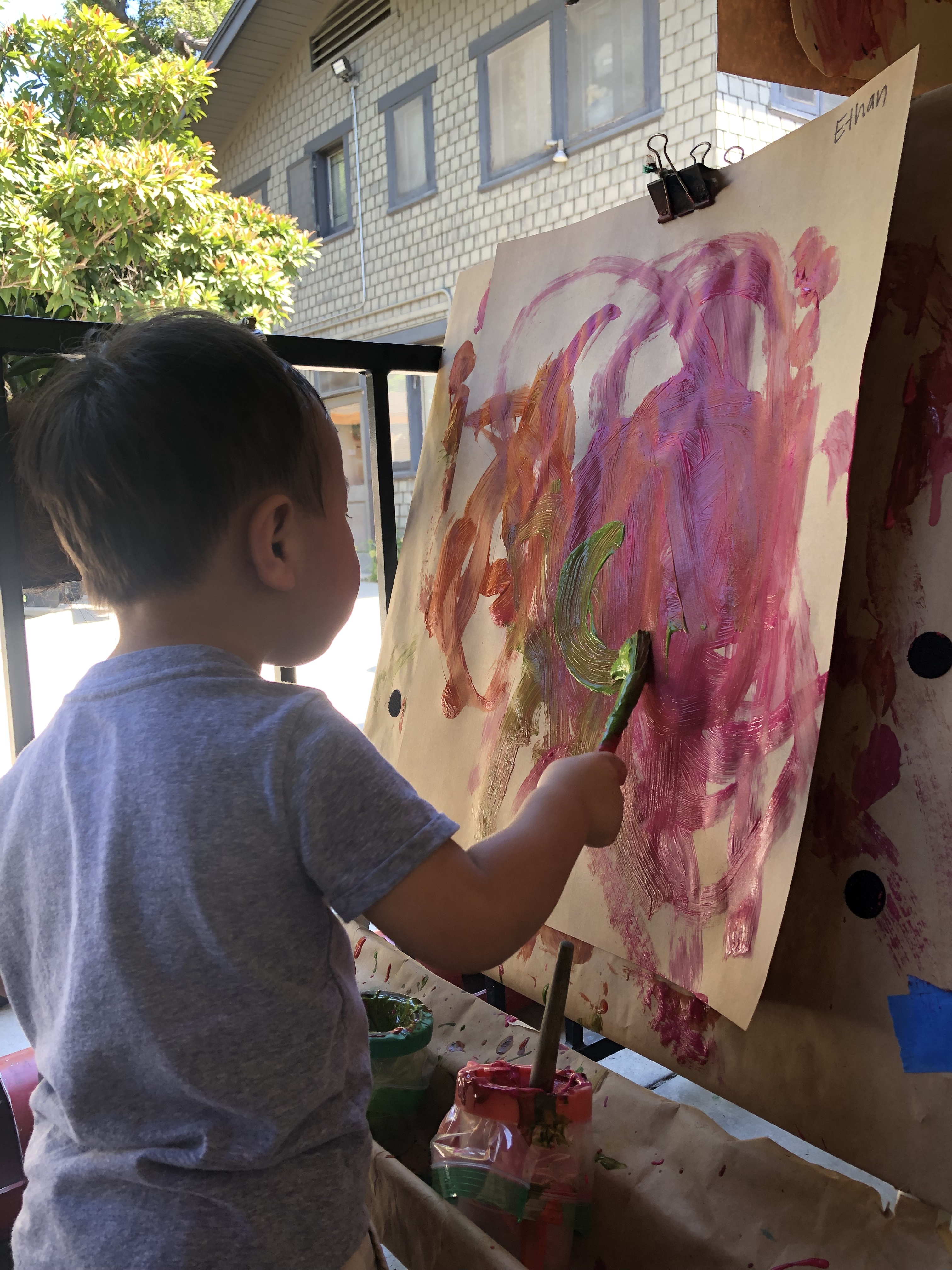 You’ll commonly see art alternate between table art and easel art on the patio. This intentionally engages a different set of muscles. The easel is a fantastic medium for our little ones! It allows them to take a step back and see their creation from a different perspective or physically lean in to their art.