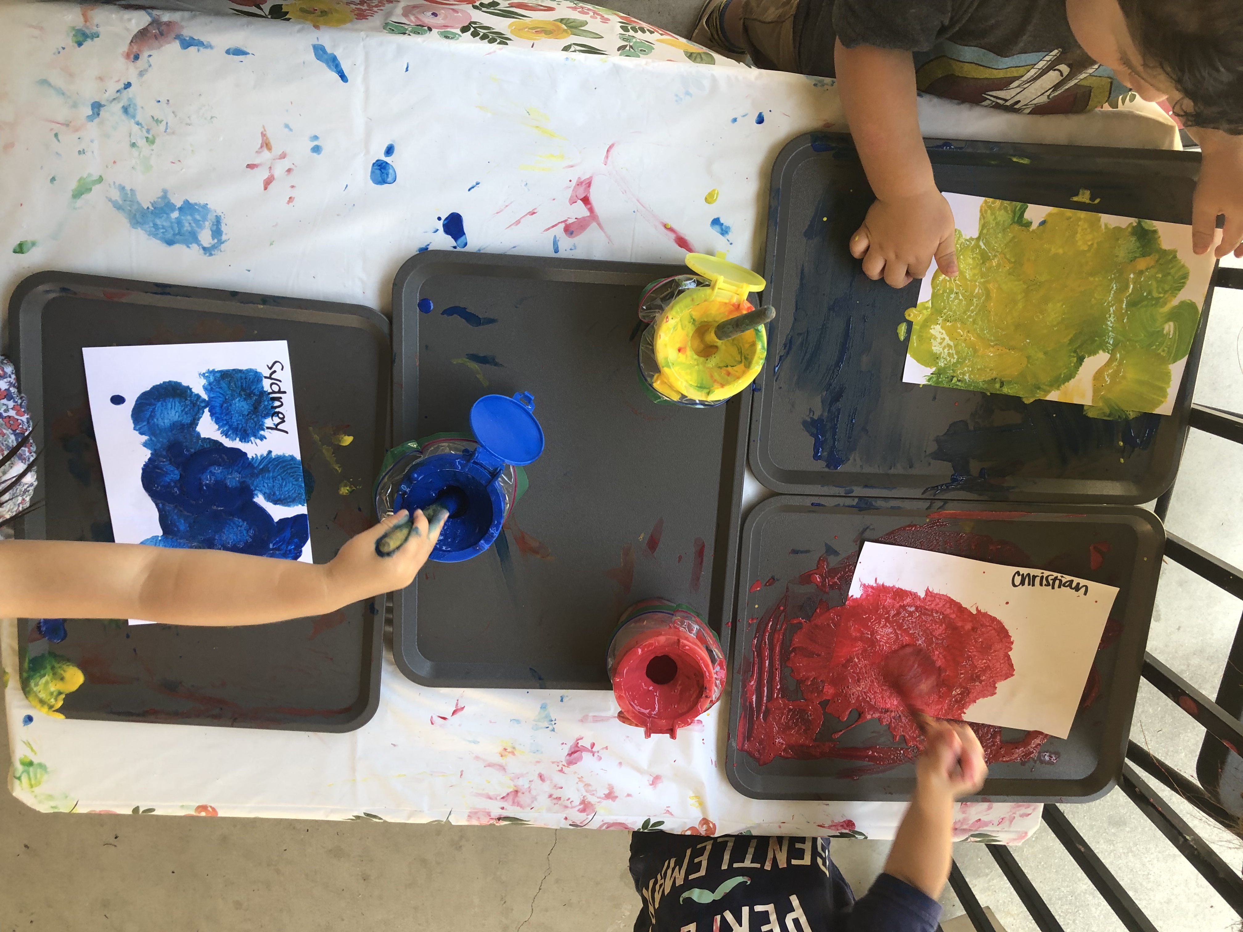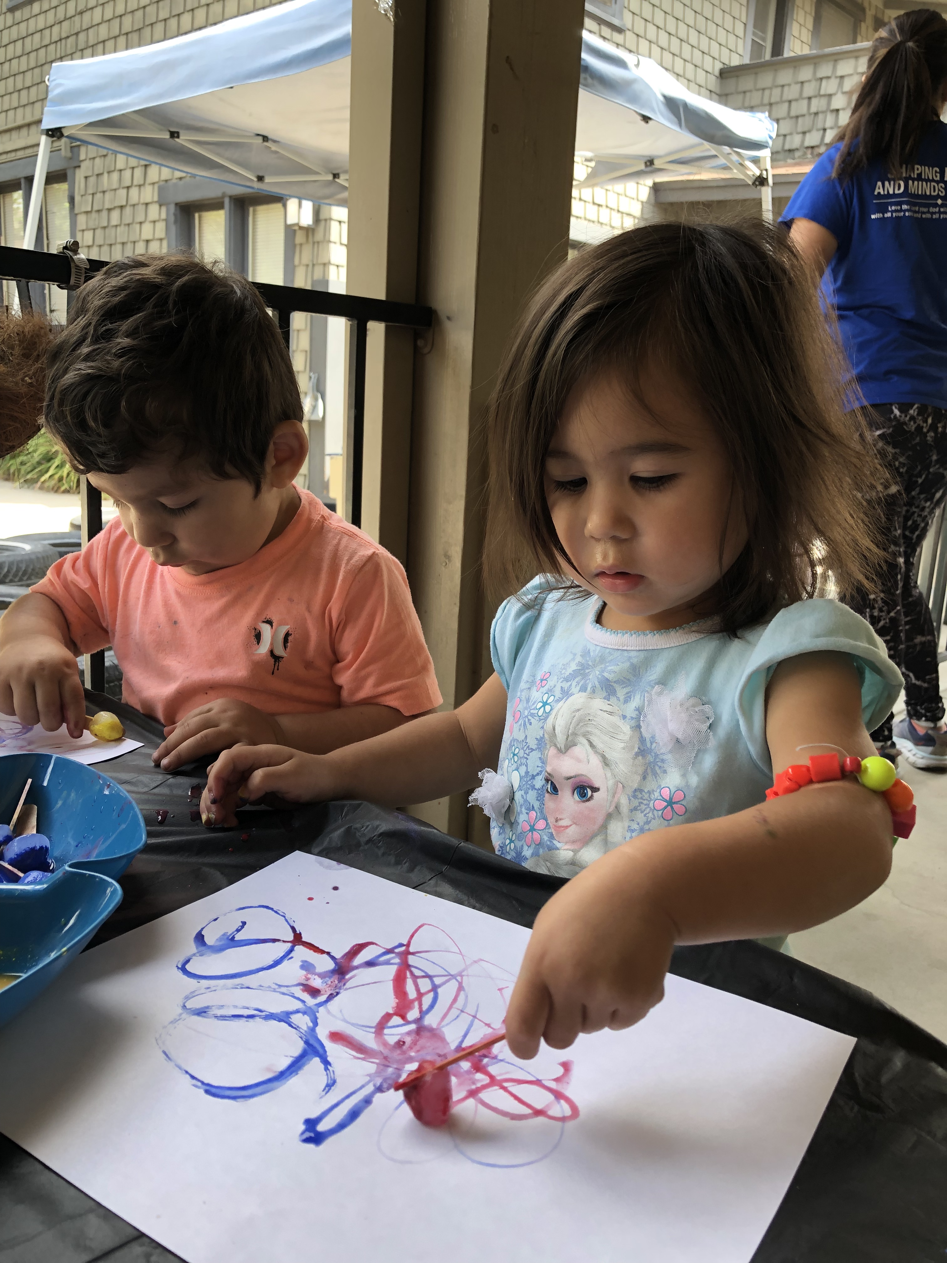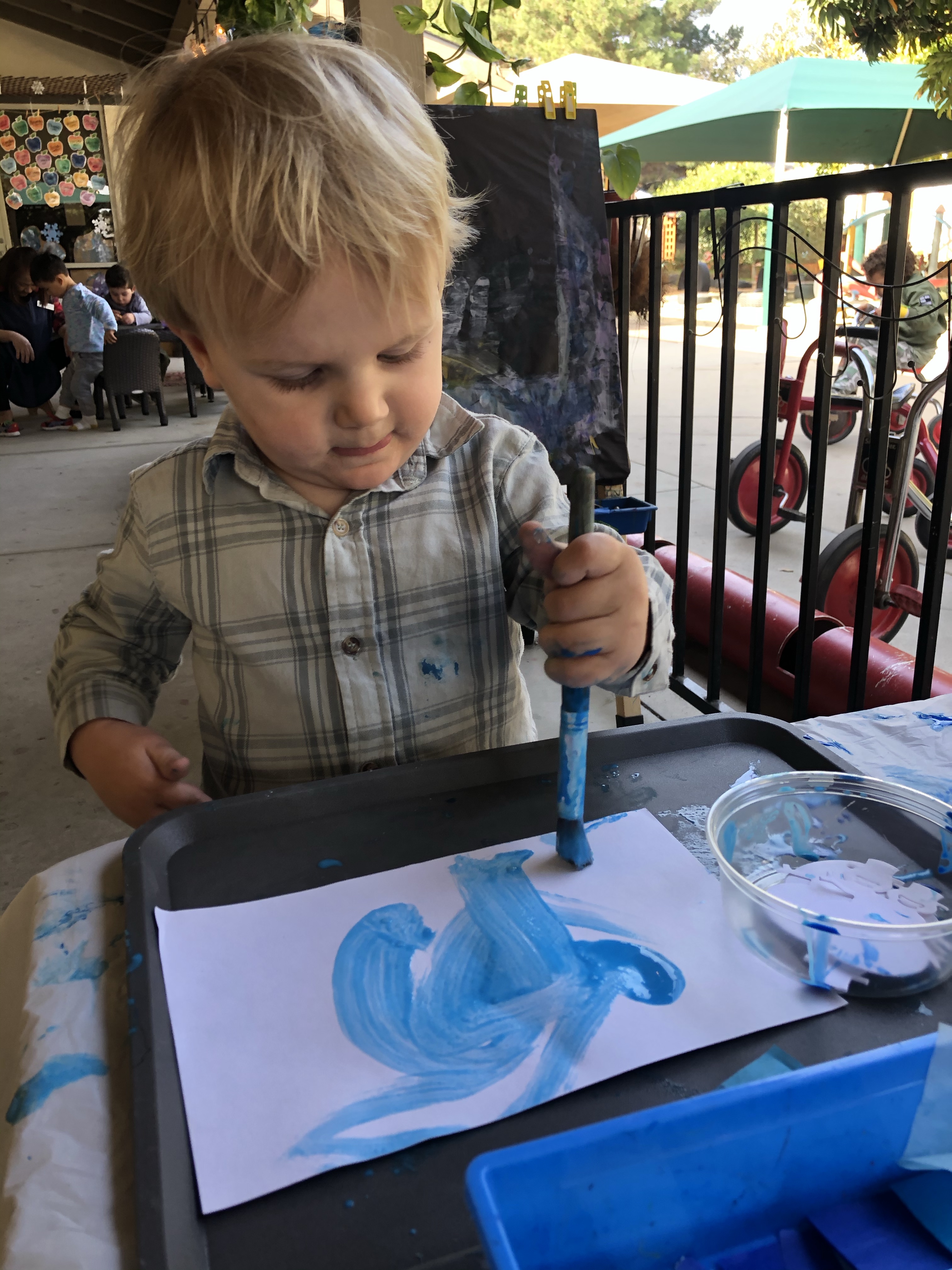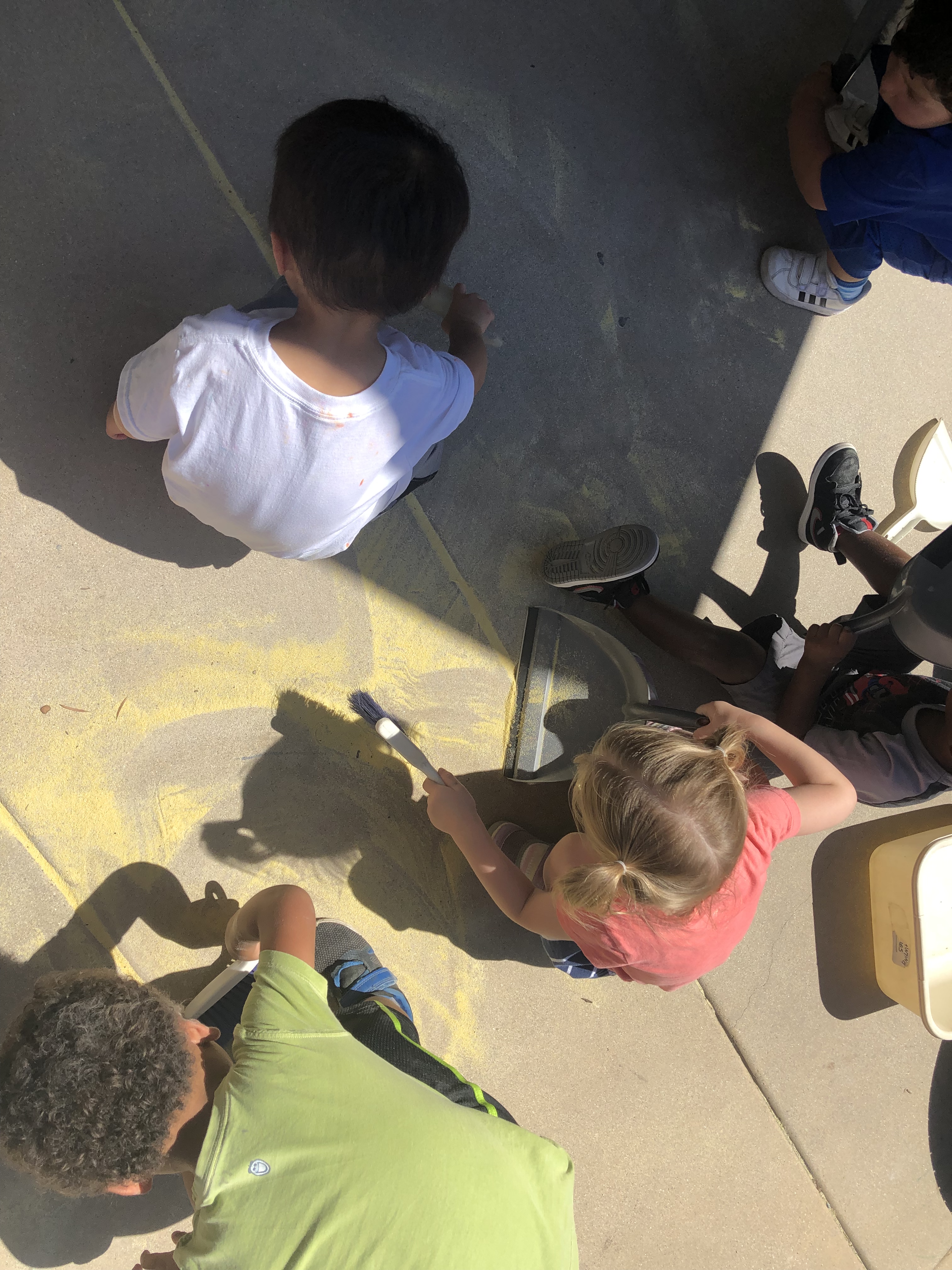 You’ll commonly see art alternate between table art and easel art on the patio. This intentionally engages a different set of muscles. The easel is a fantastic medium for our little ones! It allows them to take a step back and see their creation from a different perspective or physically lean in to their art.